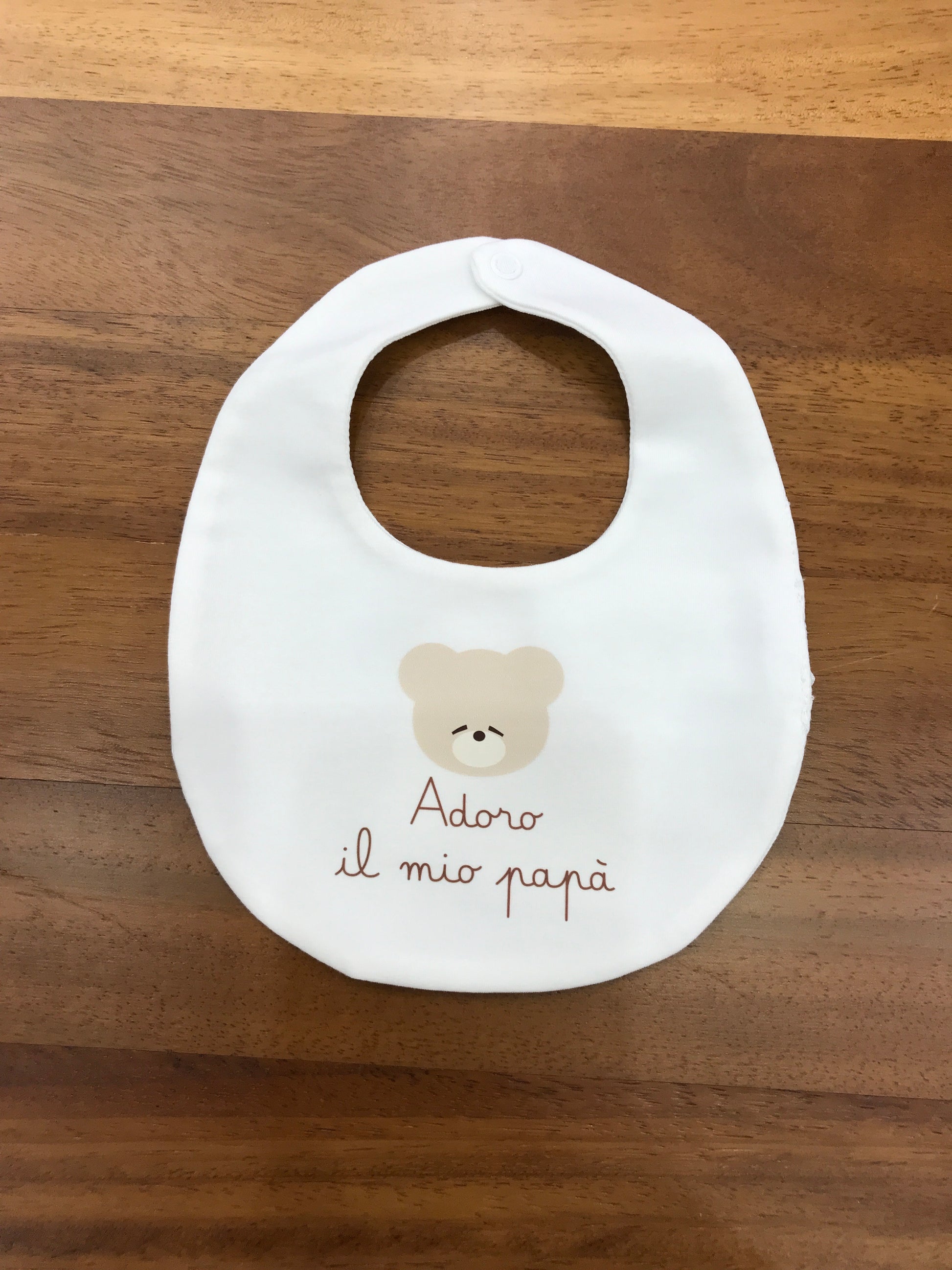 Questo bavaglino è realizzato in morbido cotone e presenta una forma rotonda che garantisce comodità e una vestibilità ottimale. Sul davanti si distingue un delicato orsetto che aggiunge un tocco di dolcezza, accompagnato dalla scritta "adoro il mio papà" che dona un carattere unico e speciale al capo. Ideale per proteggere i più piccoli durante i pasti con stile e praticità.