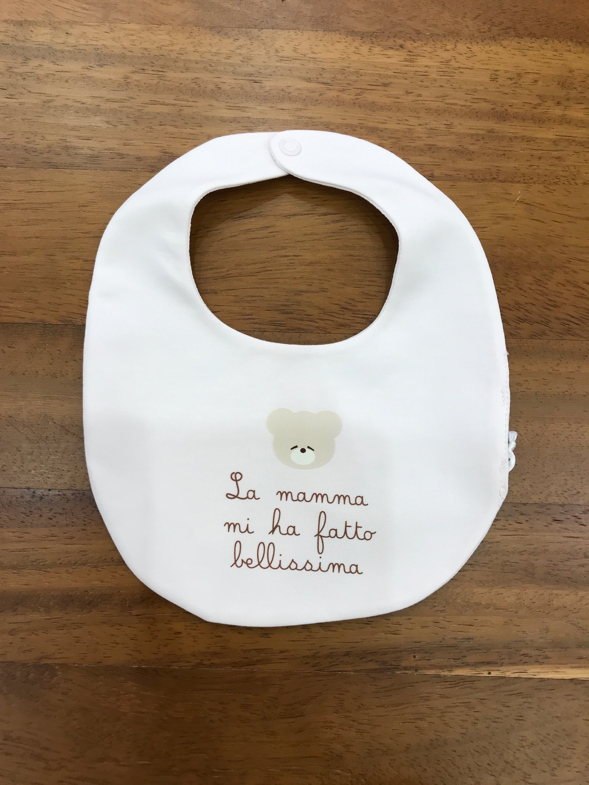 Questo bavaglino è realizzato in morbido cotone e presenta una forma rotonda che garantisce comodità e una vestibilità ottimale. Sul davanti si distingue un delicato orsetto che aggiunge un tocco di dolcezza, accompagnato dalla scritta "la mamma mi ha fatto bellissima" che dona un carattere unico e speciale al capo. Ideale per proteggere i più piccoli durante i pasti con stile e praticità.