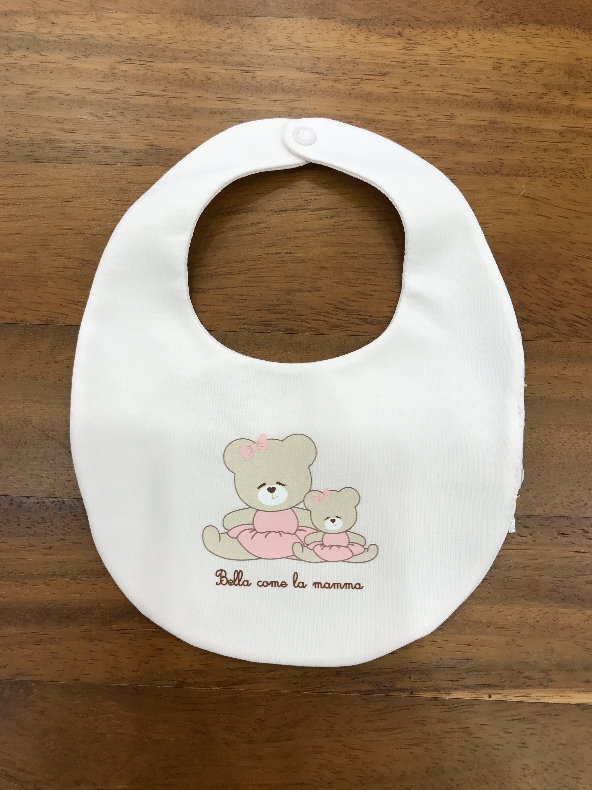 Questo bavaglino è realizzato in morbido cotone e presenta una forma rotonda che garantisce comodità e una vestibilità ottimale. Sul davanti si distingue un delicato orsetto che aggiunge un tocco di dolcezza, accompagnato dalla scritta "bella come la mamma" che dona un carattere unico e speciale al capo. Ideale per proteggere i più piccoli durante i pasti con stile e praticità.