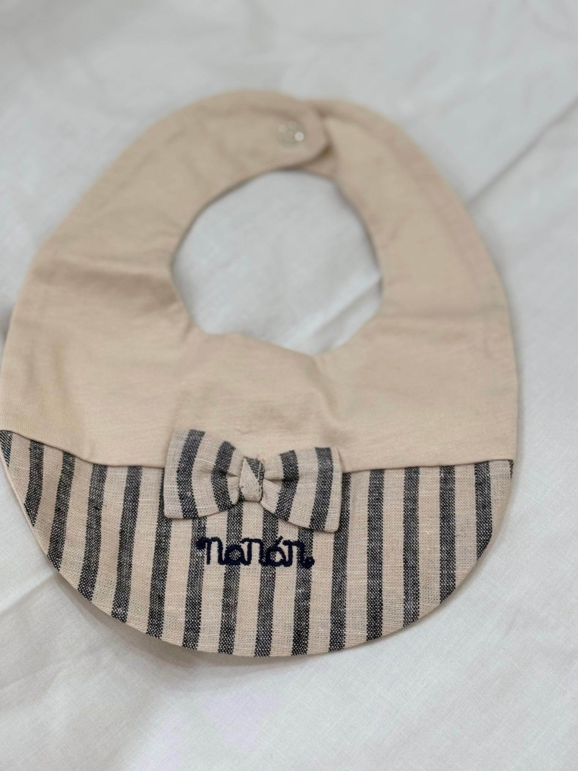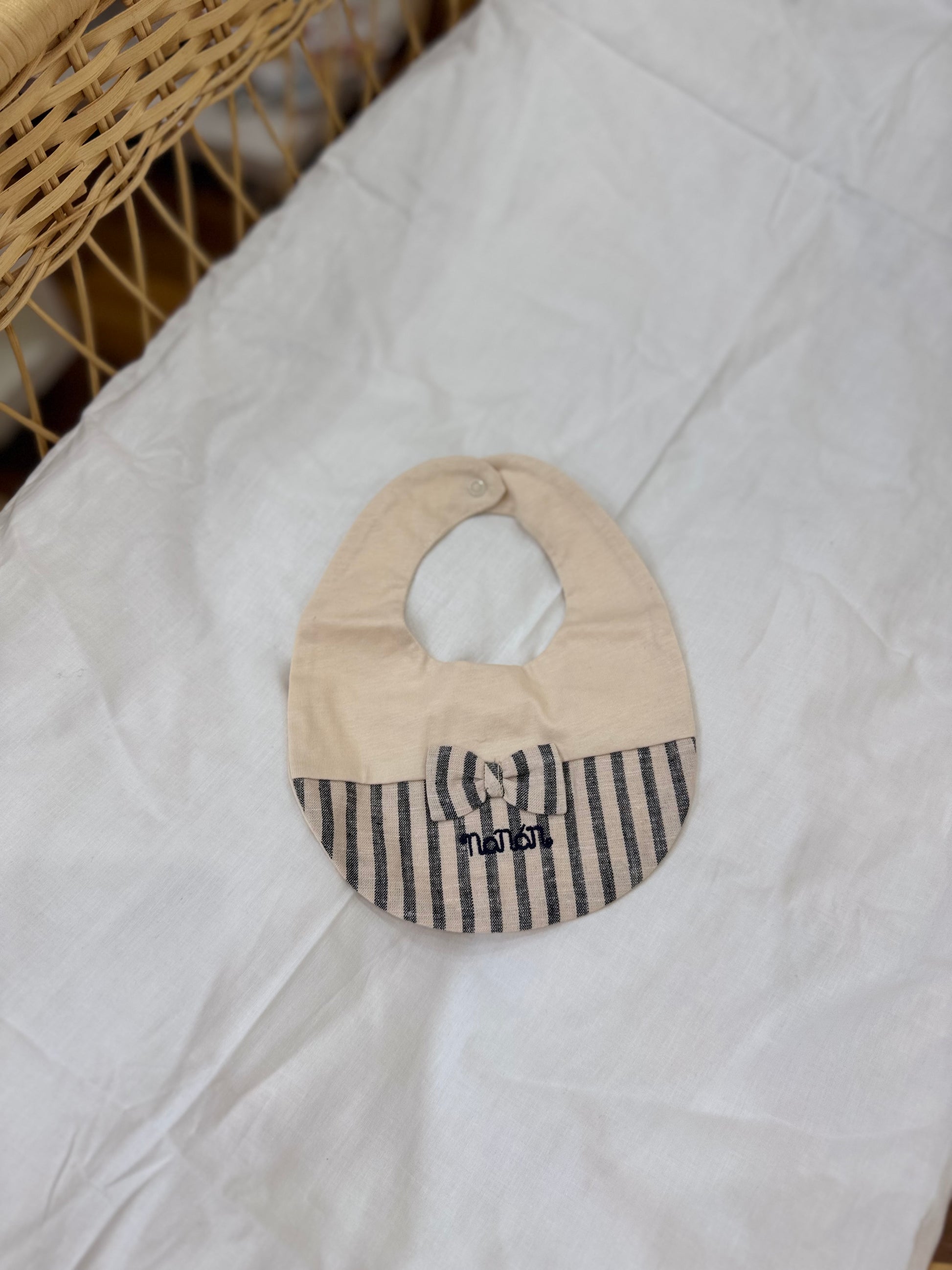 Scopri la nostra Bavetta Nanan, realizzata in morbido cotone beige con eleganti dettagli in lino e un delizioso fiocchetto. Perfetta per proteggere il tuo bambino durante i pasti, mentre aggiunge un tocco di stile al suo outfit. Comoda e raffinata, un must-have per ogni neo -mamma