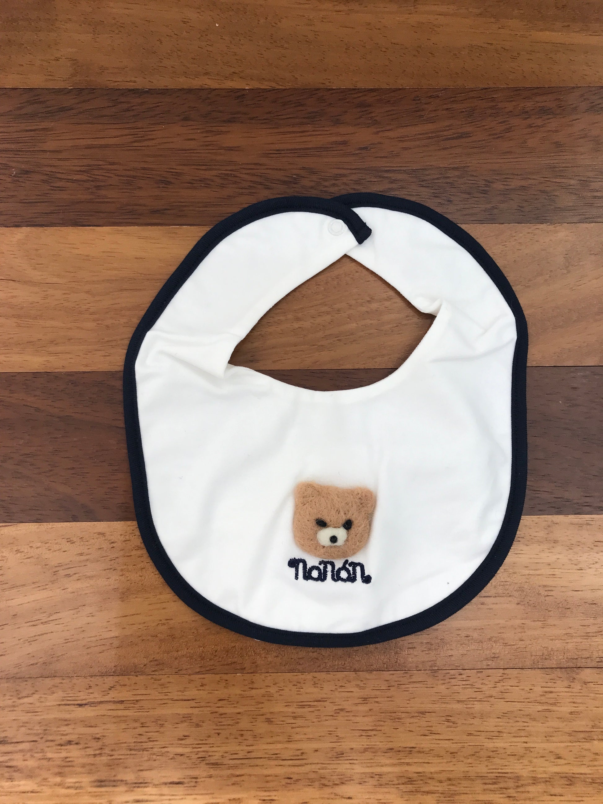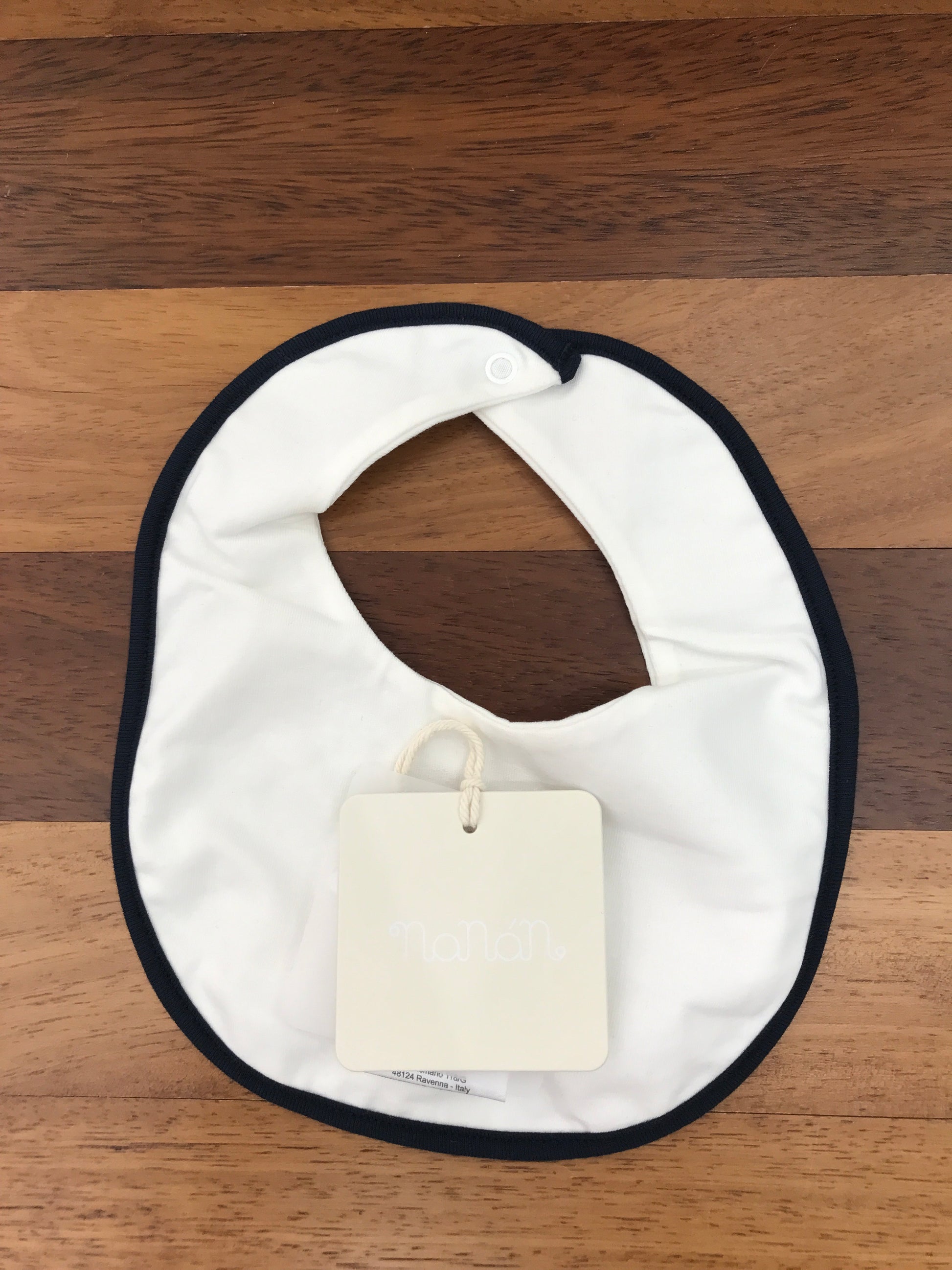 Bavaglino realizzato in cotone puro, caratterizzato da una raffinata finitura con bordo blu navy. Il capo presenta un delicato orsetto in rilievo sul fronte, elemento decorativo che lo rende particolarmente apprezzato per le occasioni speciali. La struttura in cotone garantisce morbidezza e traspirabilità, ideale per la pelle delicata dei più piccoli.