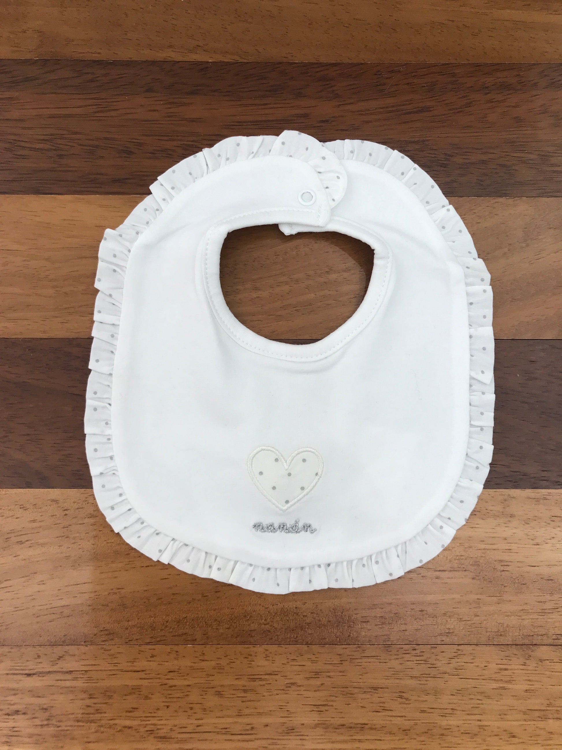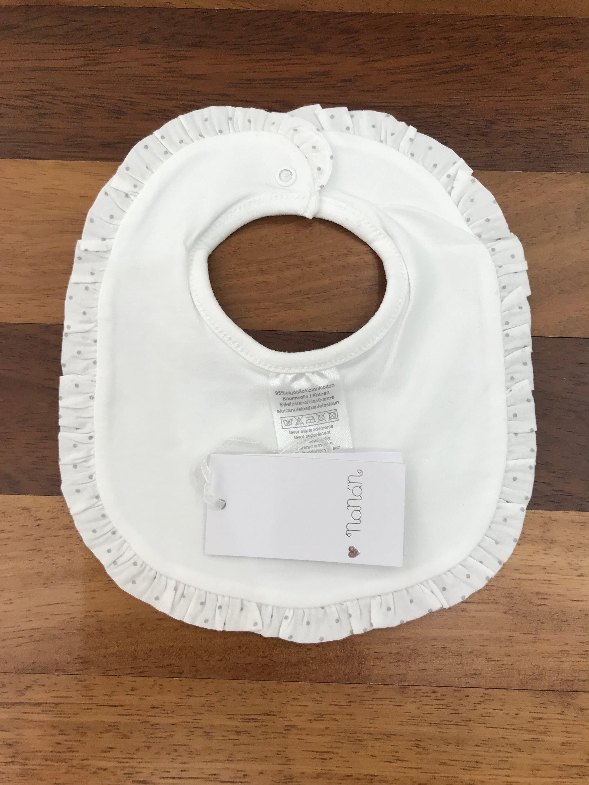 Elegante bavaglino realizzato in puro cotone, caratterizzato da un raffinato design bianco e grigio. Dettagli a pois grigio decorano la superficie, mentre delicate rusche ornano tutto il perimetro, conferendo un tocco di sofisticatezza. Ideale per proteggere gli abiti del bambino durante i pasti, unendo praticità e stile con materiali di qualità.