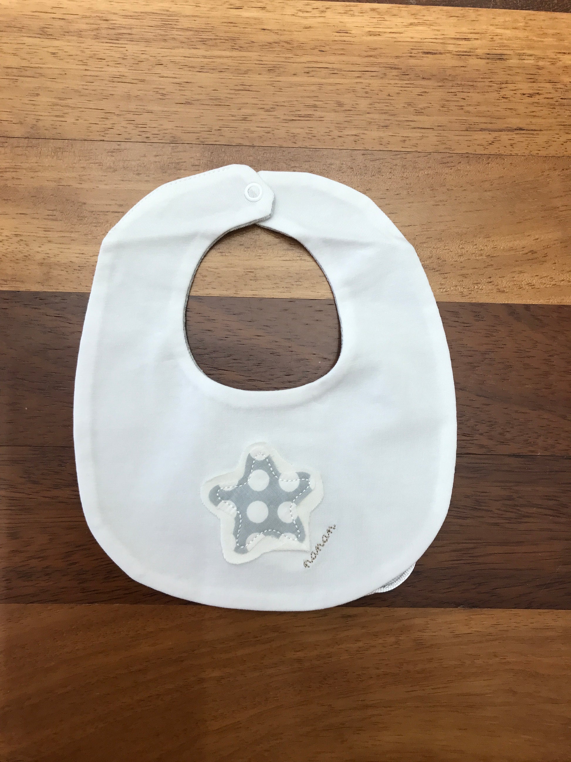 Elegante bavaglino realizzato in puro cotone, caratterizzato da una sofisticata combinazione di tonalità grigie e bianche. La stella in rilievo che decora il fronte aggiunge un tocco di raffinatezza al design, rendendolo un accessorio versatile e pratico per l'infanzia. Ideale per proteggere gli indumenti durante i pasti, unisce funzionalità e stile con materiali di qualità.
