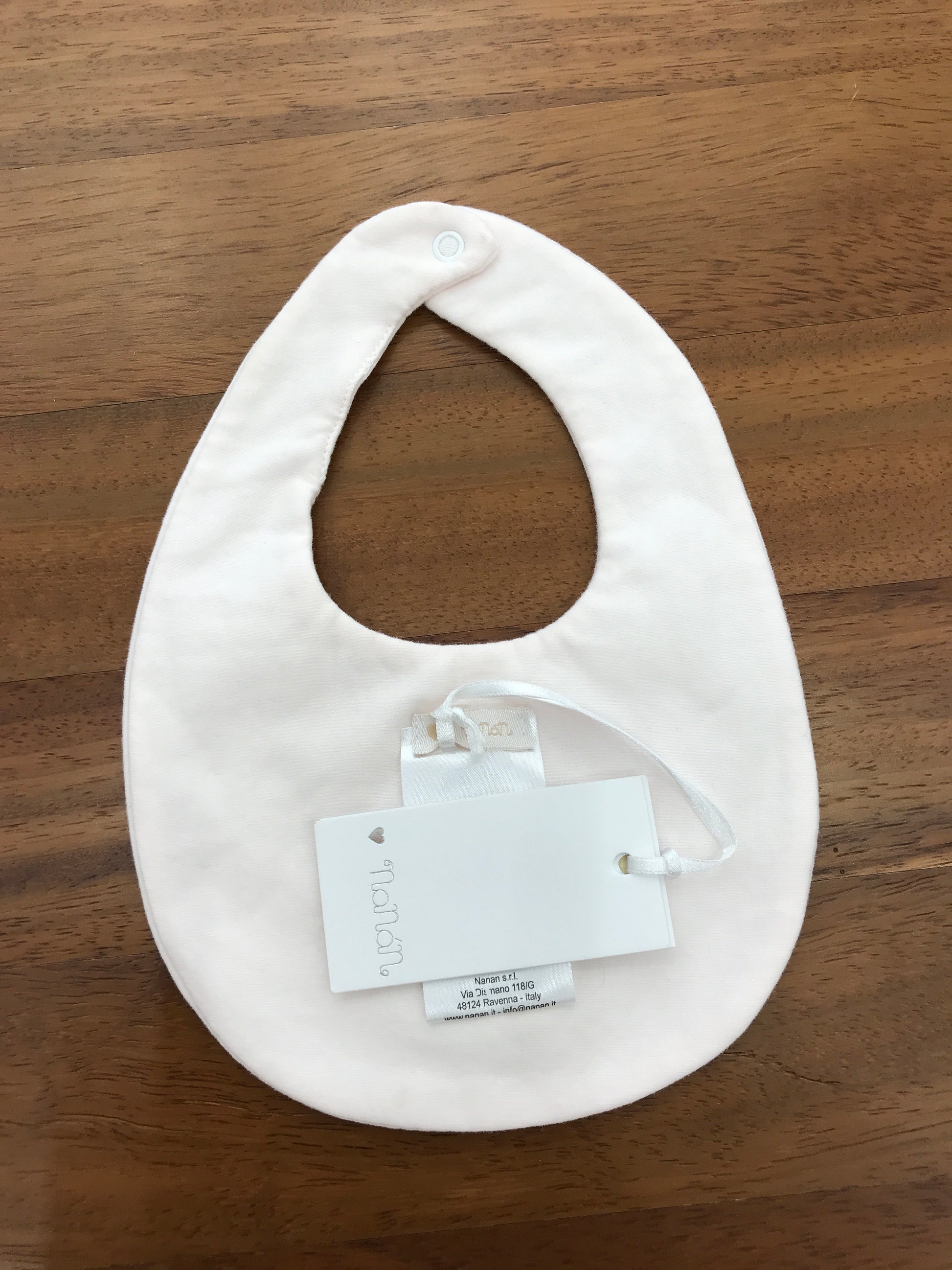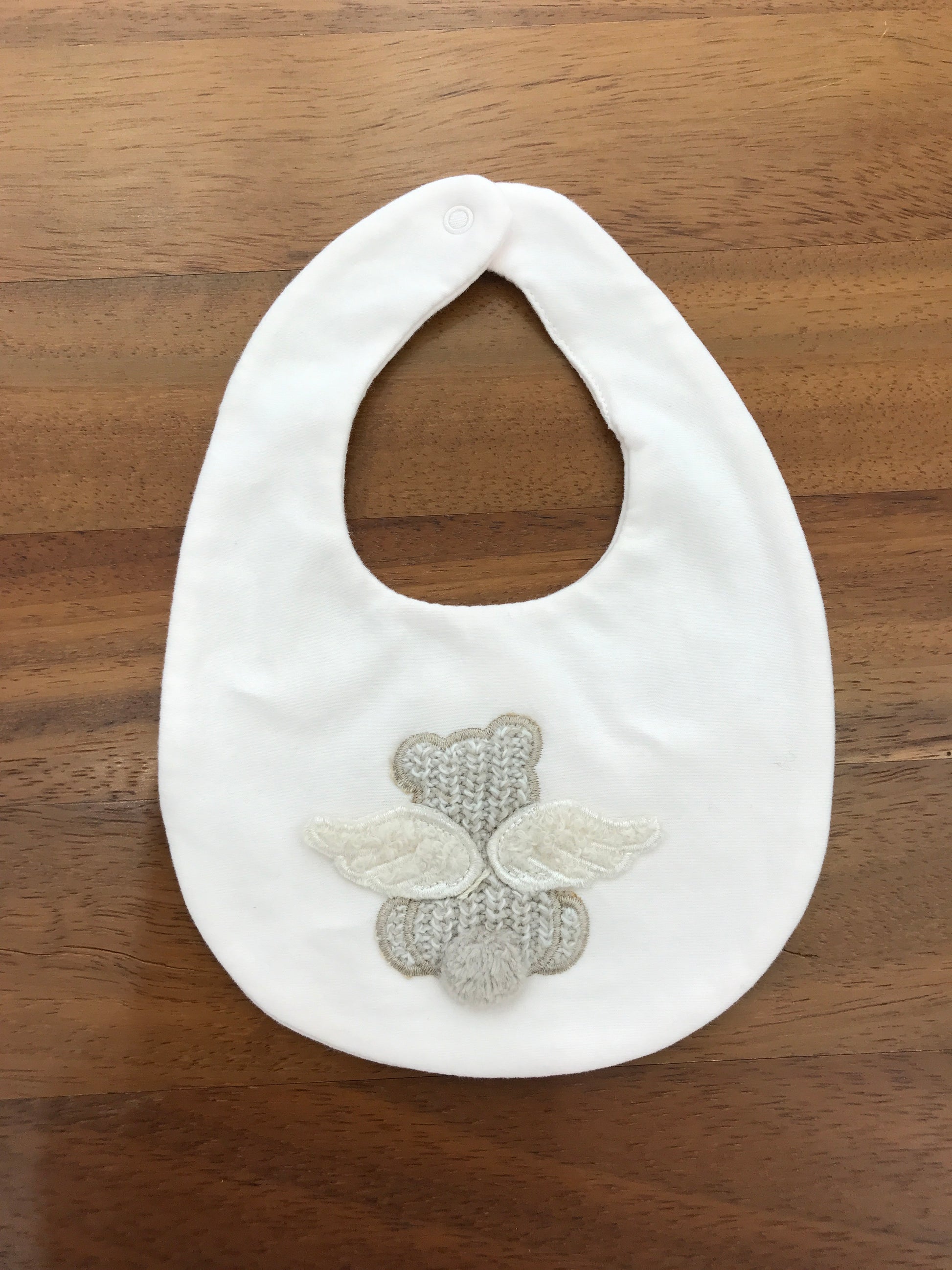 La bavetta realizzata in morbida ciniglia è dotata di una pratica chiusura con bottoni, che garantisce una vestibilità sicura e comoda. Al centro, spicca un adorabile orsetto caratterizzato da piccole ali, che aggiunge un tocco di dolcezza e originalità al capo.
