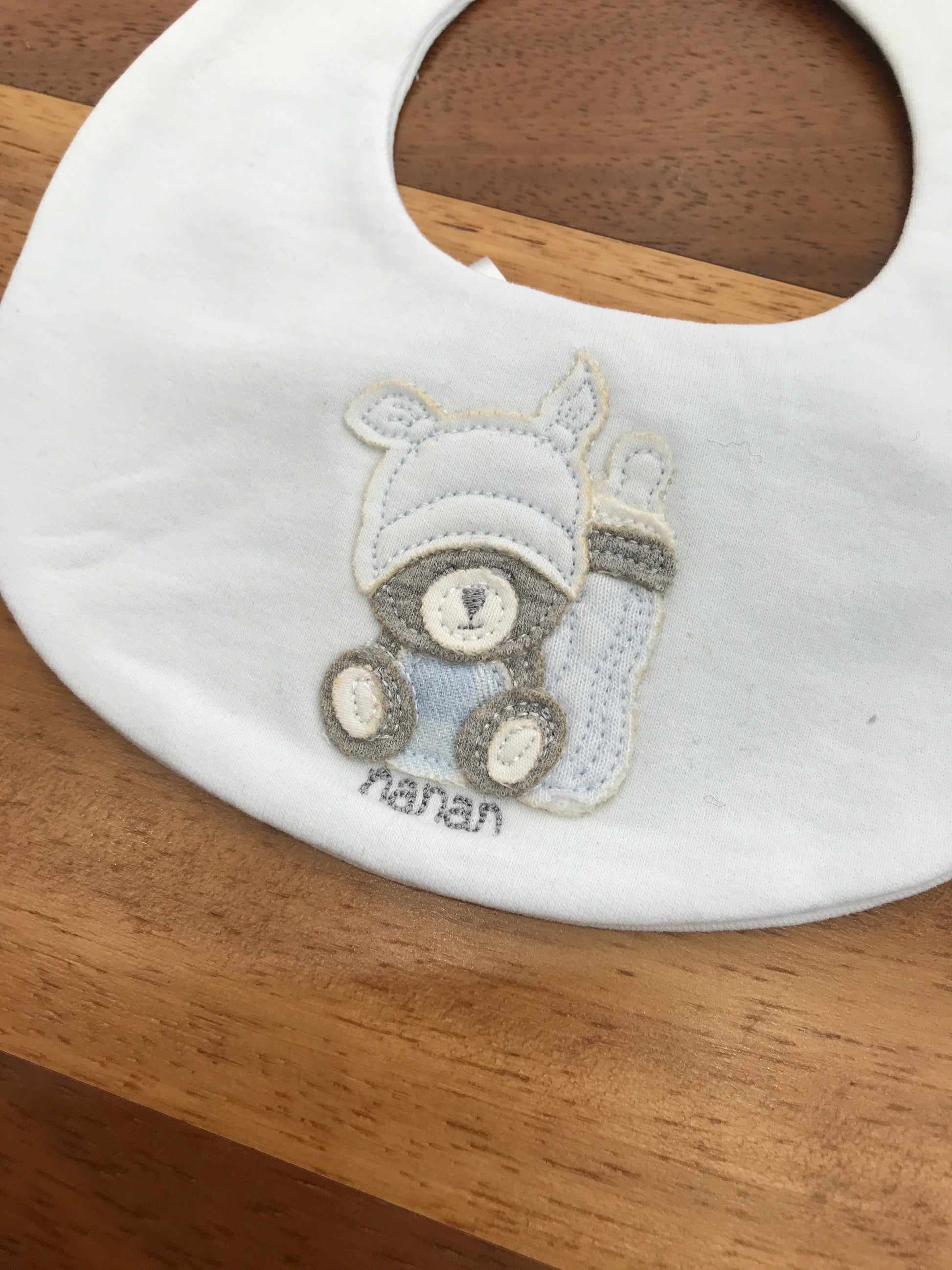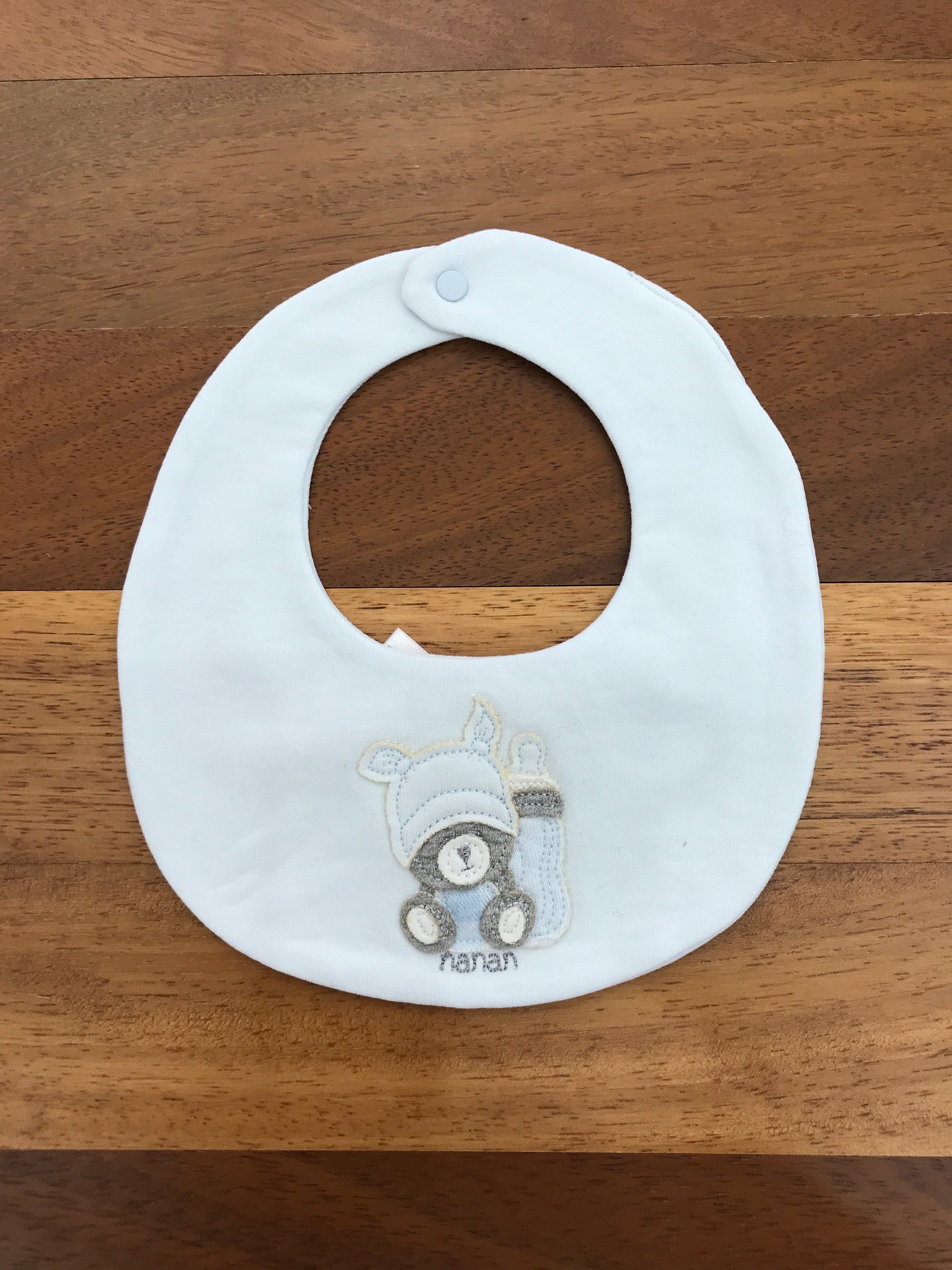 Bavetta realizzata in puro cotone di qualità, caratterizzata da una tonalità celeste delicata. Presenta un ricamo in rilievo sul fronte che raffigura un tenero orsetto accompagnato da un biberon, dettaglio che la rende particolarmente affascinante per i più piccoli. Un accessorio pratico e raffinato per l'alimentazione del neonato.