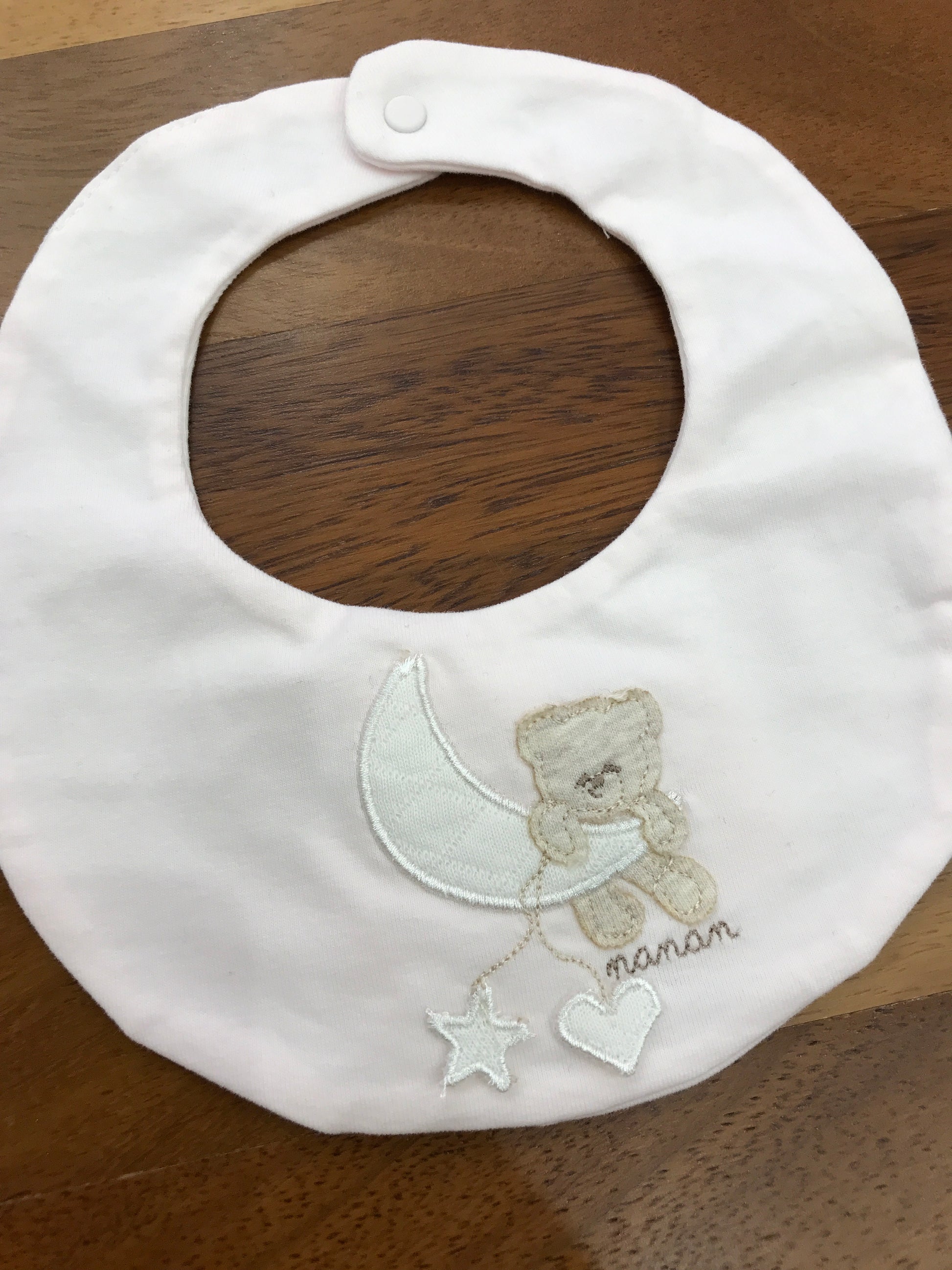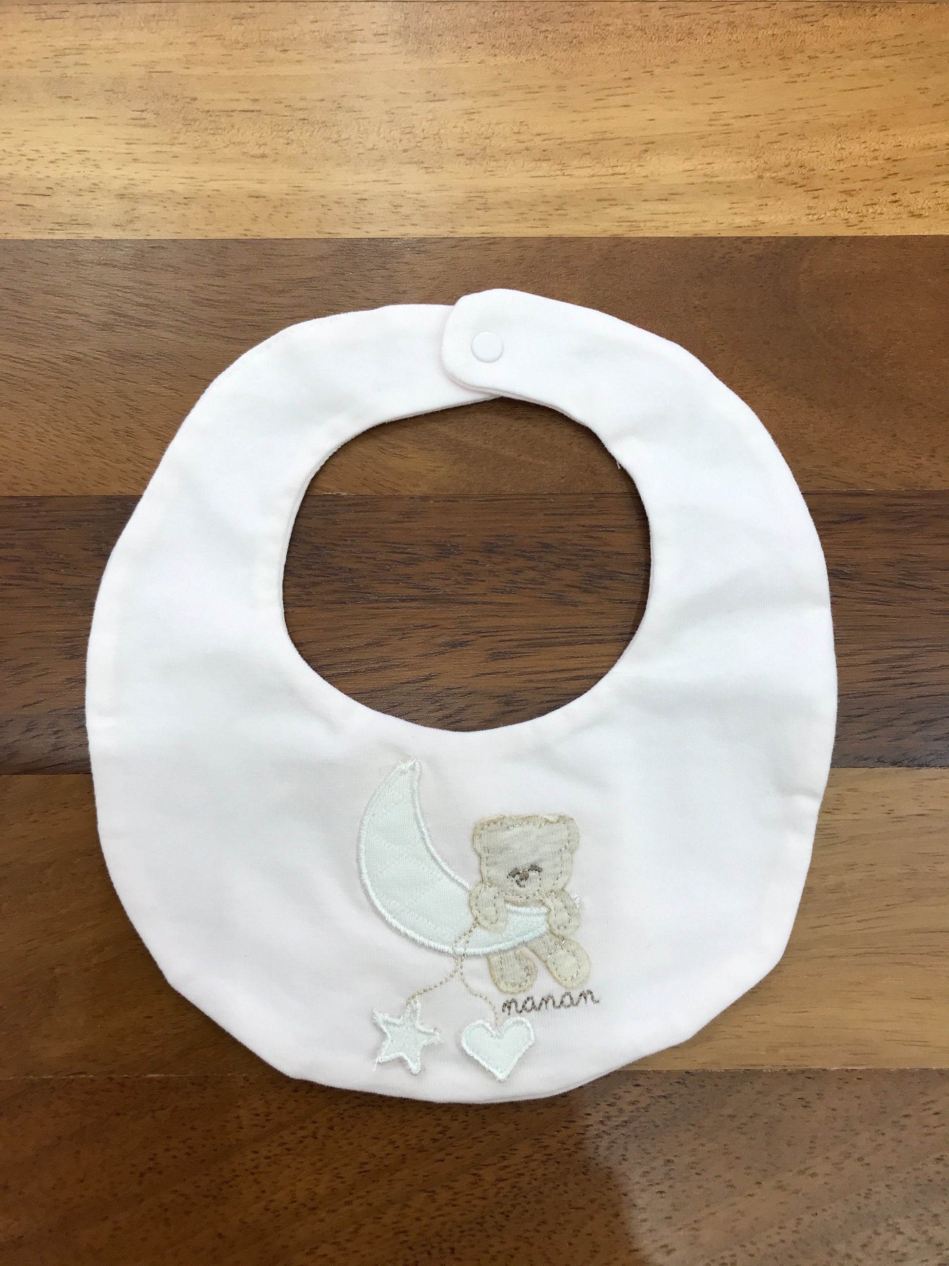 Questa bavetta ovale Nanan combina funzionalità e design delicato, perfetta per proteggere i vestiti del tuo bambino durante i pasti. Dotata di una pratica chiusura a clip, garantisce una facile applicazione e una tenuta sicura. Il dolce orsetto rappresentato sulla luna aggiunge un tocco di tenerezza, rendendola ideale anche come regalo raffinato per neogenitori attenti alla qualità. Realizzata con materiali selezionati, assicura comfort e durata.