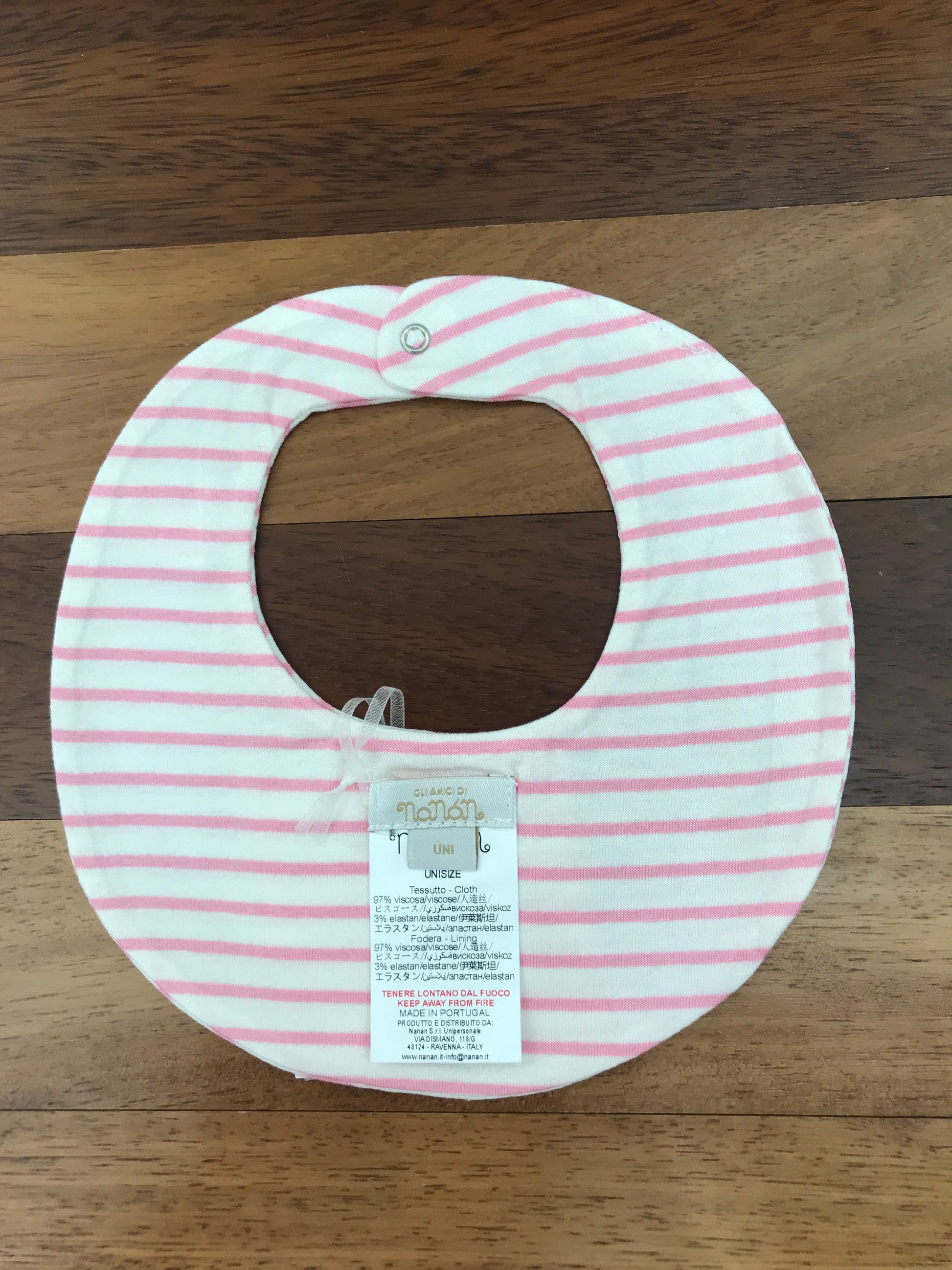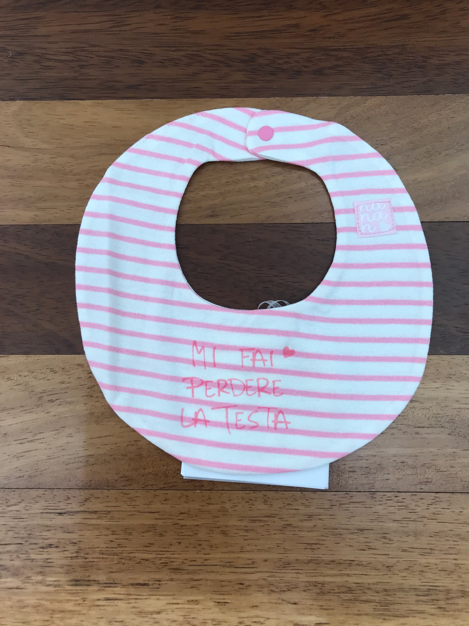 Elegante bavetta in puro cotone caratterizzata da un raffinato motivo a righe bianche e rosa. La scritta "Mi fai perdere la testa" stampata sul fronte aggiunge un tocco di personalità e tenerezza. Ideale per proteggere gli abiti del bambino durante i pasti, combina praticità e stile con una composizione in tessuto naturale, morbido e facile da lavare.