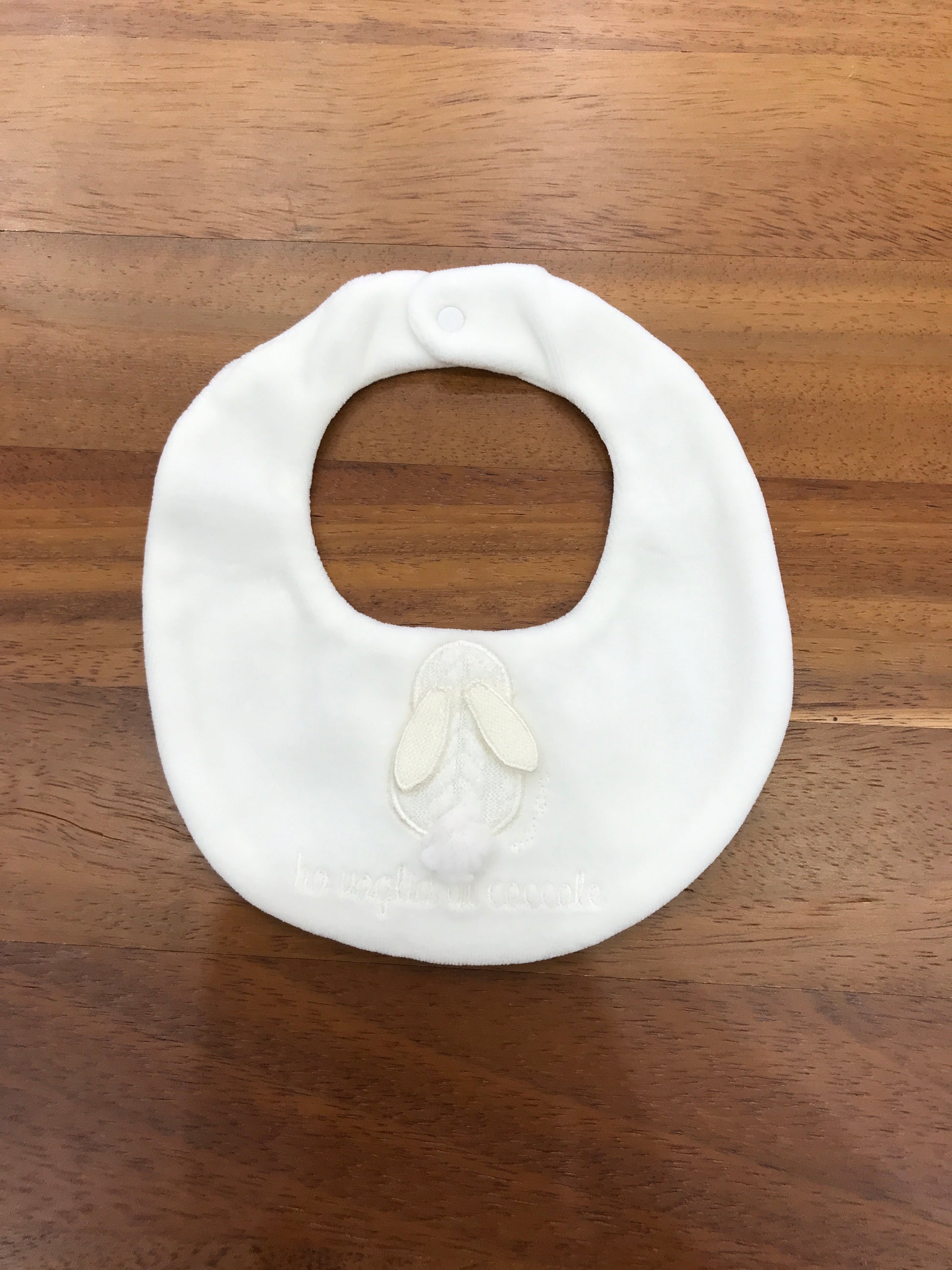 La bavetta realizzata in morbida ciniglia è dotata di una pratica chiusura con bottoni, che garantisce una vestibilità sicura e comoda. Al centro, spicca un adorabile coniglietto peloso, che aggiunge un tocco di dolcezza e originalità al capo.