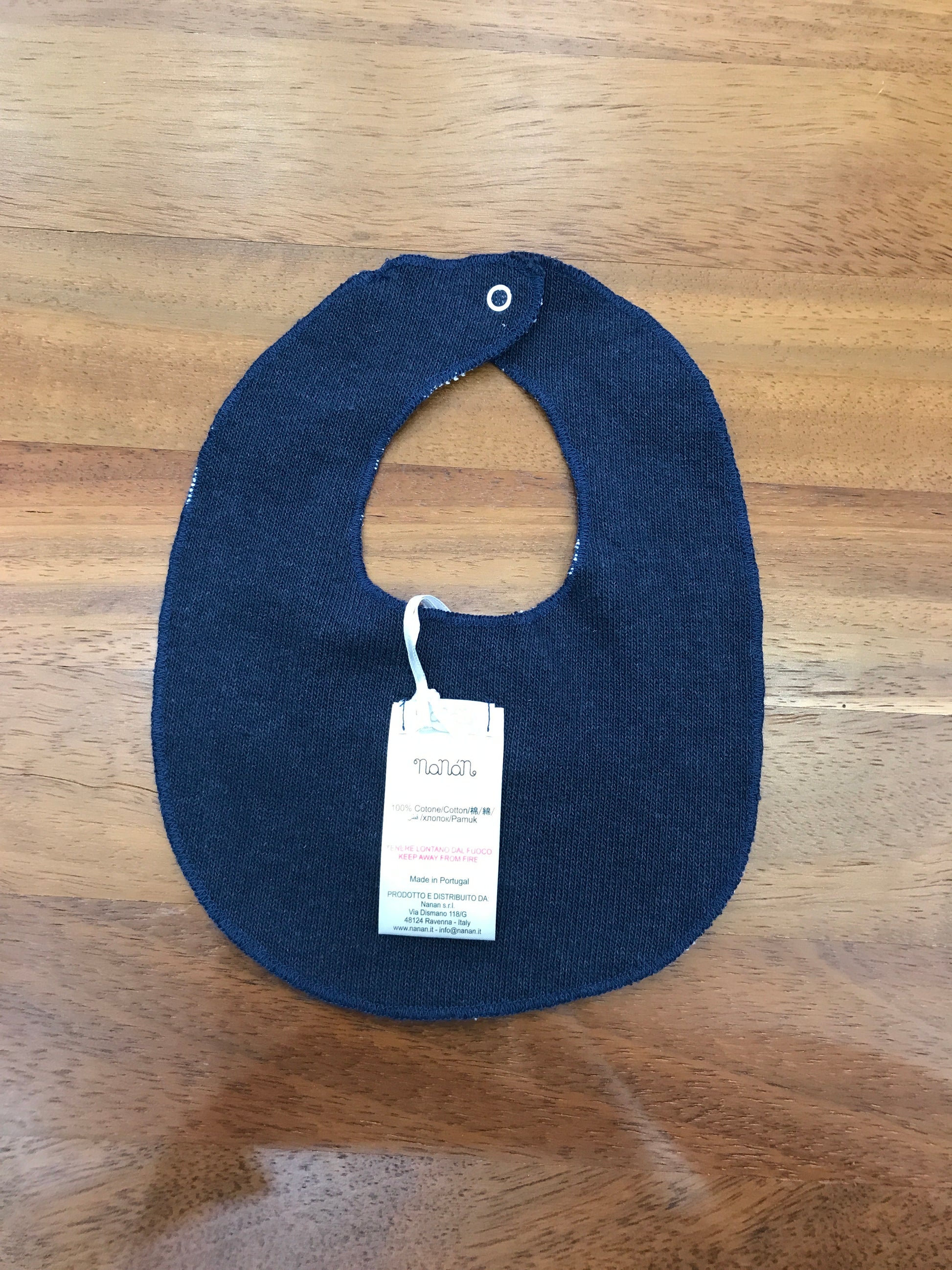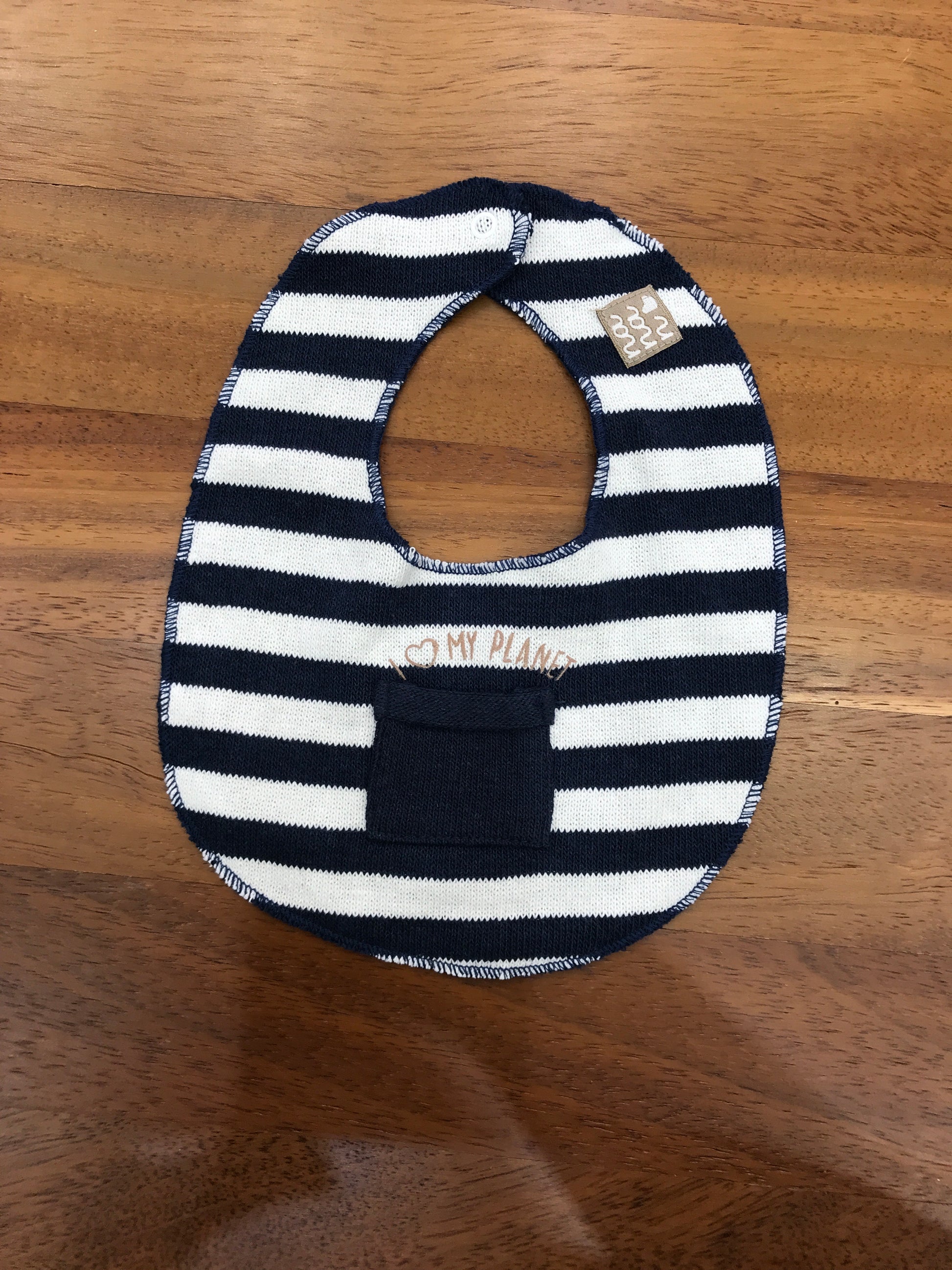 Questa bavetta in cotone, caratterizzata da eleganti righe bianche e blu, è arricchita da una piccola tasca frontale decorativa, arricchita da una delicata scritta ricamata, che aggiunge un tocco raffinato e distintivo al capo.