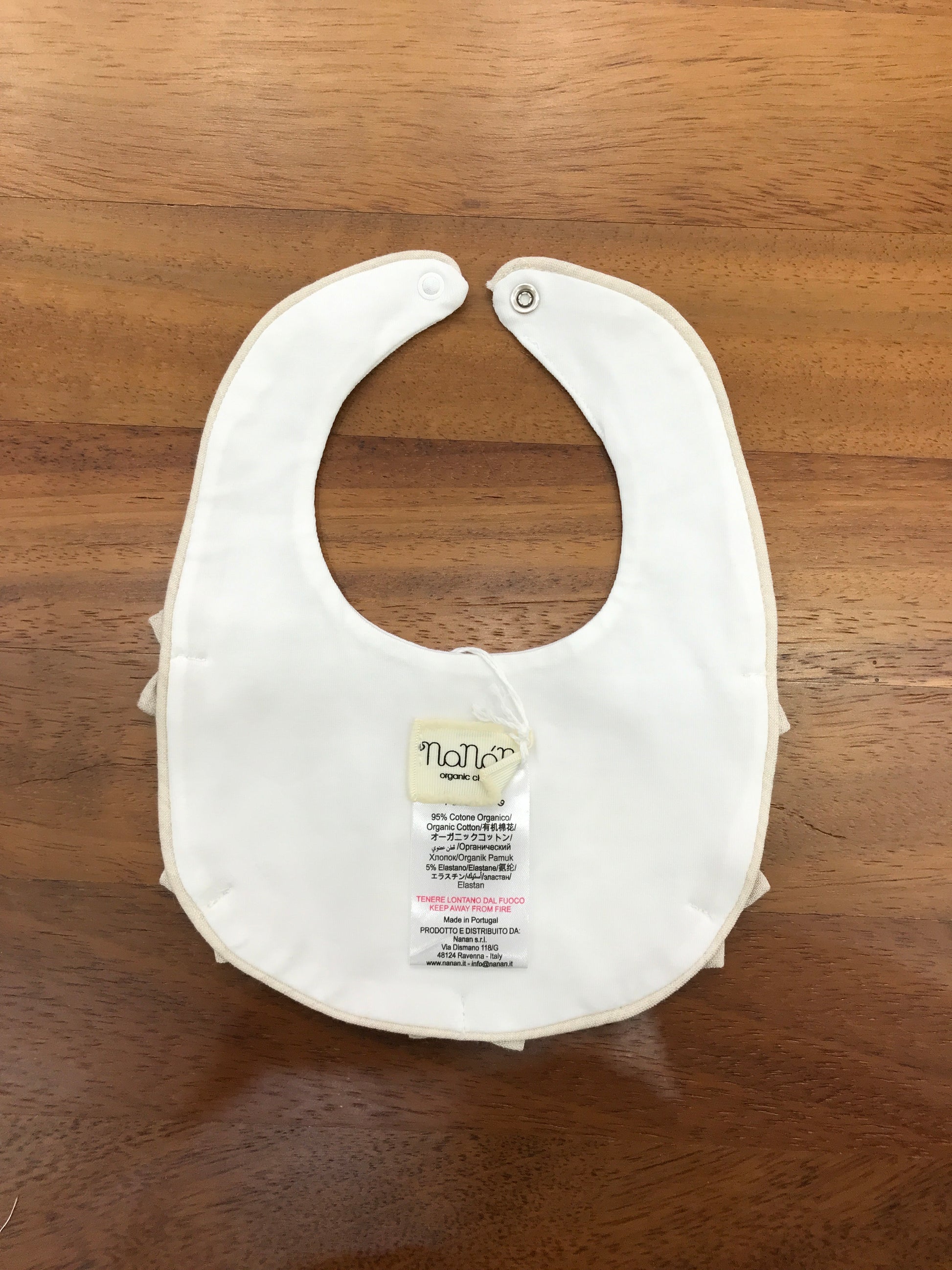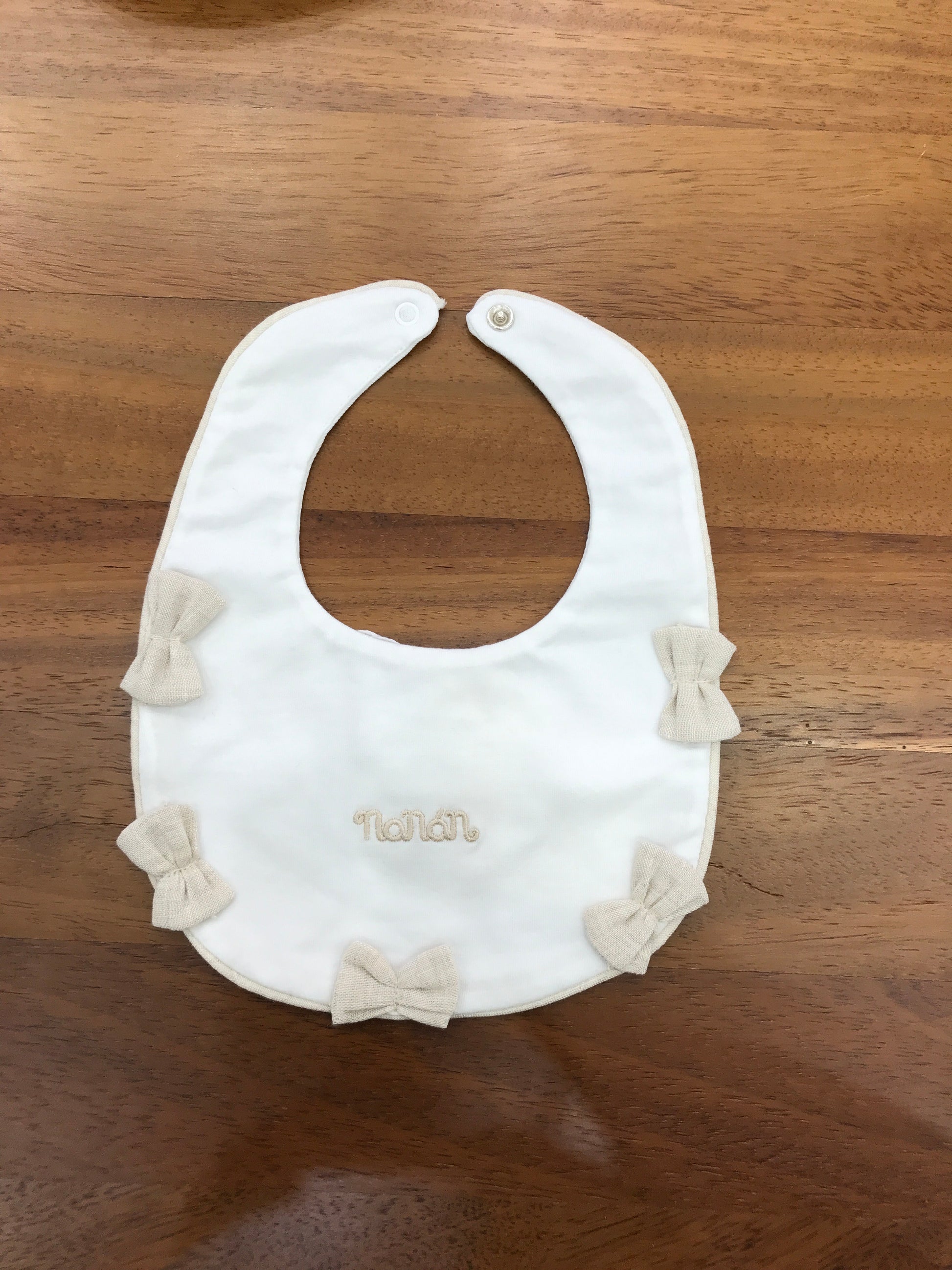 La bavetta rotonda realizzata in cotone si distingue per la sua morbidezza e comfort, impreziosita da piccoli fiocchetti beige applicati sul davanti, che aggiungono un tocco elegante e raffinato al design.