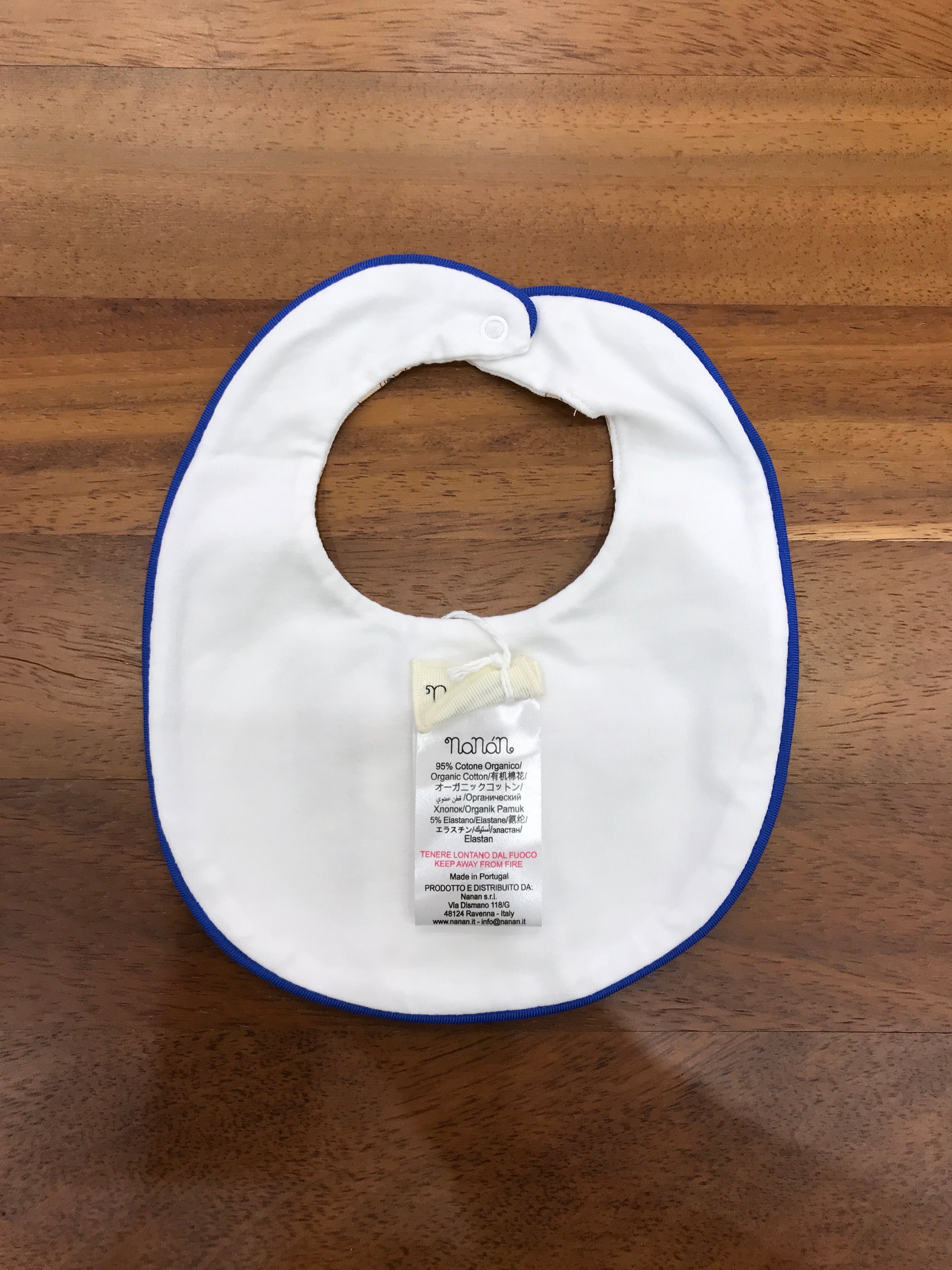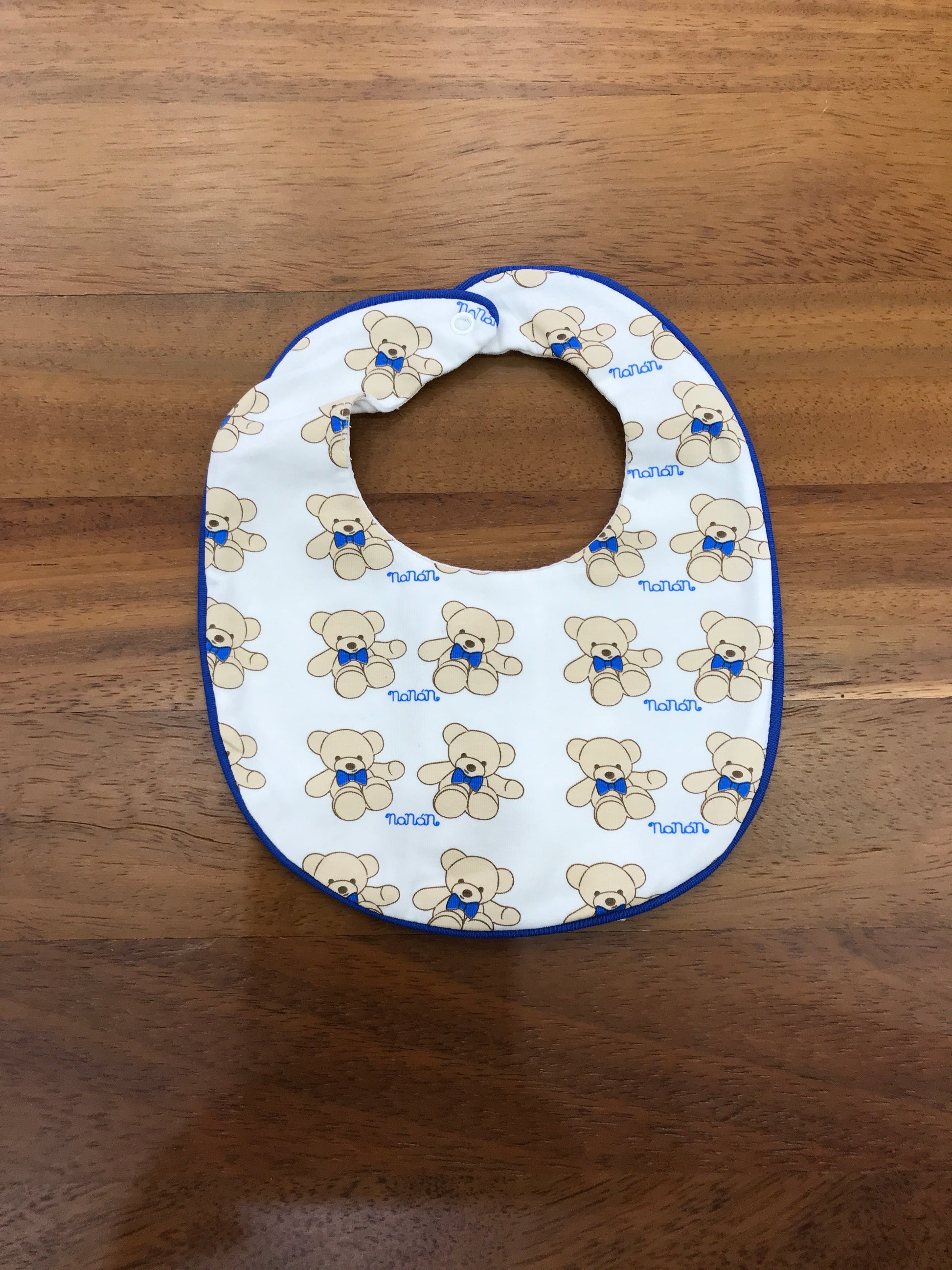 Bavaglino realizzato in cotone di alta qualità, caratterizzato da una base bianca elegante e impreziosito da una delicata decorazione di piccoli orsetti disegnati in sfumature di blu, che conferiscono un tocco raffinato e adatto a completare il guardaroba del tuo bambino con stile e comfort.
