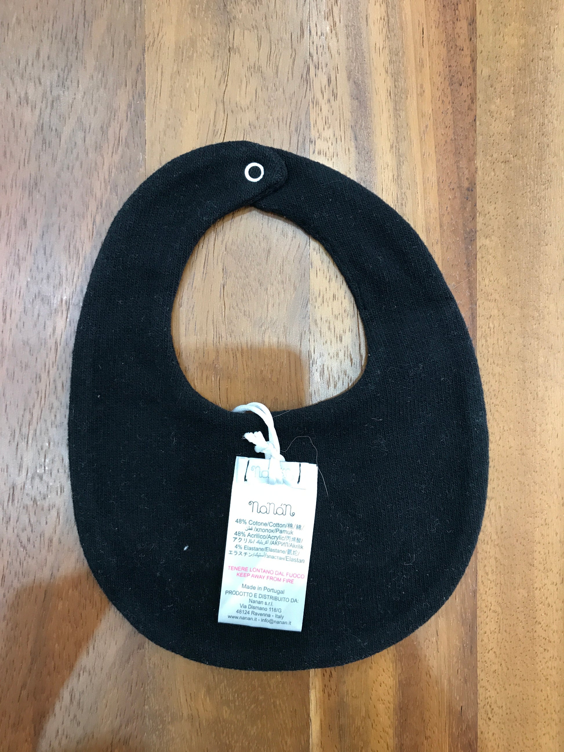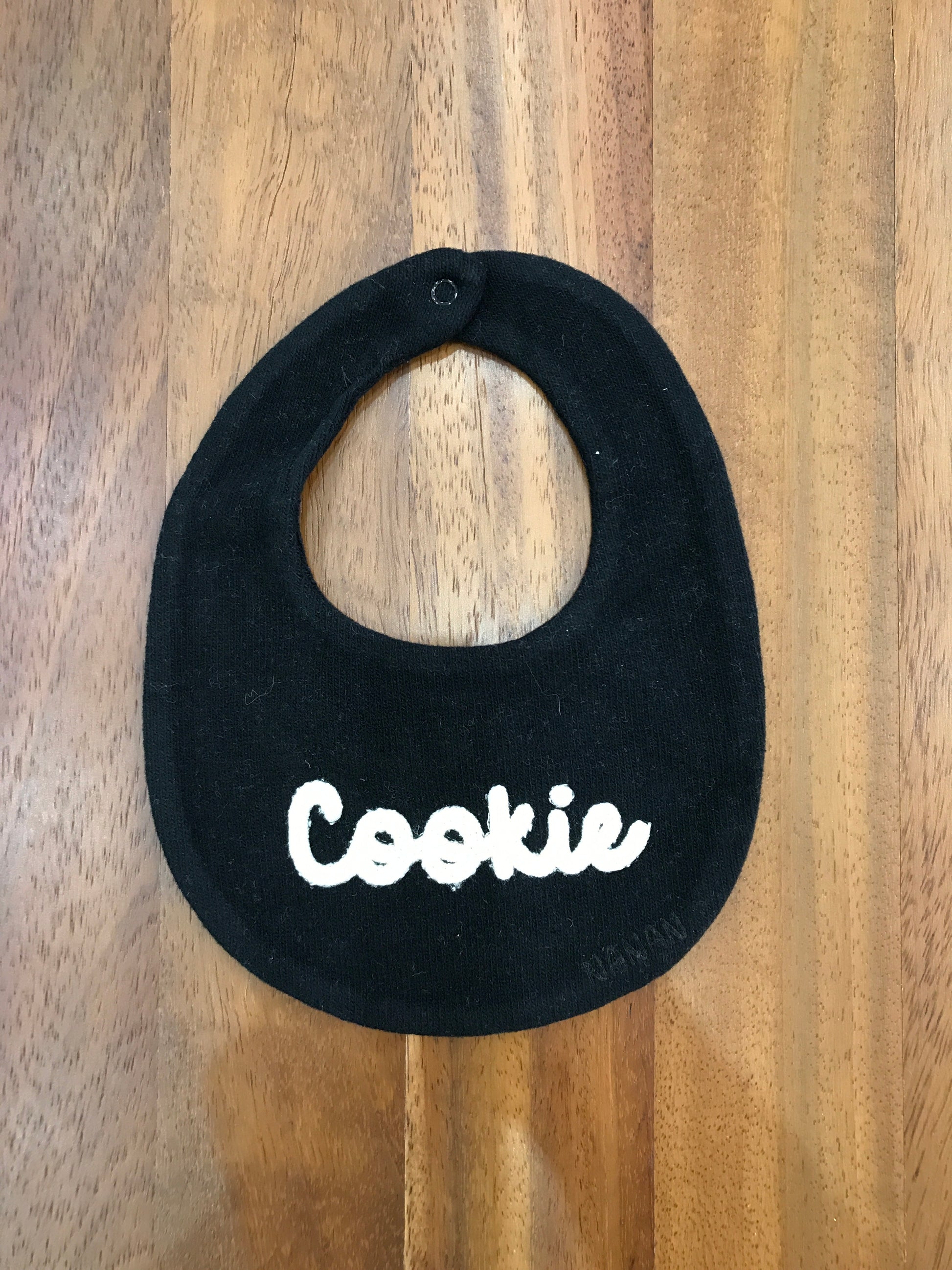 La bavetta realizzata in morbida ciniglia è dotata di una pratica chiusura con bottoni, che garantisce una vestibilità sicura e comoda. Al centro, presenta una scritta "cookie" che aggiunge un tocco di dolcezza e originalità al capo.
