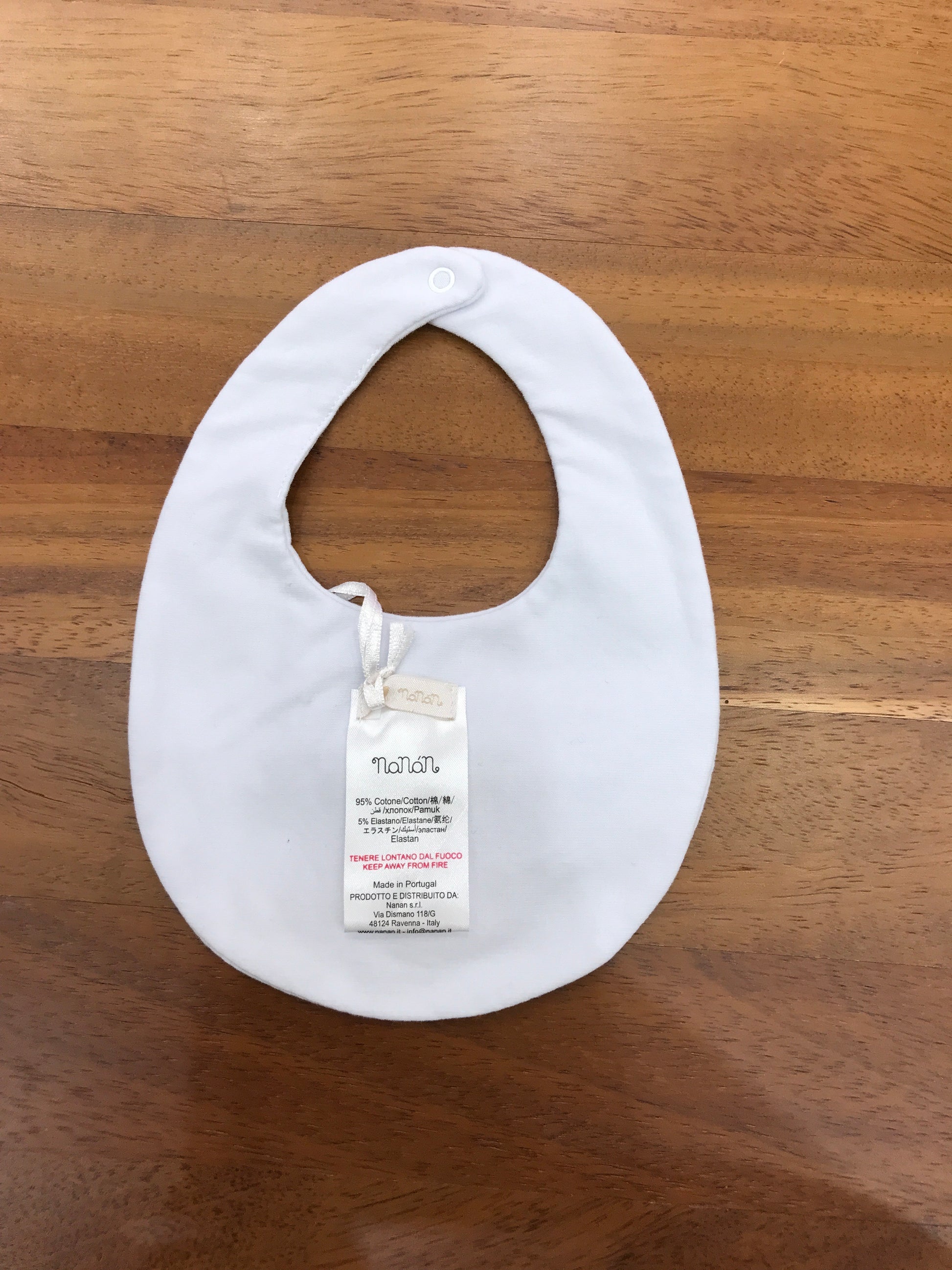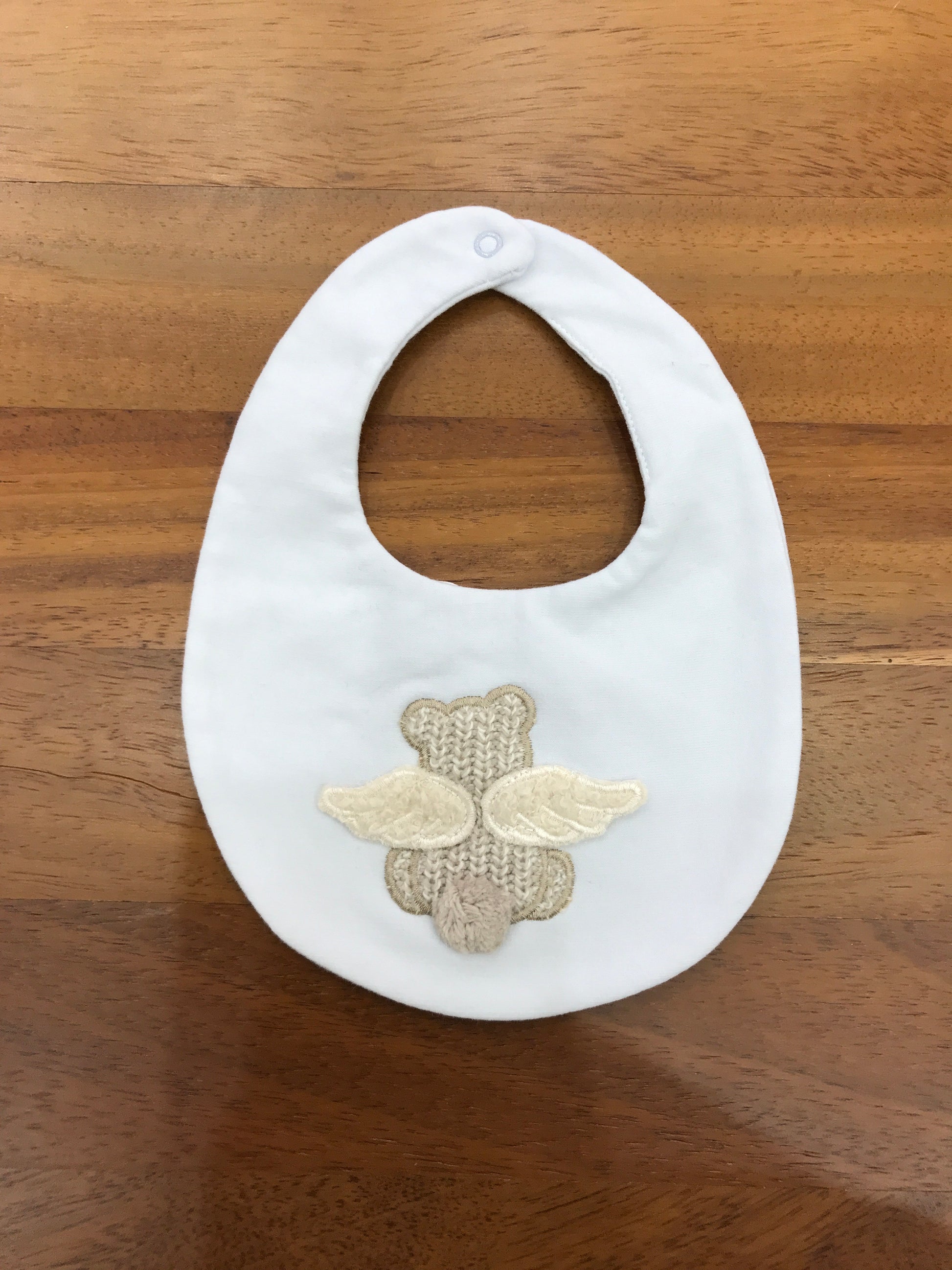 La bavetta realizzata in morbida ciniglia è dotata di una pratica chiusura con bottoni, che garantisce una vestibilità sicura e comoda. Al centro, spicca un adorabile orsetto caratterizzato da piccole ali, che aggiunge un tocco di dolcezza e originalità al capo.