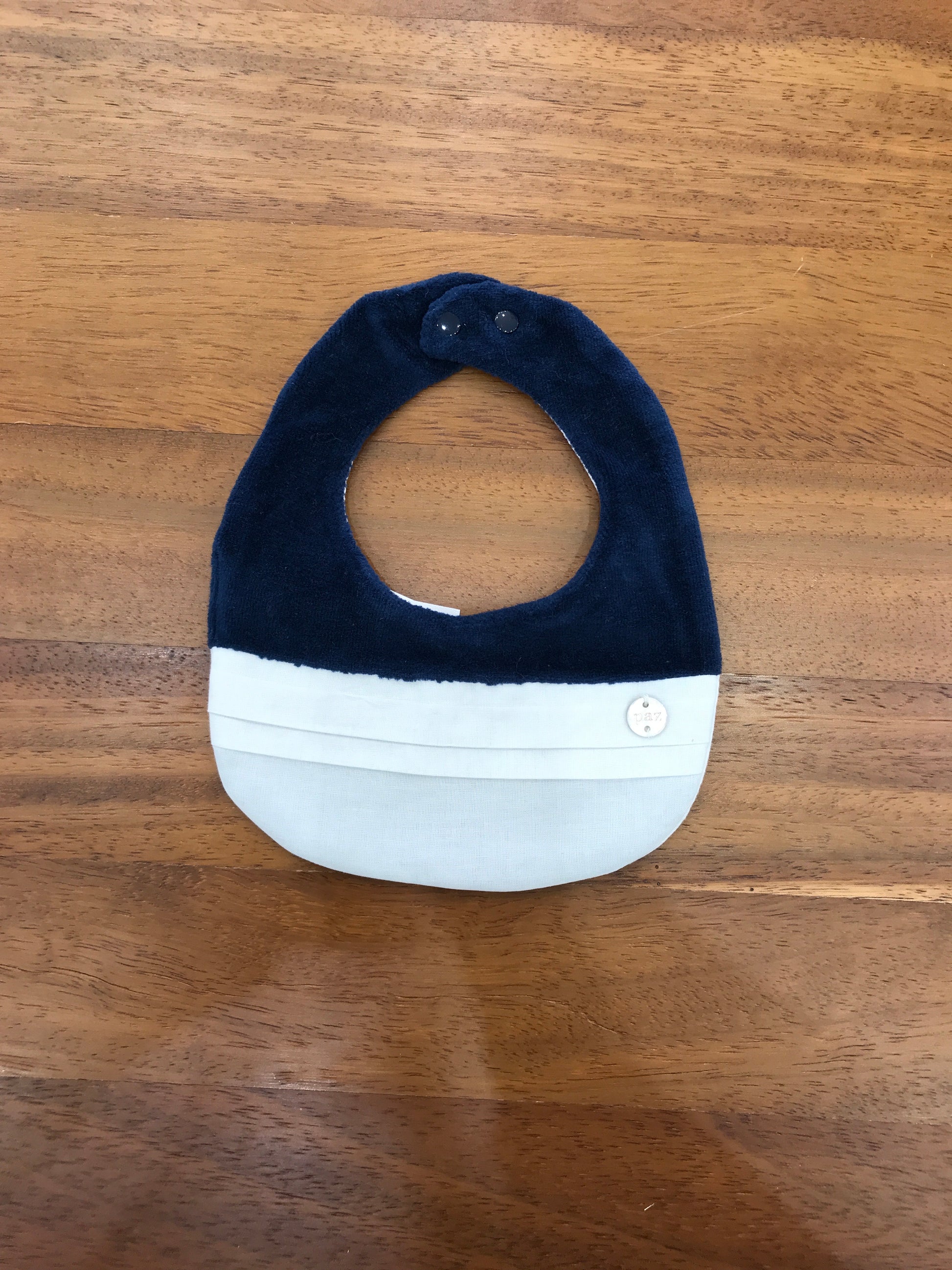 Questa bavetta presenta una forma rotonda ben definita ed è dotata di una pratica cinghia per garantire una facile regolazione e comfort durante l’utilizzo. Il design si distingue per la raffinata combinazione di colori blu e bianco, che aggiunge un tocco di eleganza e versatilità al prodotto. Ideale per proteggere i vestiti mantenendo al contempo uno stile sobrio e funzionale.