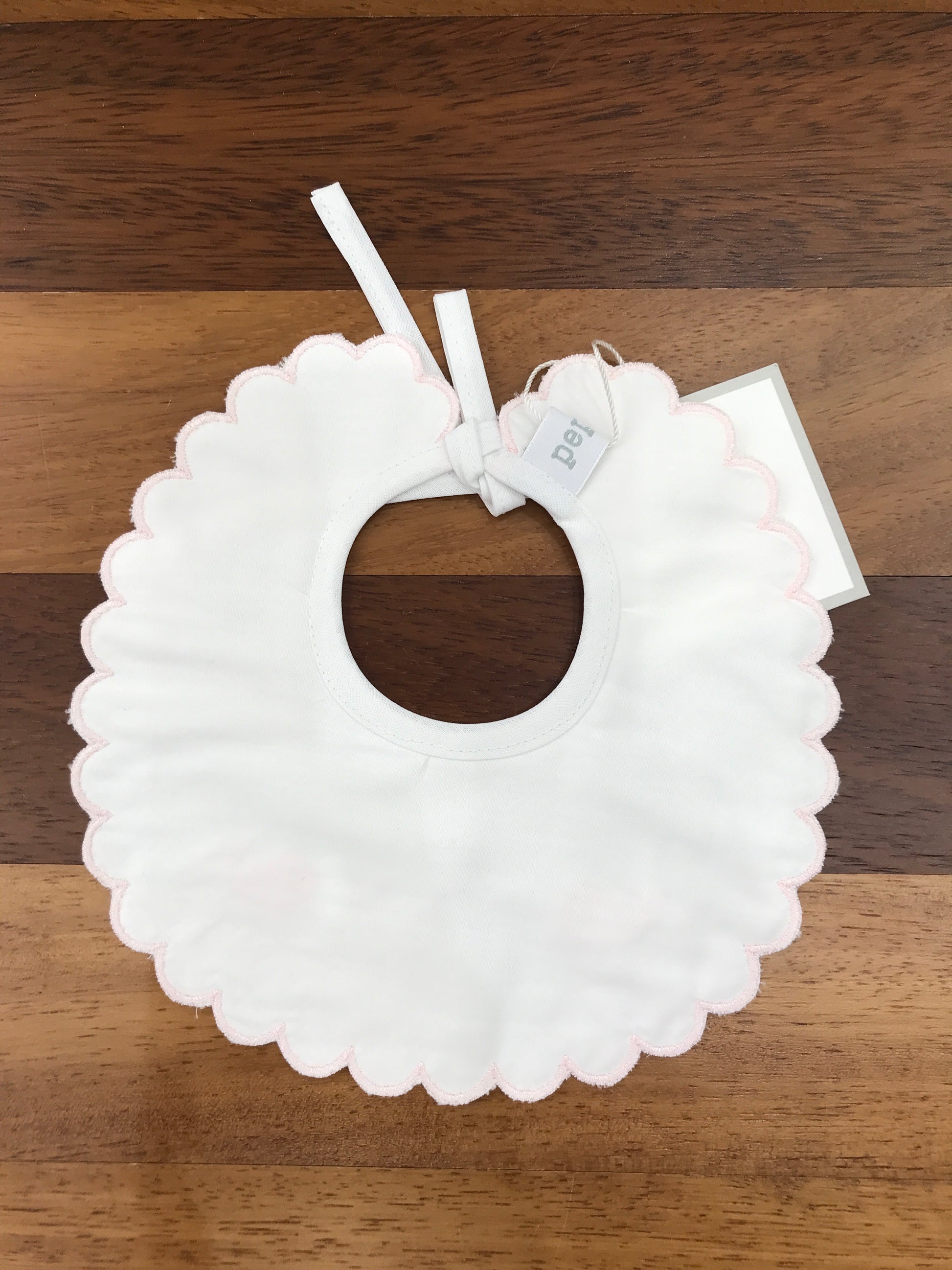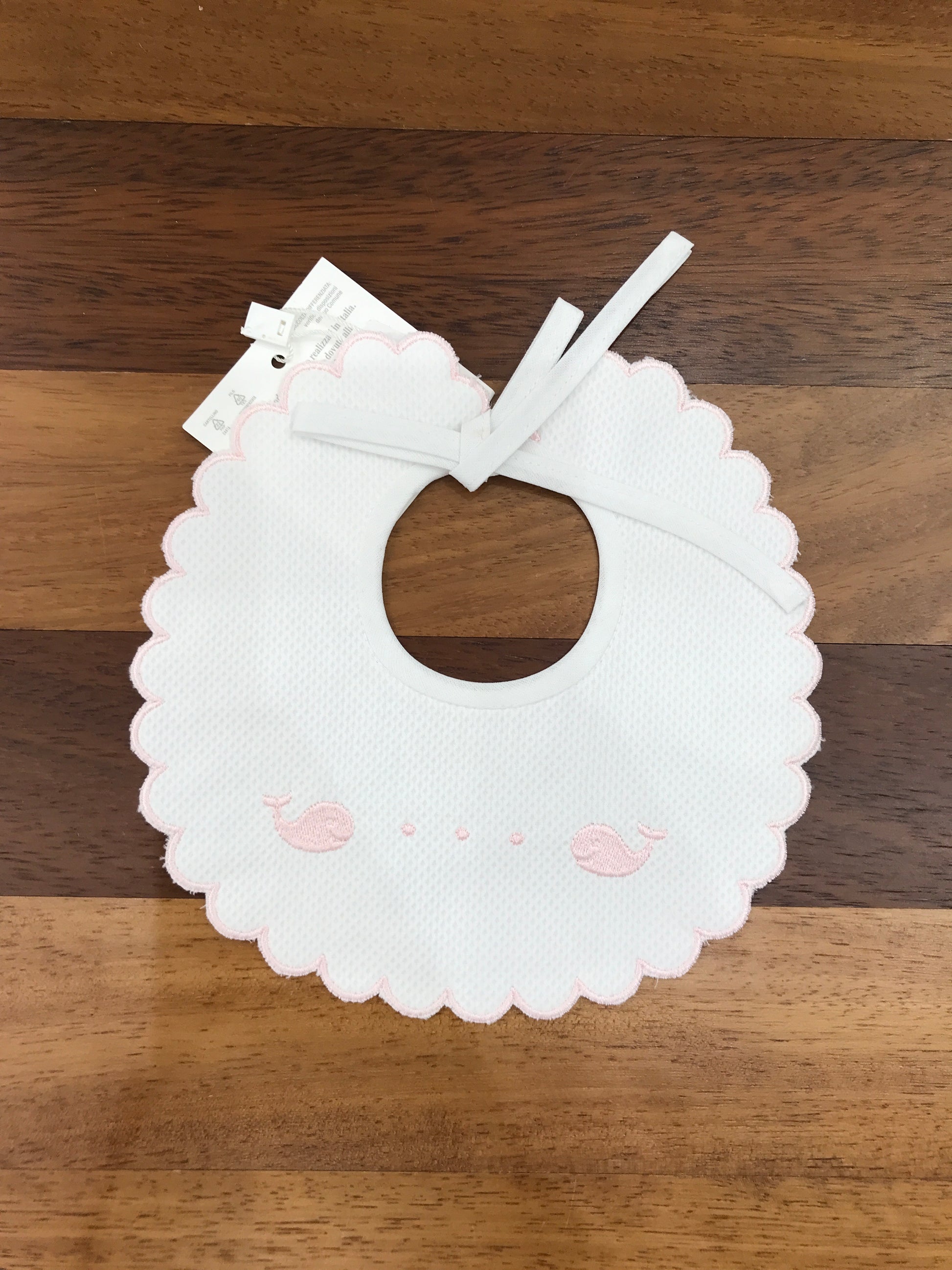 Elegante bavetta in piquet bianco e rosa, caratterizzata da un raffinato bordo smerlato con ricamo rosa. Il dettaglio distintivo è rappresentato dalle balene ricamate al centro in rosa, che conferiscono struttura e un tocco di sofisticatezza al capo. Un accessorio versatile e ricercato per completare l'outfit dei più piccoli con stile.