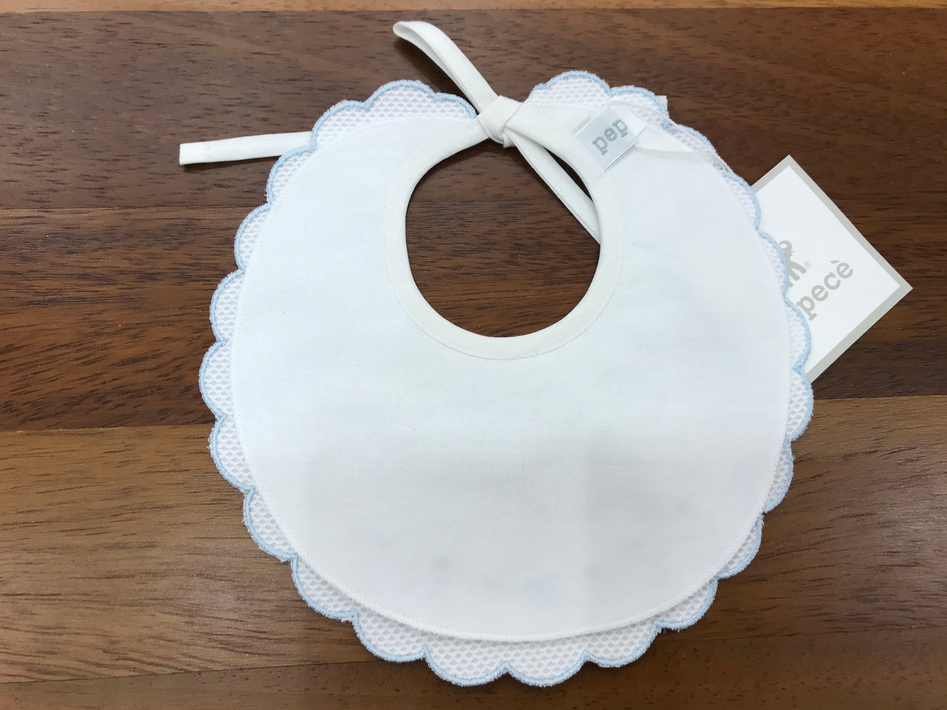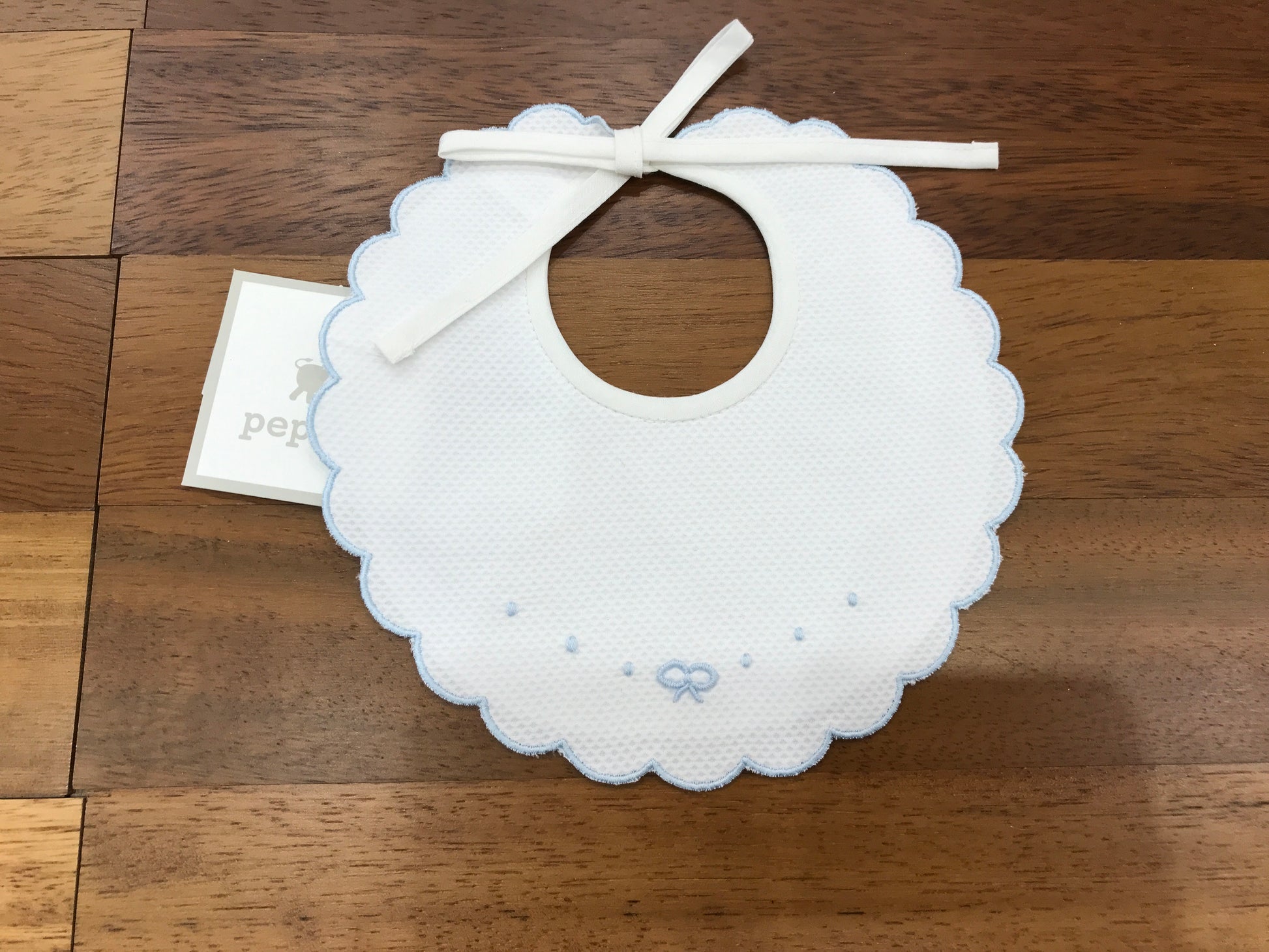 Questo bavaglino dalla forma rotonda presenta un elegante bordo smerlato che ne valorizza la finitura. È impreziosito da delicati ricami celesti, con al centro un piccolo fiocco decorativo accompagnato da una serie di sottili pois ricamati, che conferiscono un tocco raffinato e ricercato. Un accessorio perfetto per un look curato nei dettagli.