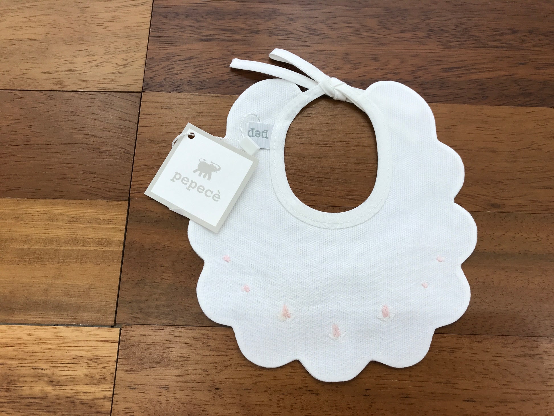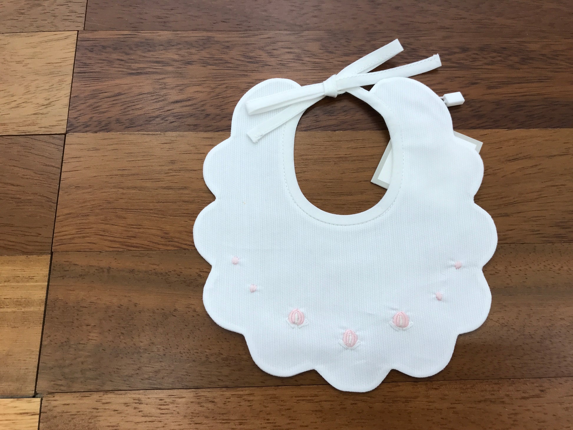 Questo bavaglino si distingue per il suo elegante profilo smerlato e presenta al centro un delicato ricamo di fiori rosa, che aggiunge un tocco raffinato al design. La chiusura è arricchita da un piccolo fiocchetto, che non solo assicura una vestibilità confortevole ma dona anche un dettaglio estetico raffinato. Ideale per completare con stile ogni outfit infantsile, unendo funzionalità e charme in un unico accessorio.