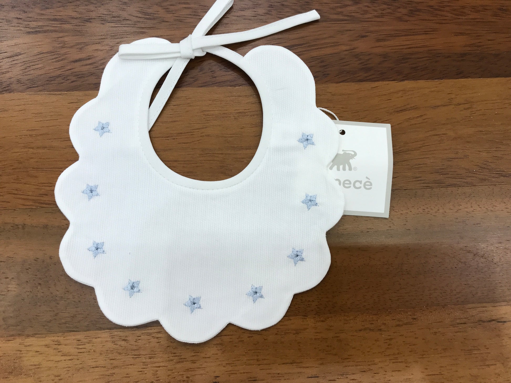 Bavaglino con sagoma rotonda e bordi smerlati, impreziosito da delicate stelline celesti ricamate lungo tutto il contorno. La chiusura è posizionata sul retro e arricchita da un piccolo fiocchetto che aggiunge un tocco di eleganza e praticità nell’utilizzo. Perfetto per offrire comfort e stile durante i pasti.