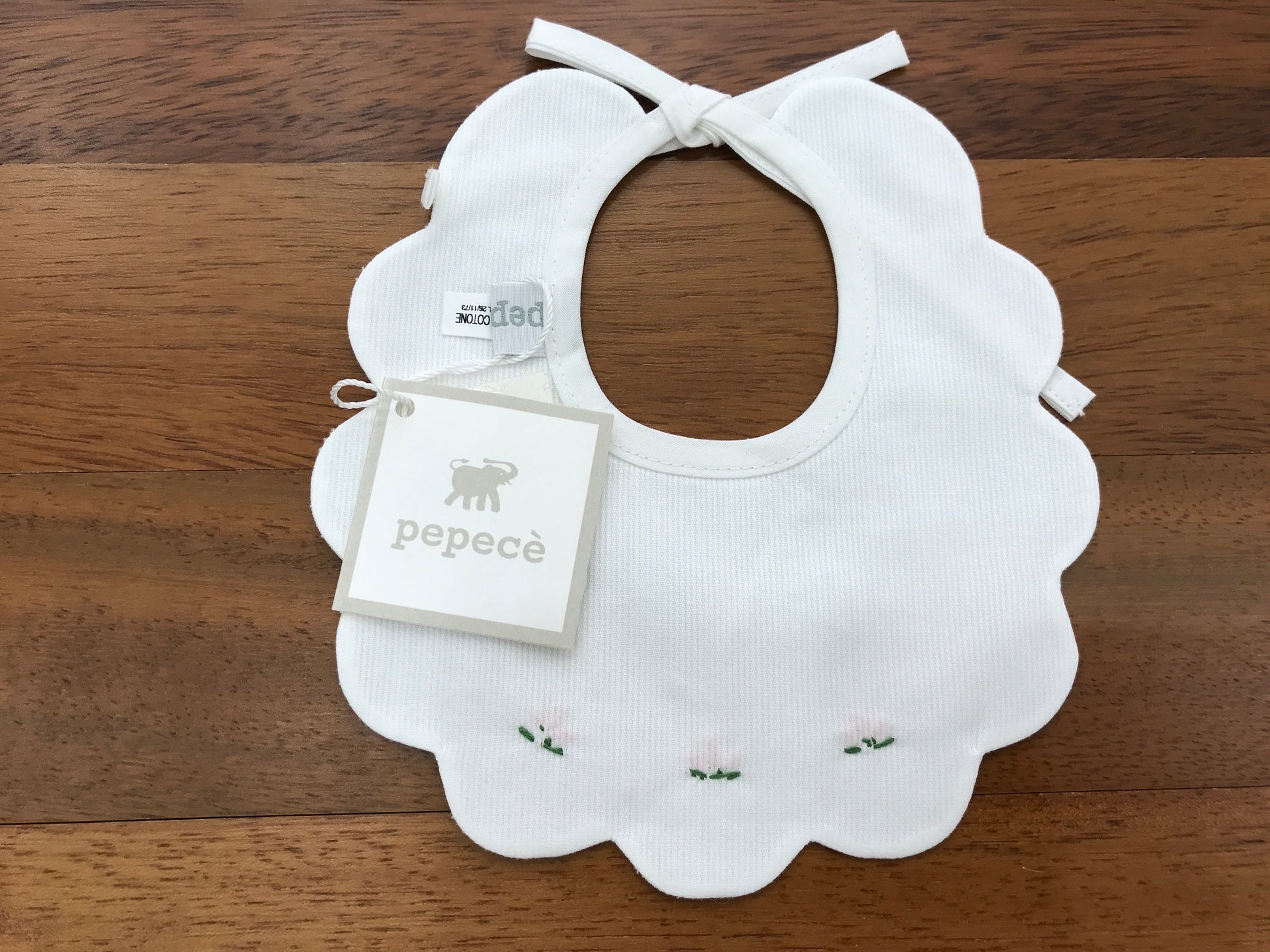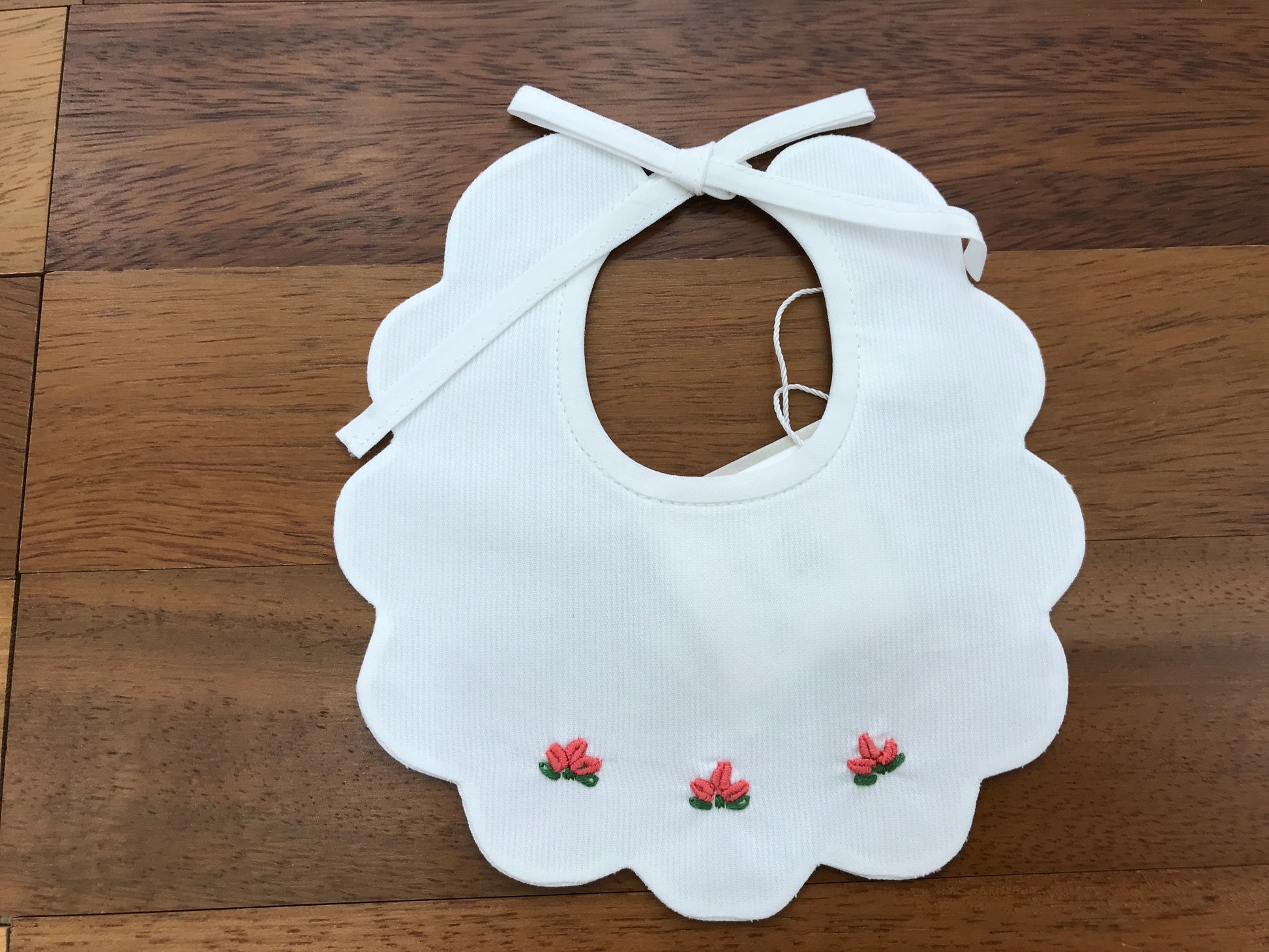 Bavaglino bianco con bordo smerlato, ornato da delicati ricami rossi floreali e chiusura a fiocchetto.