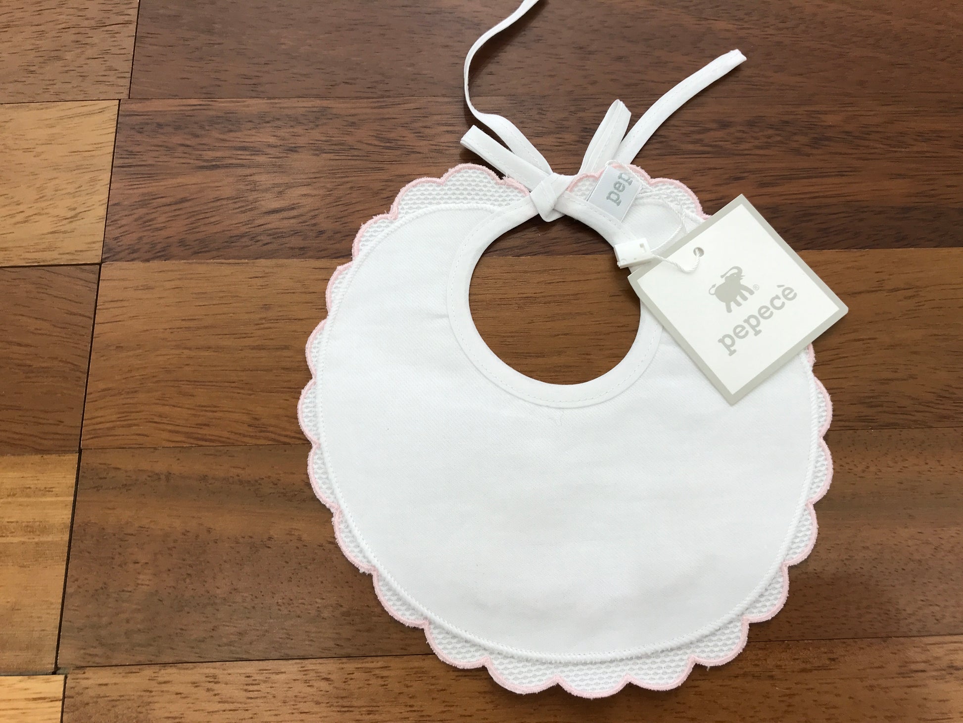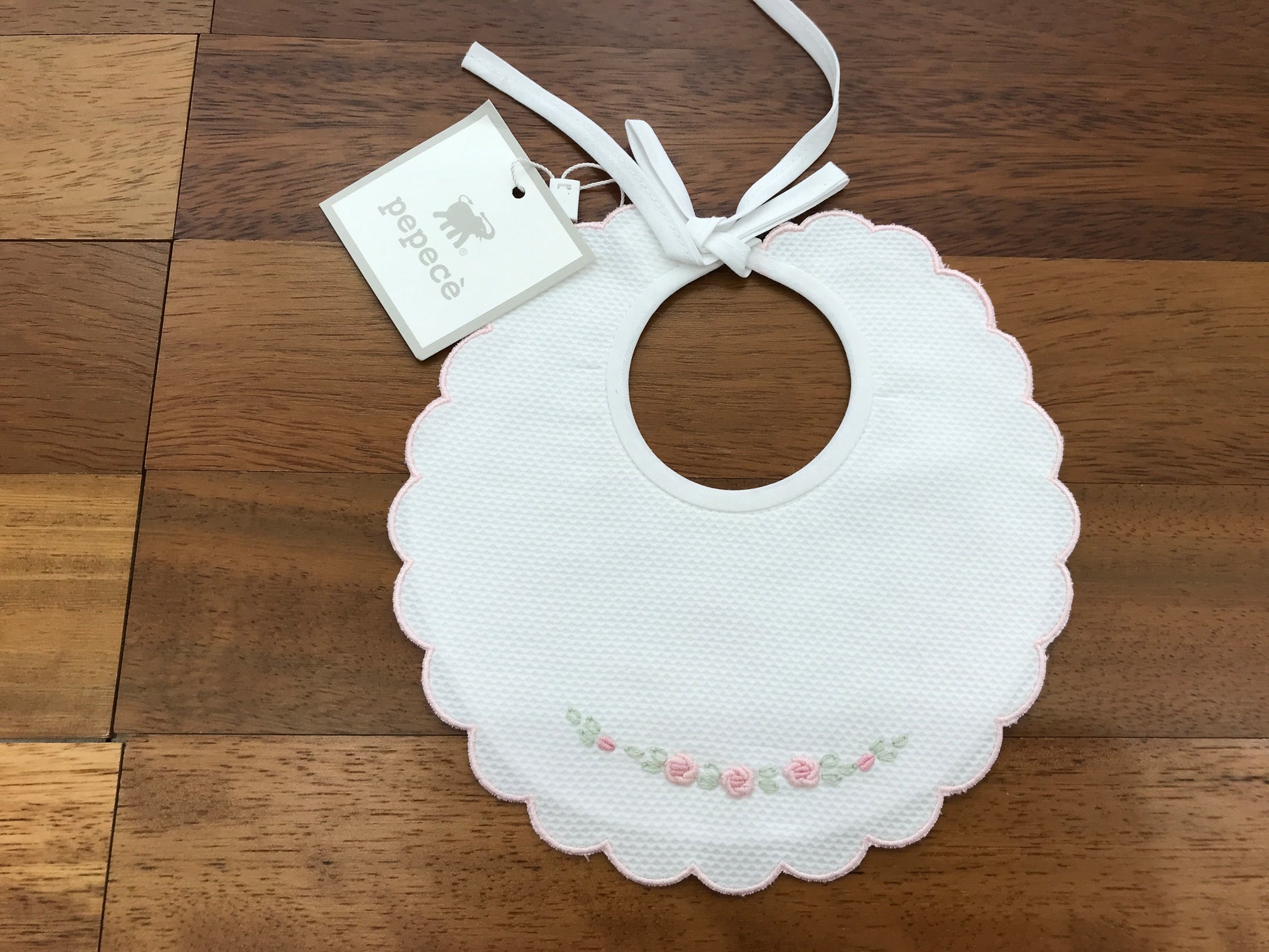 Bavaglino sagomato con rifiniture rosa e delicati motivi floreali ricamati al centro frontale. Sul retro presenta un elegante fiocchetto che consente una chiusura sicura e regolabile, unendo praticità e stile in un unico accessorio raffinato.