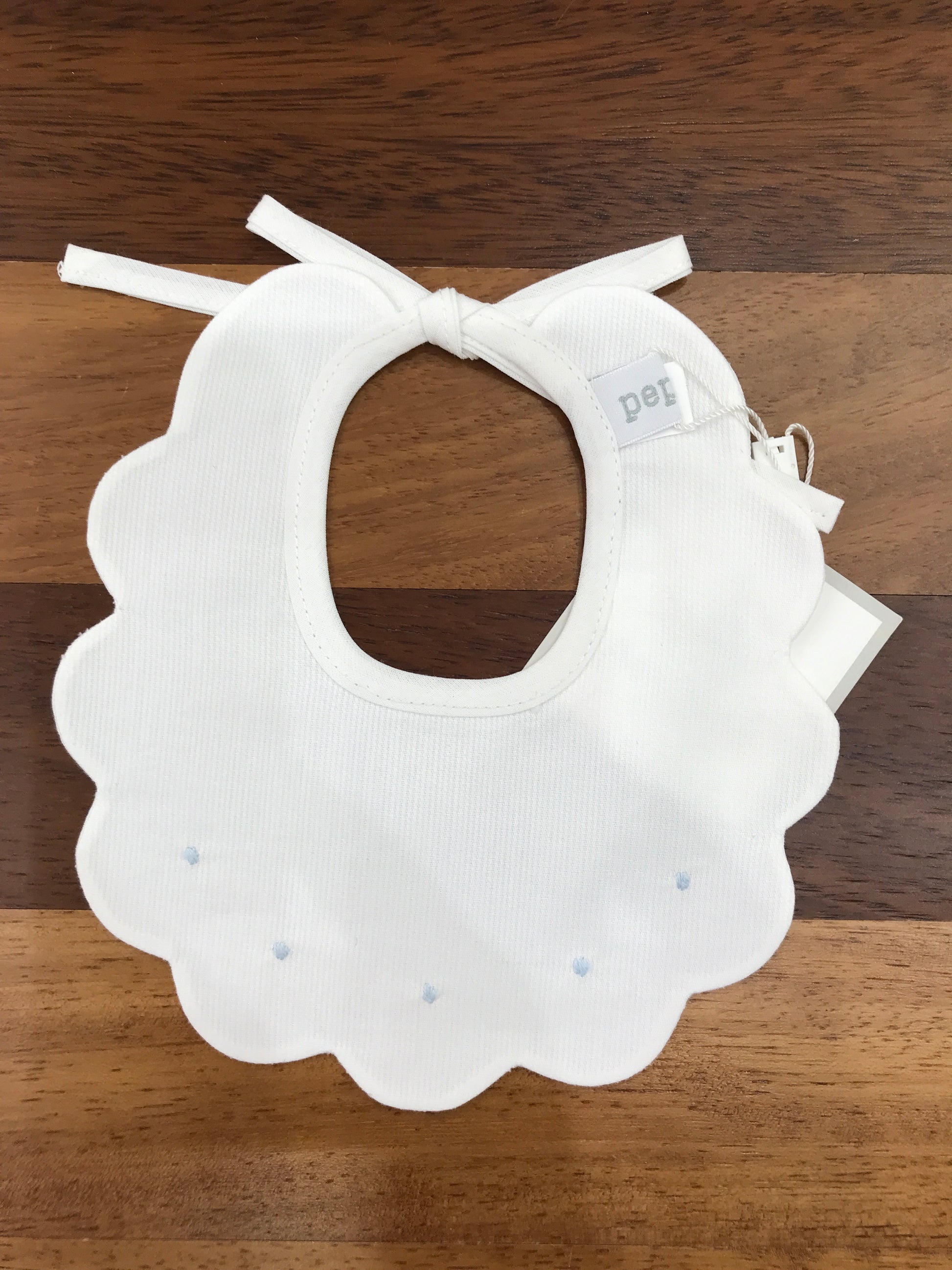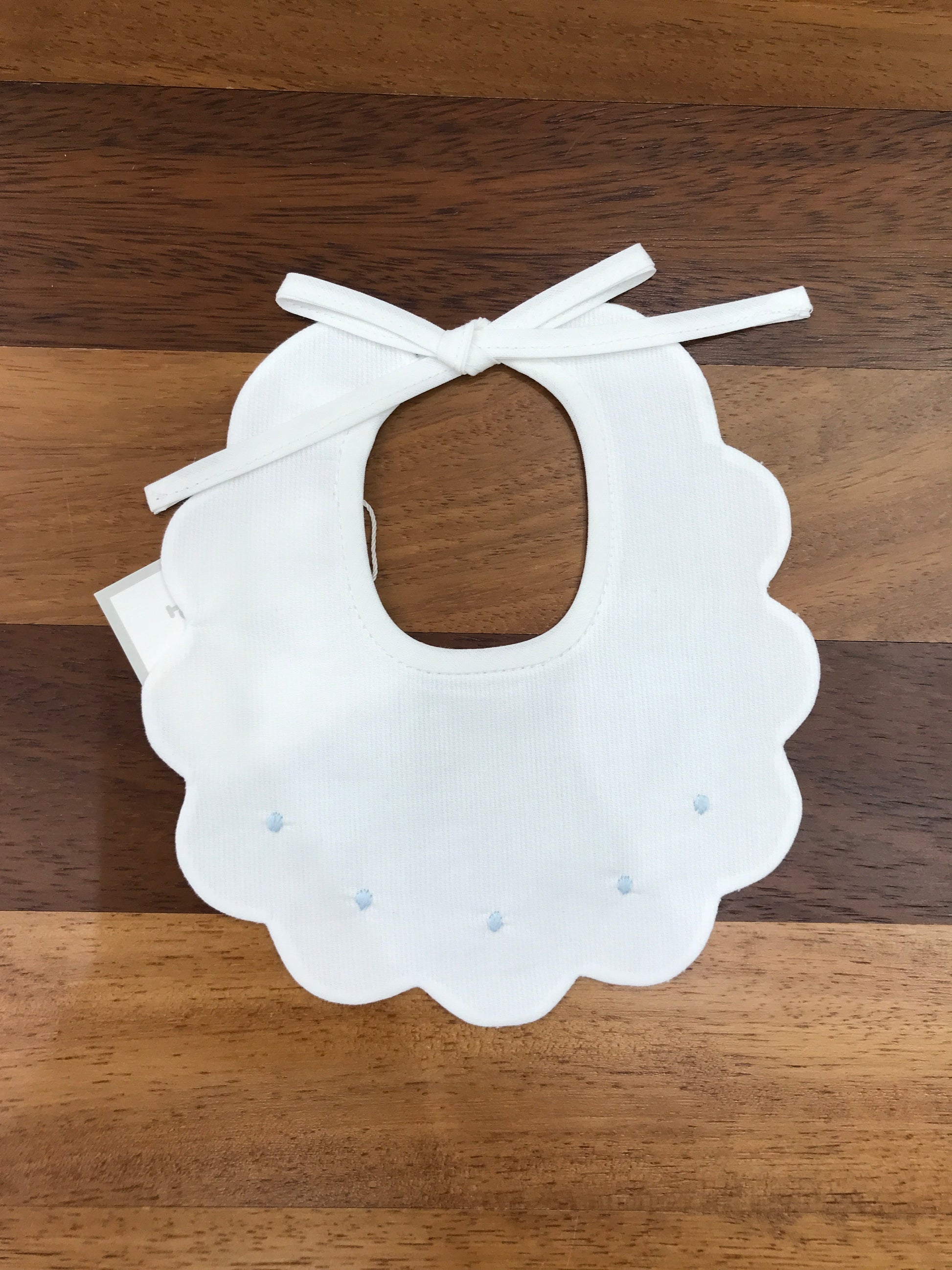 Elegante bavetta in piquet con orlo smerlato, caratterizzata da un raffinato motivo a pois celesti su fondo bianco. Un accessorio versatile che combina praticità e stile, perfetto per proteggere gli abiti del bambino mantenendo un'estetica ricercata e coordinata.