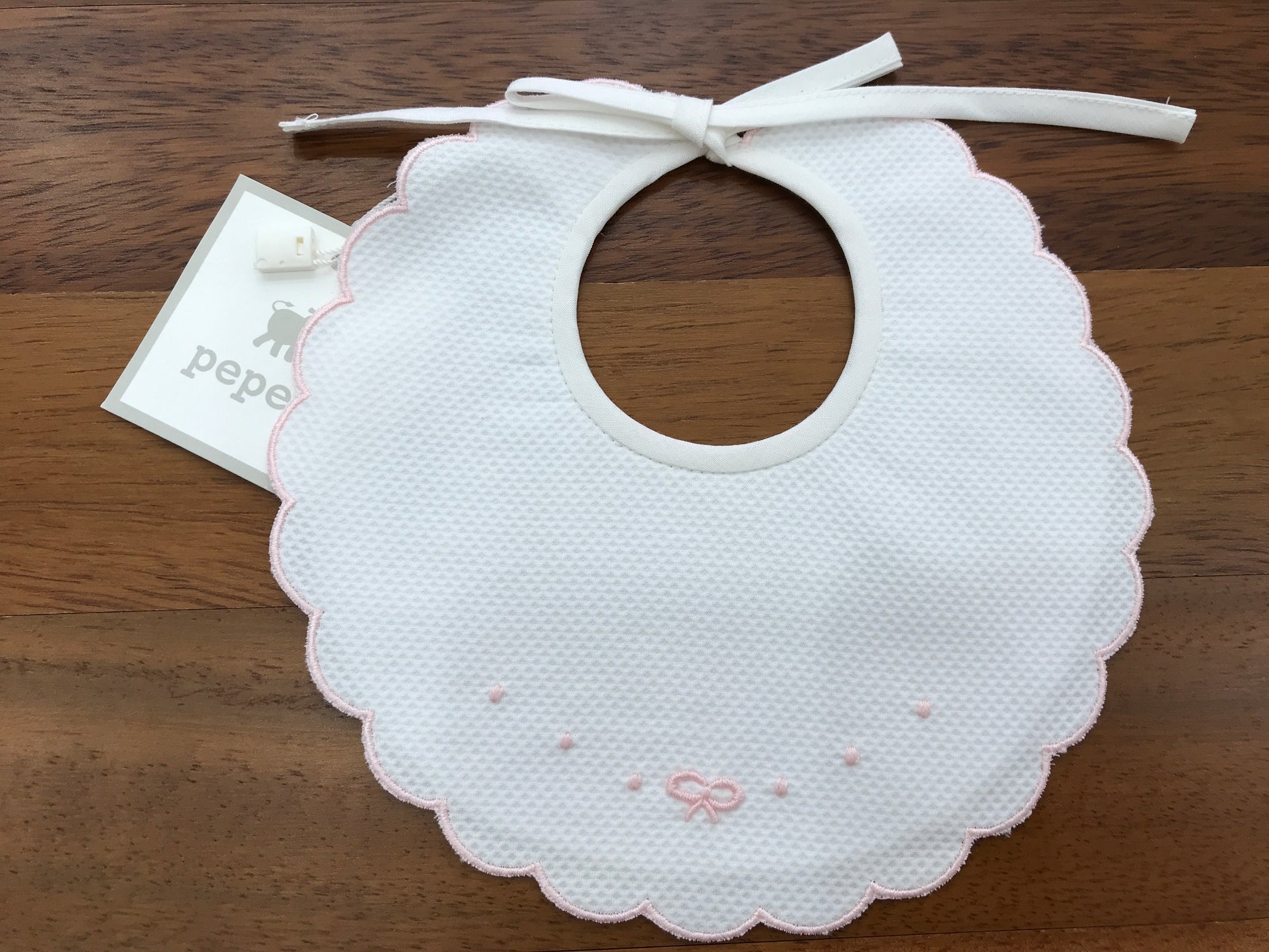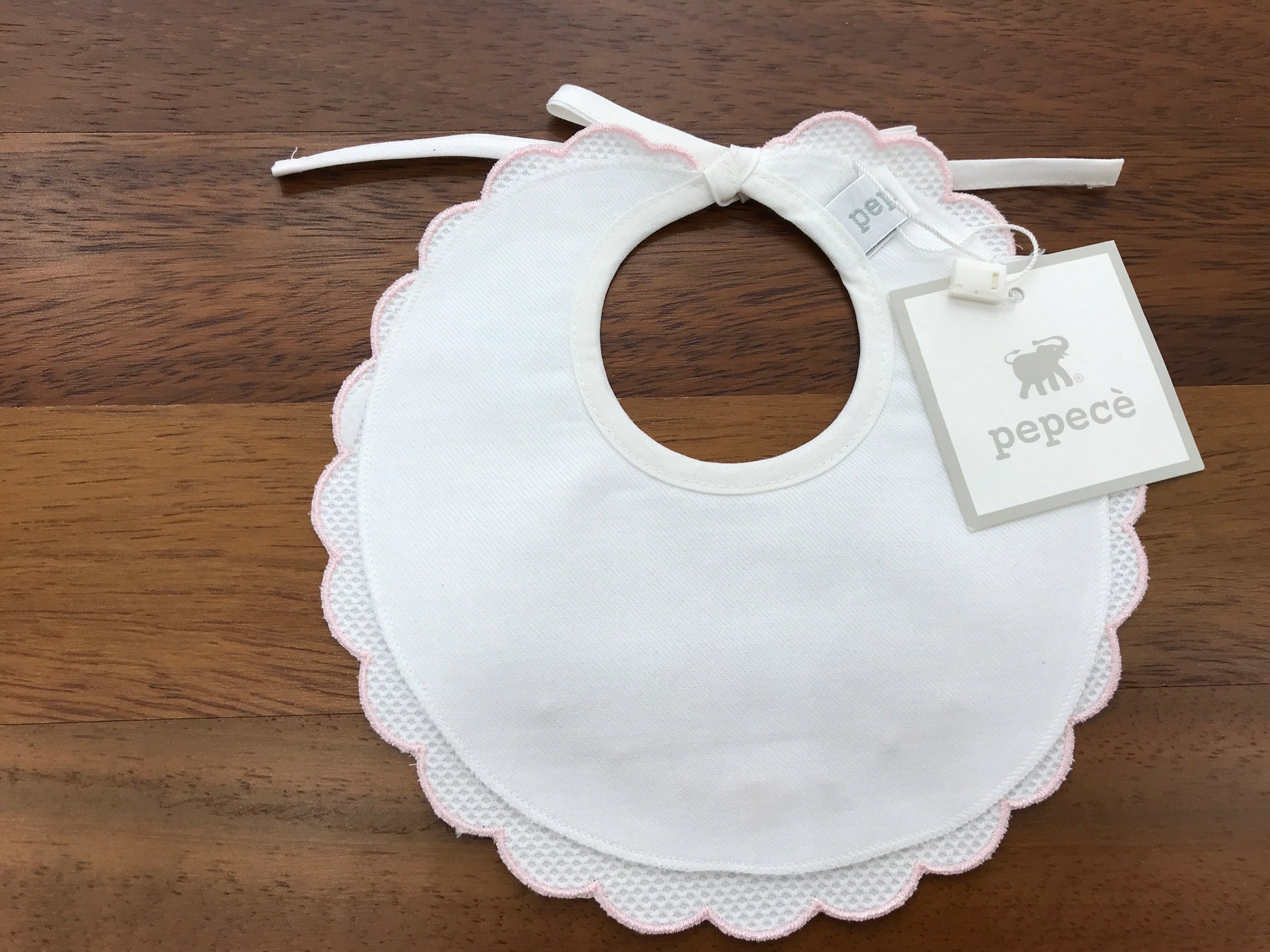 Questo bavaglino smerlato presenta un delicato bordo rosa che ne sottolinea la forma, arricchito da un elegante fiocchetto ricamato in tinta rosa. La decorazione a pois, anch’essa rosa, aggiunge un dettaglio raffinato, rendendo l’accessorio perfetto per completare con stile il corredino del tuo bambino.