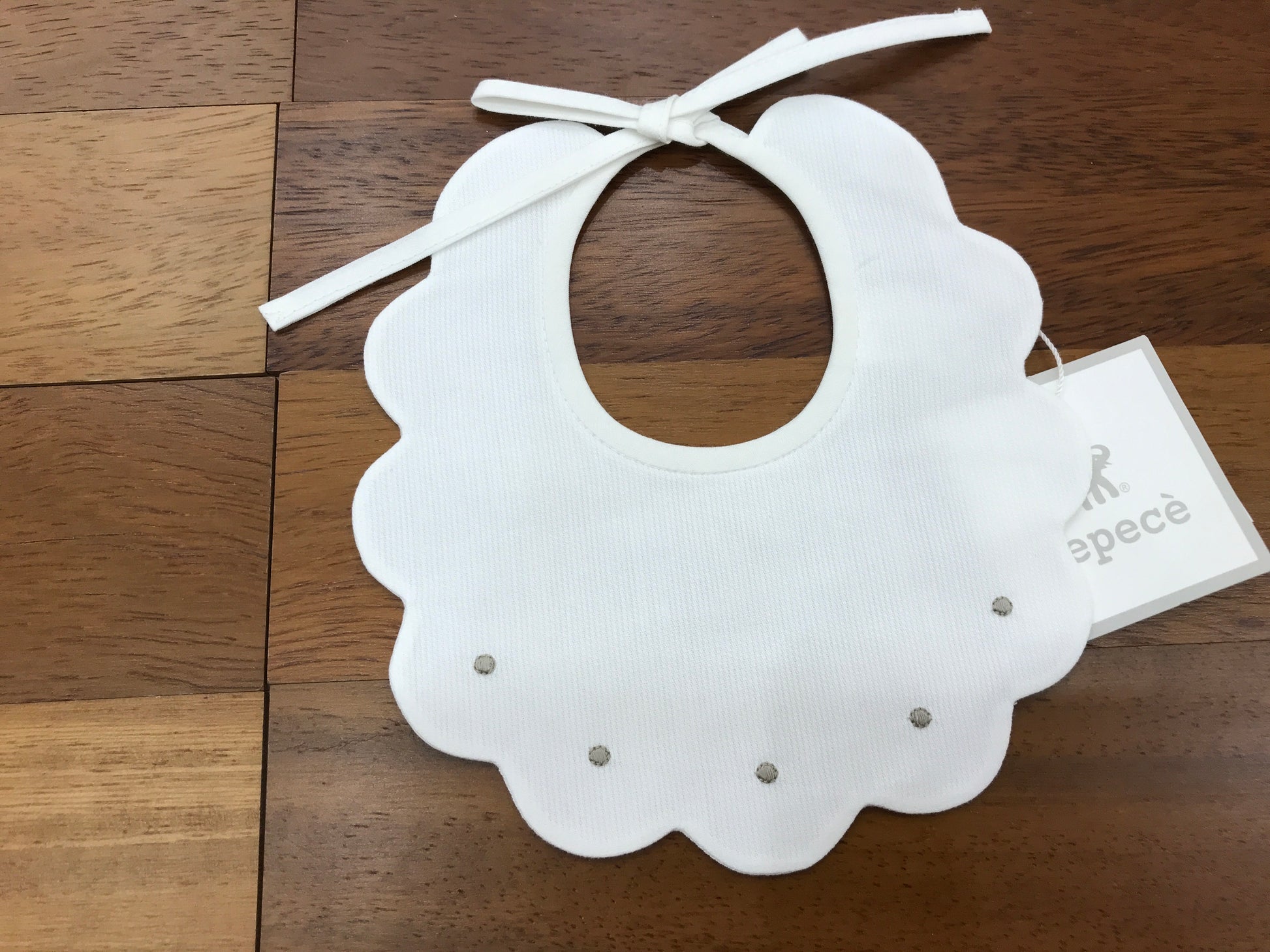 Bavaglino caratterizzato da una forma rotonda con bordi smerlati, arricchito da un elegante ricamo di pois in tonalità tortora che conferisce un aspetto raffinato e distintivo. Ideale per aggiungere un tocco di stile classico a ogni momento del pasto.