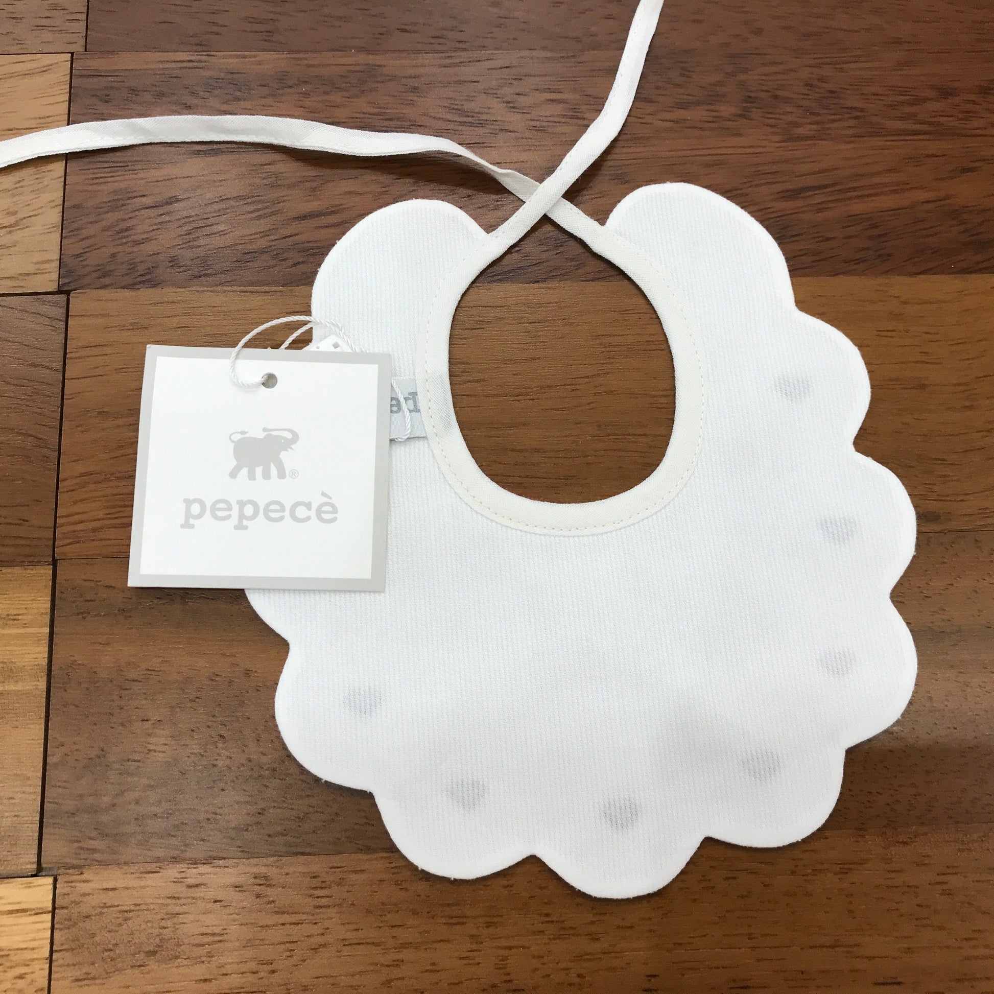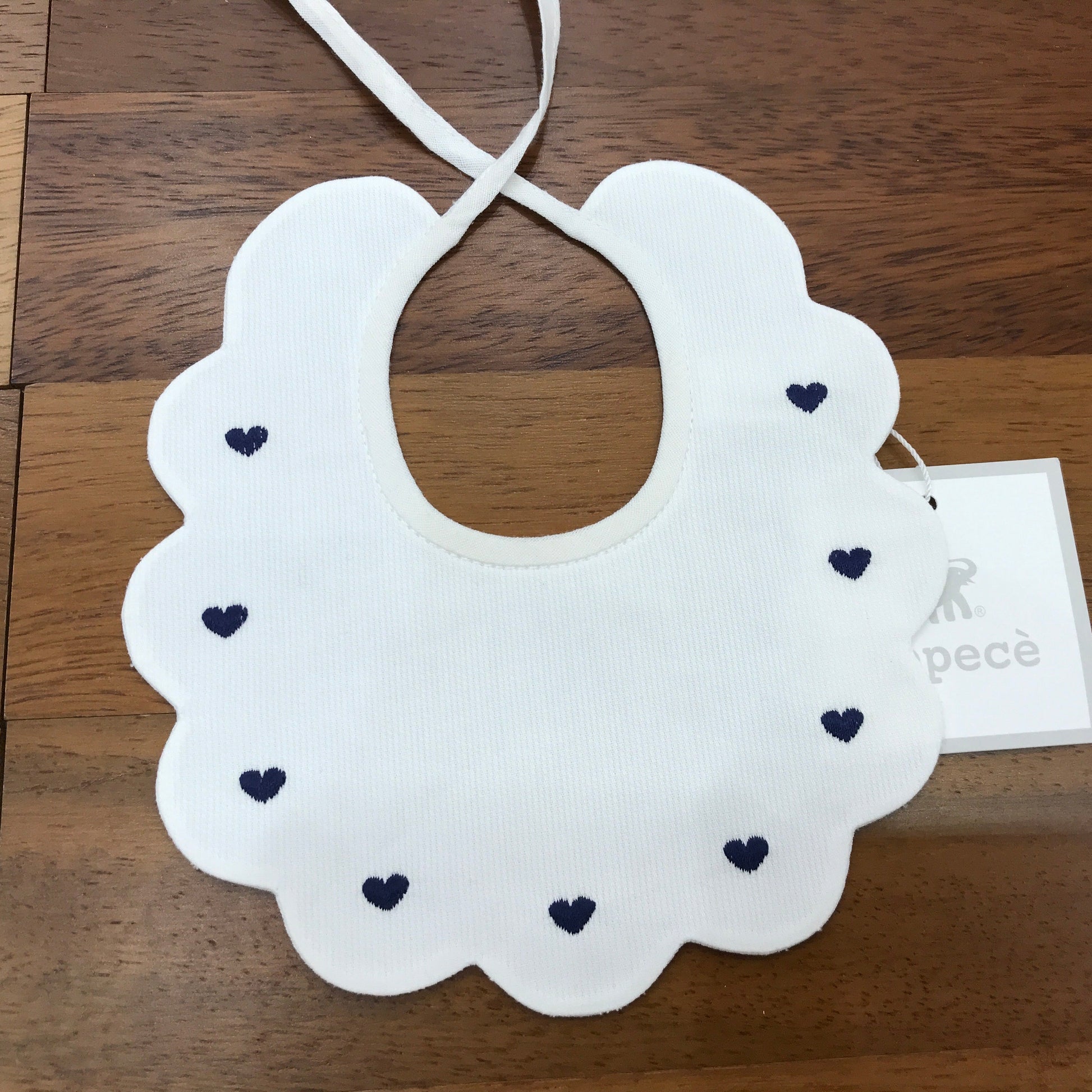 Questo bavaglino si distingue per la sua forma rotonda con bordi smerlati, arricchita da un delicato ricamo di cuoricini blu posizionati sul davanti, che ne esaltano l'eleganza e la qualità sartoriale.
