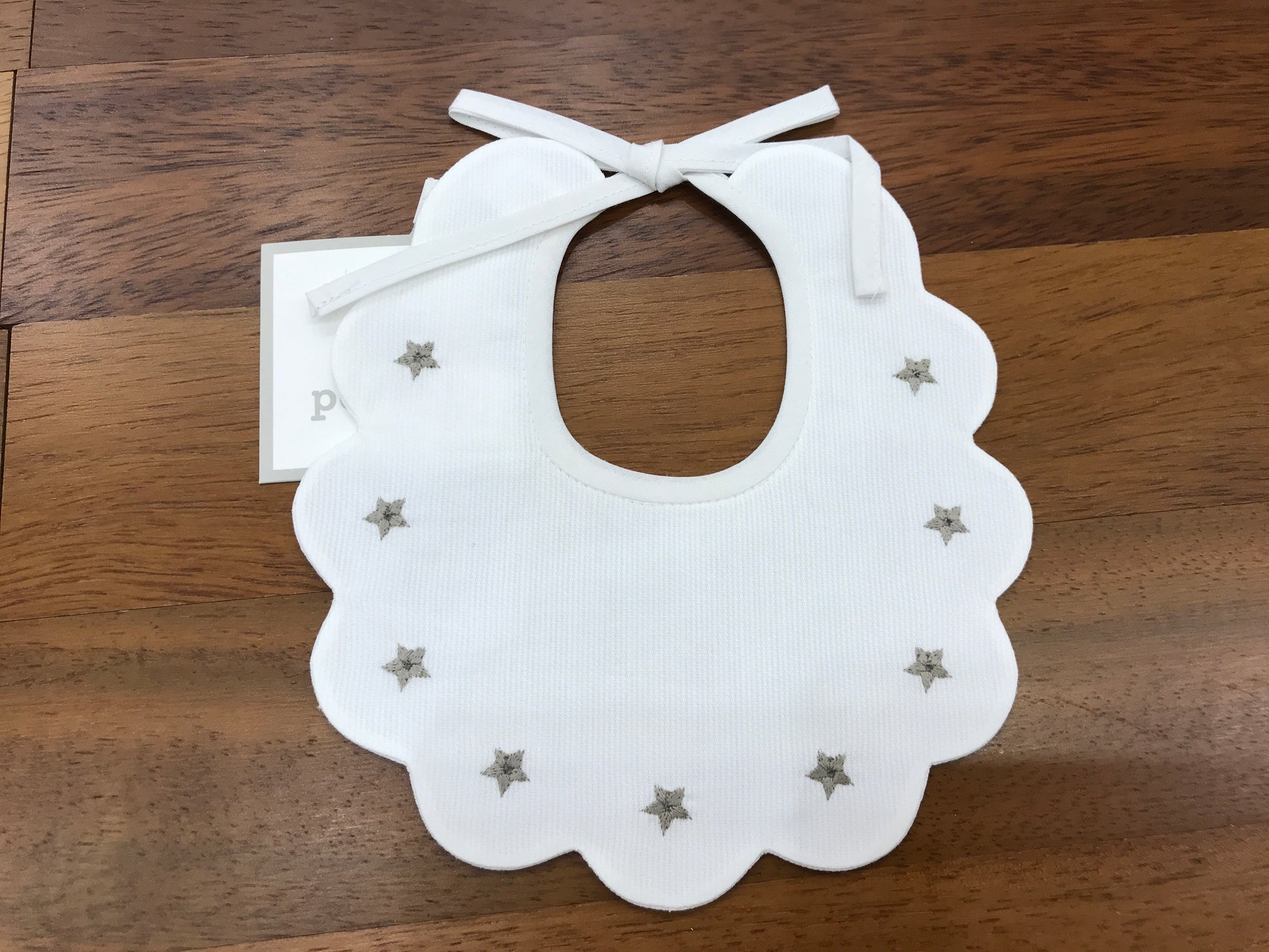 Bavaglino caratterizzato da una forma rotonda con bordi smerlati, arricchito da delicate stelline ricamate in una raffinata tonalità di grigio. Questo design unisce estetica e funzionalità, offrendo protezione con uno stile elegante e curato nei dettagli.