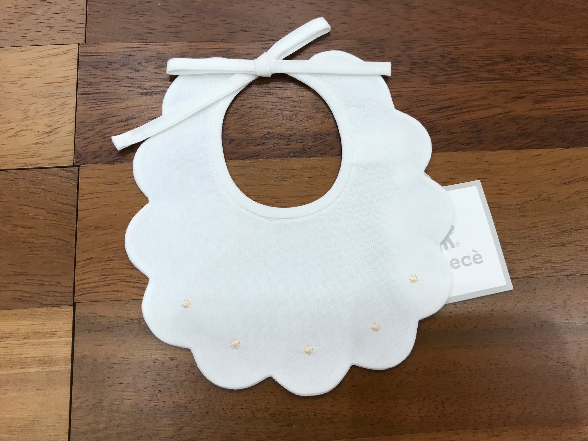 Bavaglino caratterizzato da una forma rotonda con bordo smerlato, arricchito da un raffinato ricamo di piccoli pois beige. Questo dettaglio conferisce al capo un'eleganza discreta, ideale per completare con stile qualsiasi outfit per i più piccoli.
