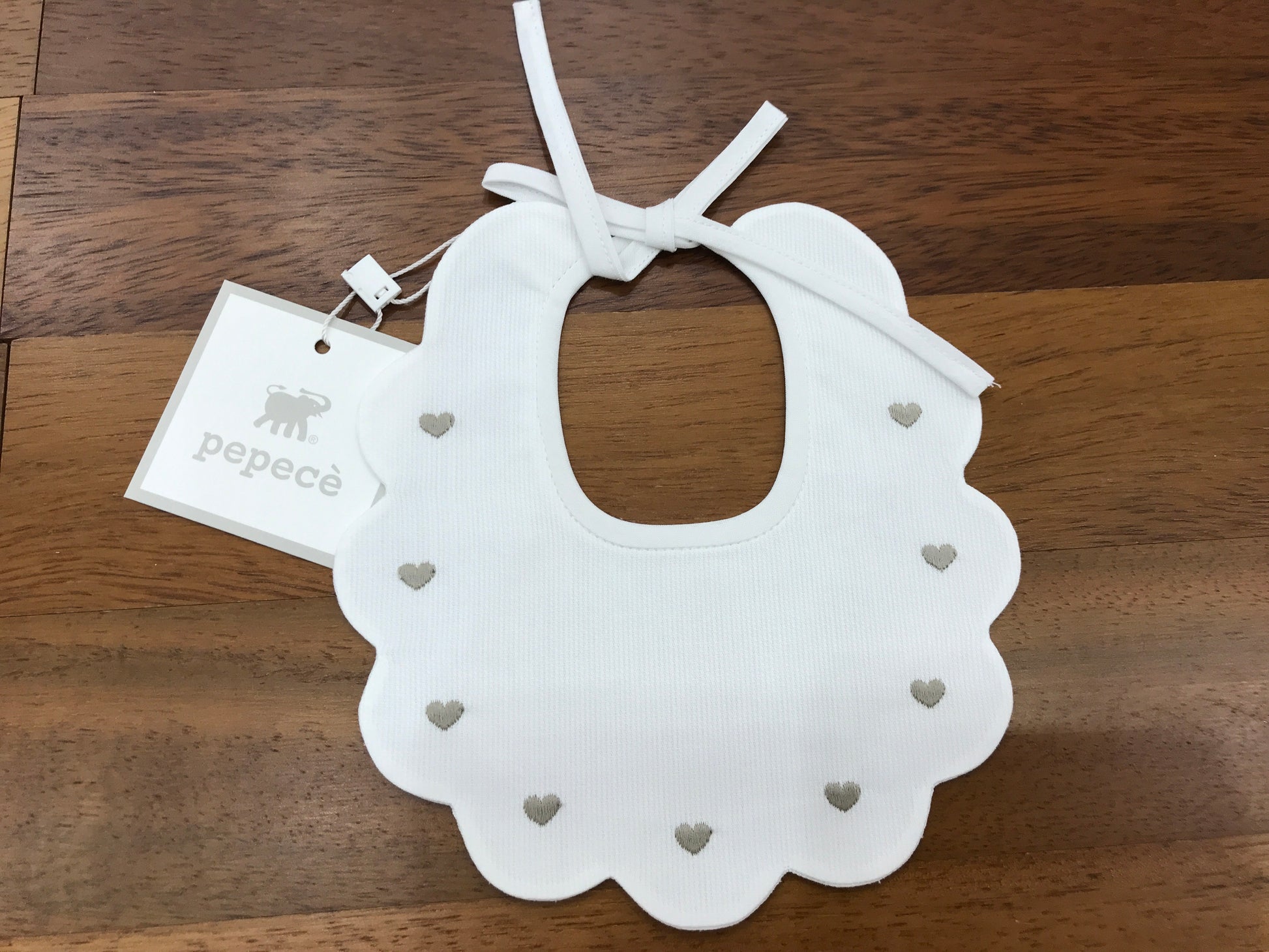Questo bavaglino presenta una raffinata forma rotonda con bordi smerlati, arricchita da una decorazione di piccoli cuoricini ricamati in tonalità tortora sul davanti, che conferiscono un’eleganza discreta e un tocco di dolcezza al capo. Realizzato con attenzione ai dettagli, è pensato per unire funzionalità a uno stile ricercato.