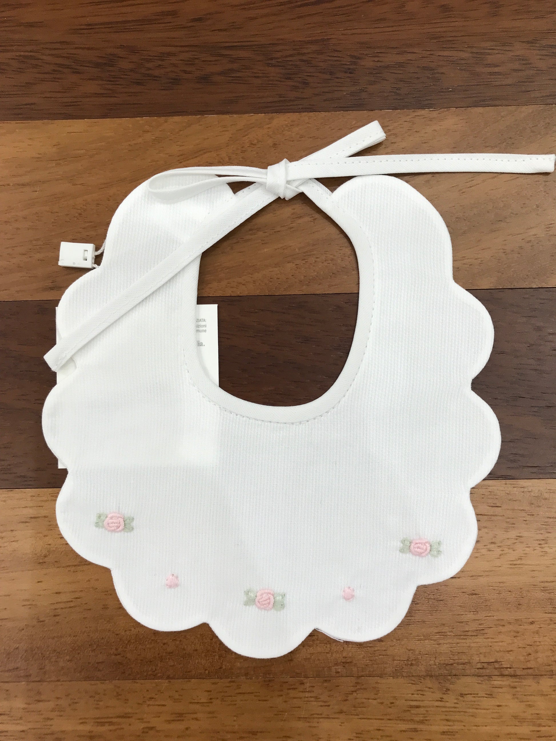 Elegante bavaglino in pregiato piquet bianco, rifinito con delicato smerlo perimetrale. Il davanti è impreziosito da raffinate rose ricamate in tonalità rosa, che conferiscono un tocco di sofisticatezza al capo. Ideale per proteggere gli abiti dei più piccoli mantenendo uno stile raffinato e curato.