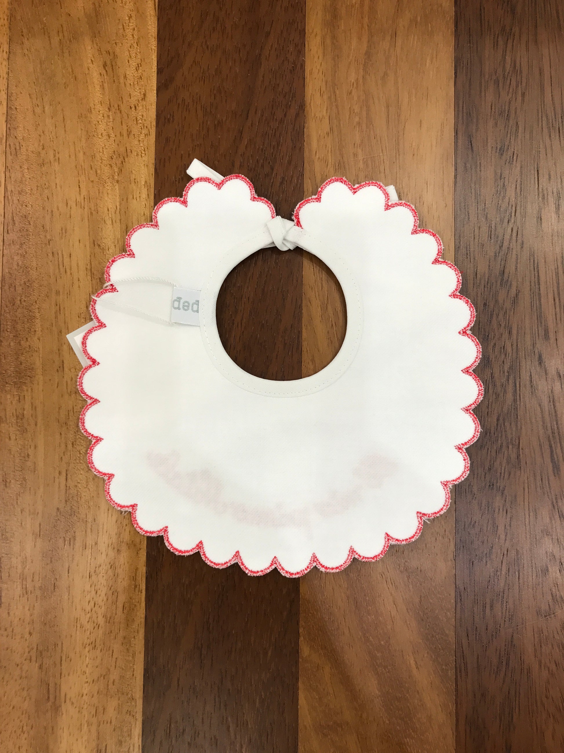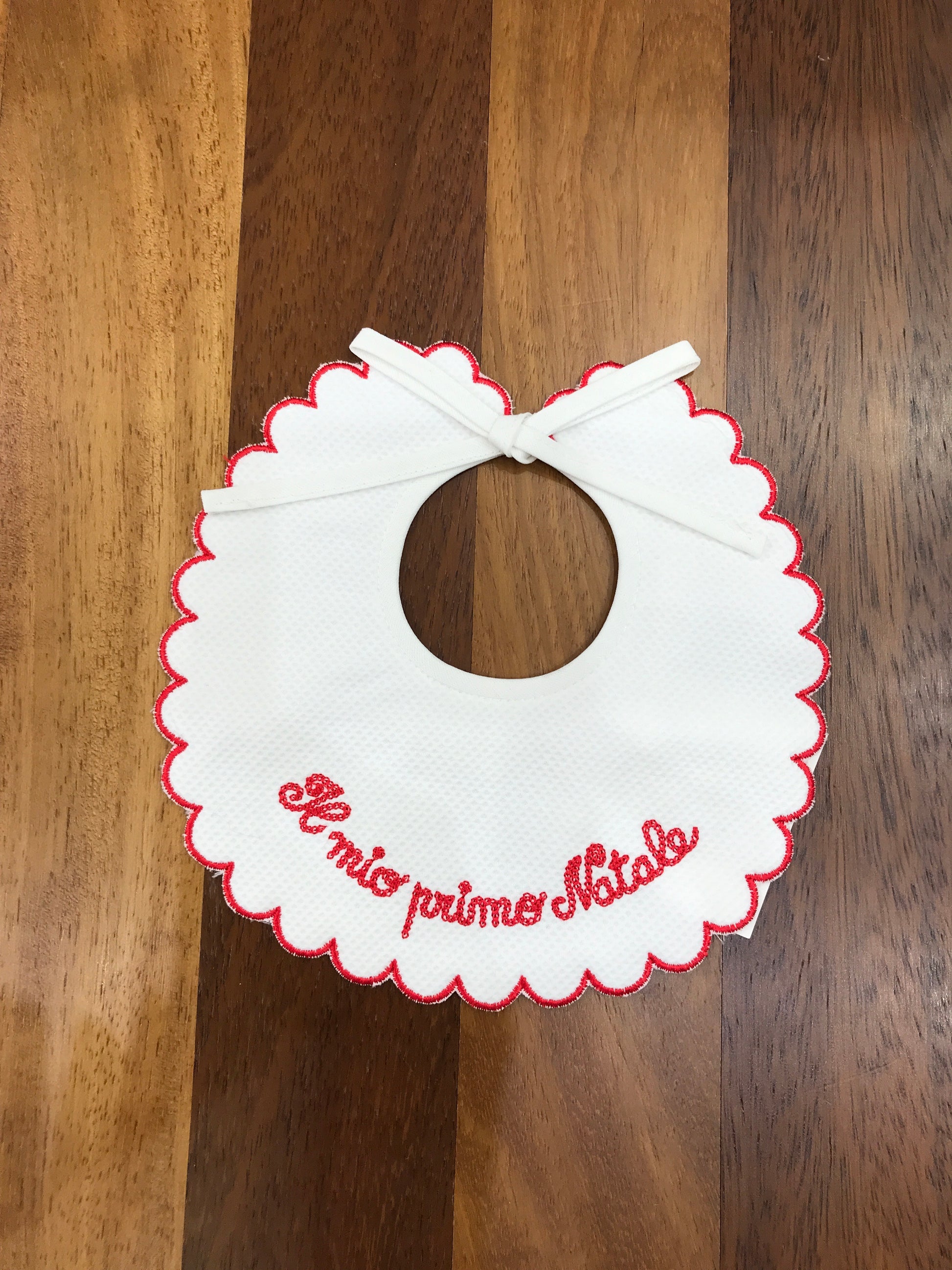 Elegante bavaglino in piquet bianco con raffinato bordo rosso smerlato, impreziosito dalla scritta "Il mio primo Natale" in rosso. Un accessorio sofisticato e pratico, perfetto per celebrare il primo Natale del vostro bambino con stile e delicatezza.
