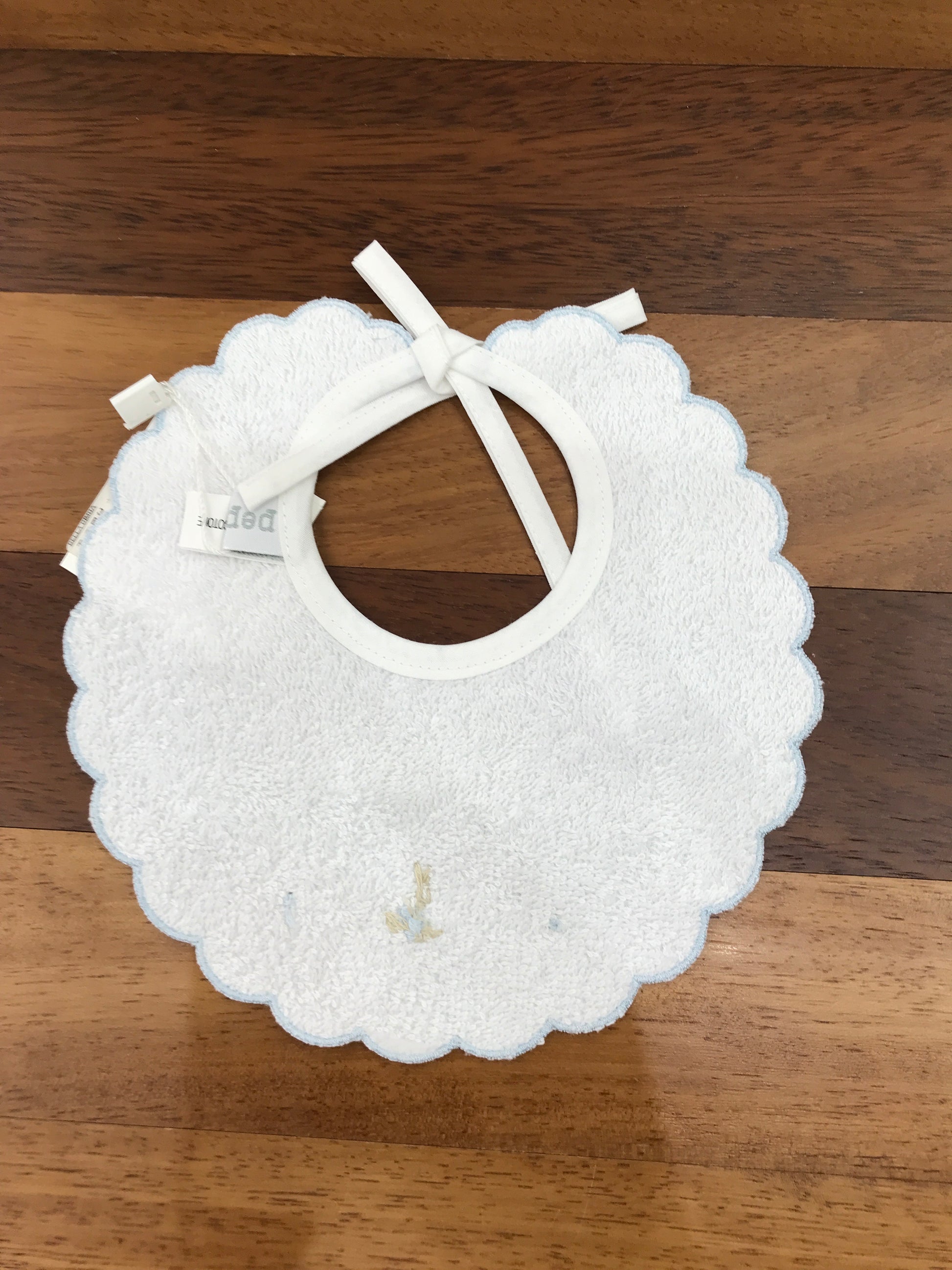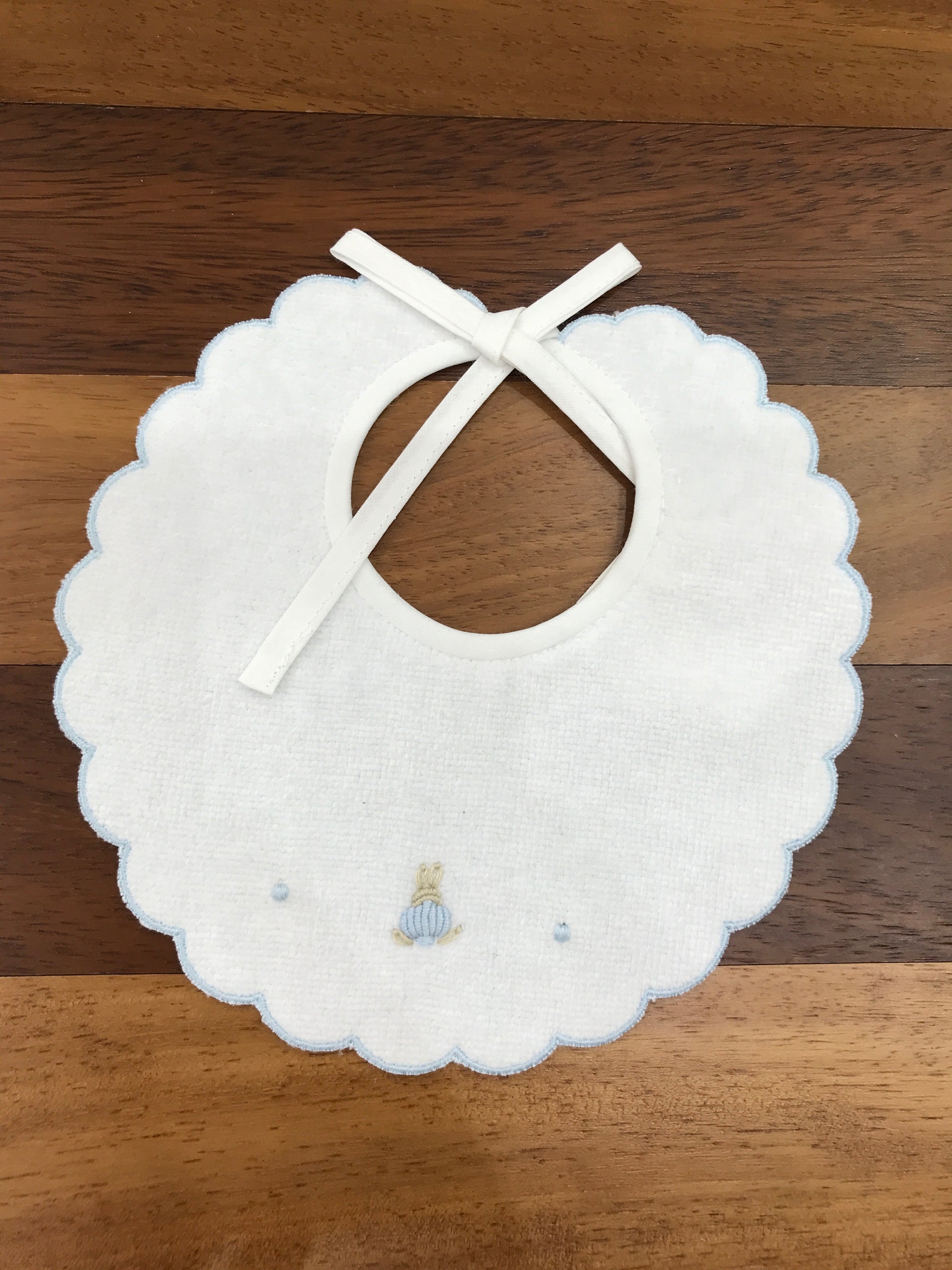 Elegante bavaglino realizzato in morbida spugna bianca, caratterizzato da un raffinato bordo smerlato in tonalità celadon e impreziosito da un ricamo centrale di pregevole fattura. Un accessorio pratico e sofisticato per i più piccoli.