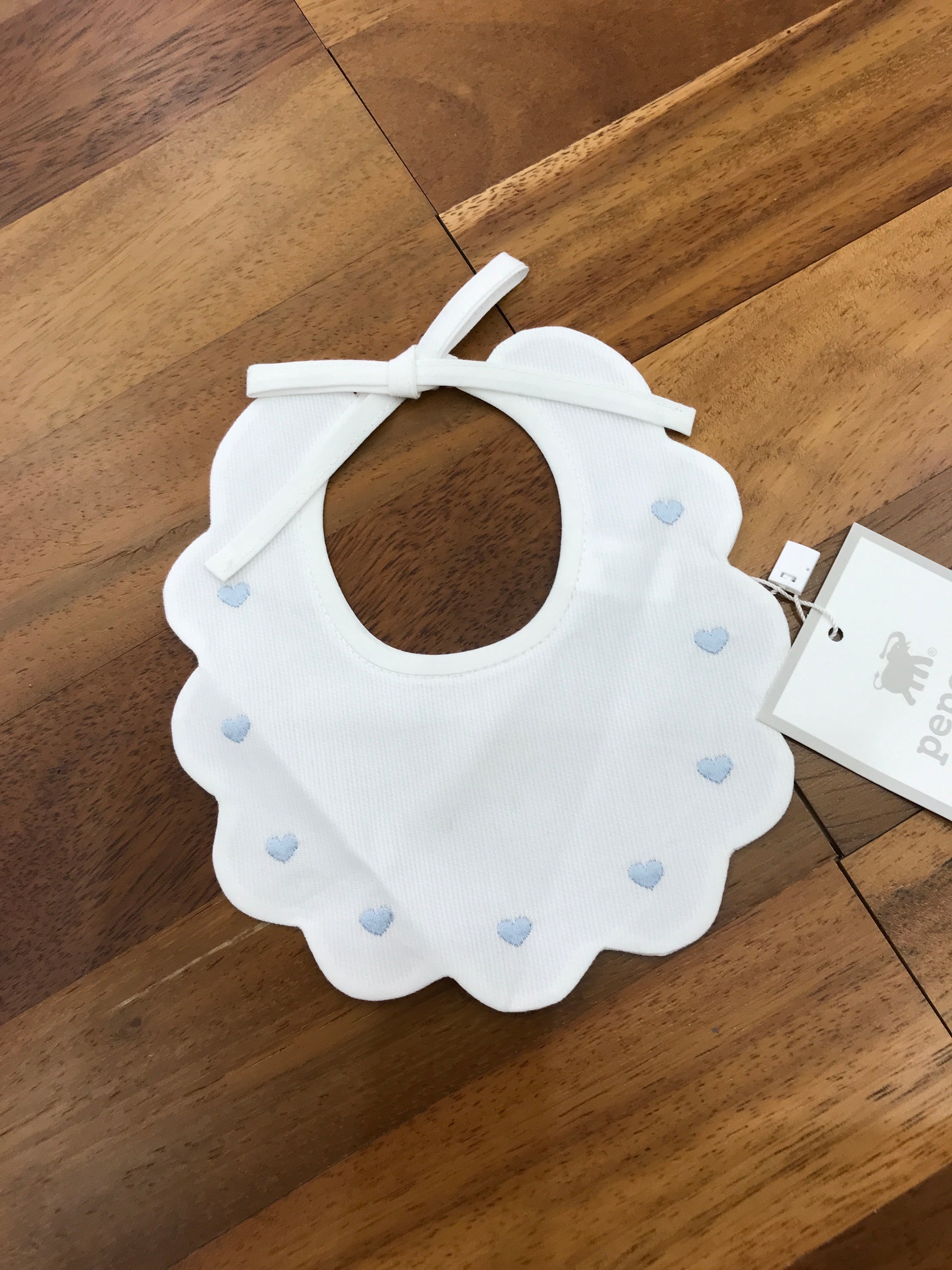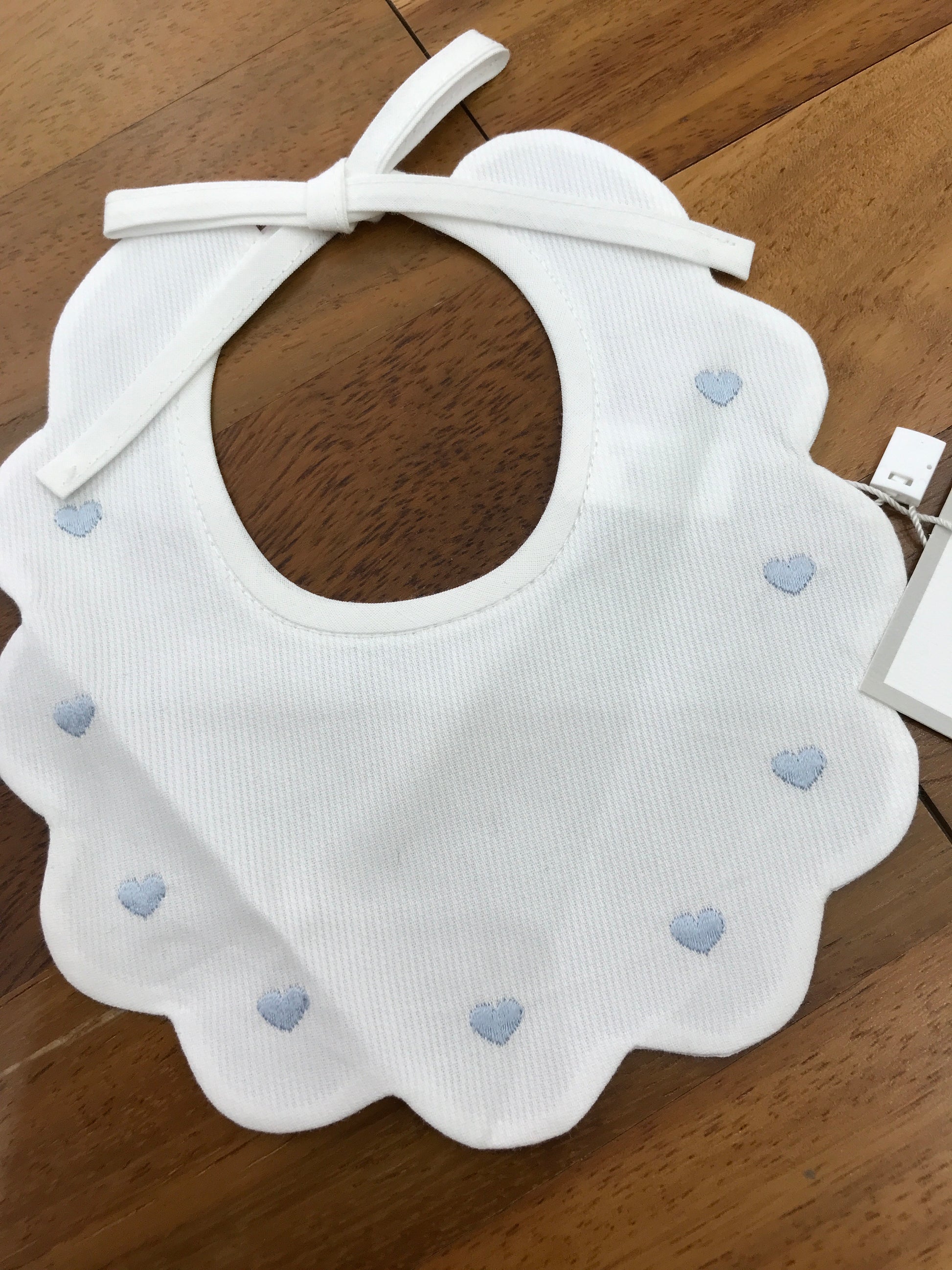 Questa bavetta presenta un raffinato bordo smerlato e si chiude con un elegante fiocchetto, che garantisce una vestibilità regolabile e confortevole. Il dettaglio distintivo sono i delicati cuoricini celesti ricamati che decorano l’intero perimetro, aggiungendo un tocco di dolcezza e stile. Perfetta per completare con classe e funzionalità il guardaroba del tuo bambino.