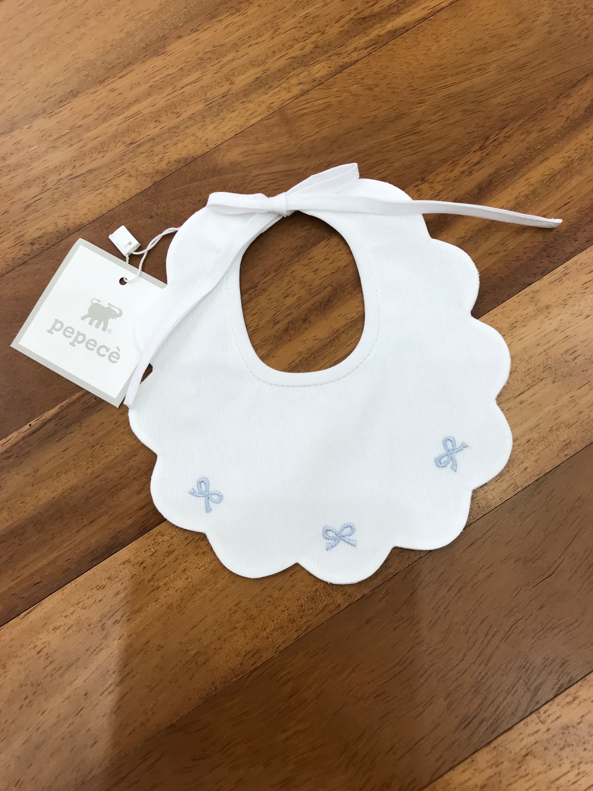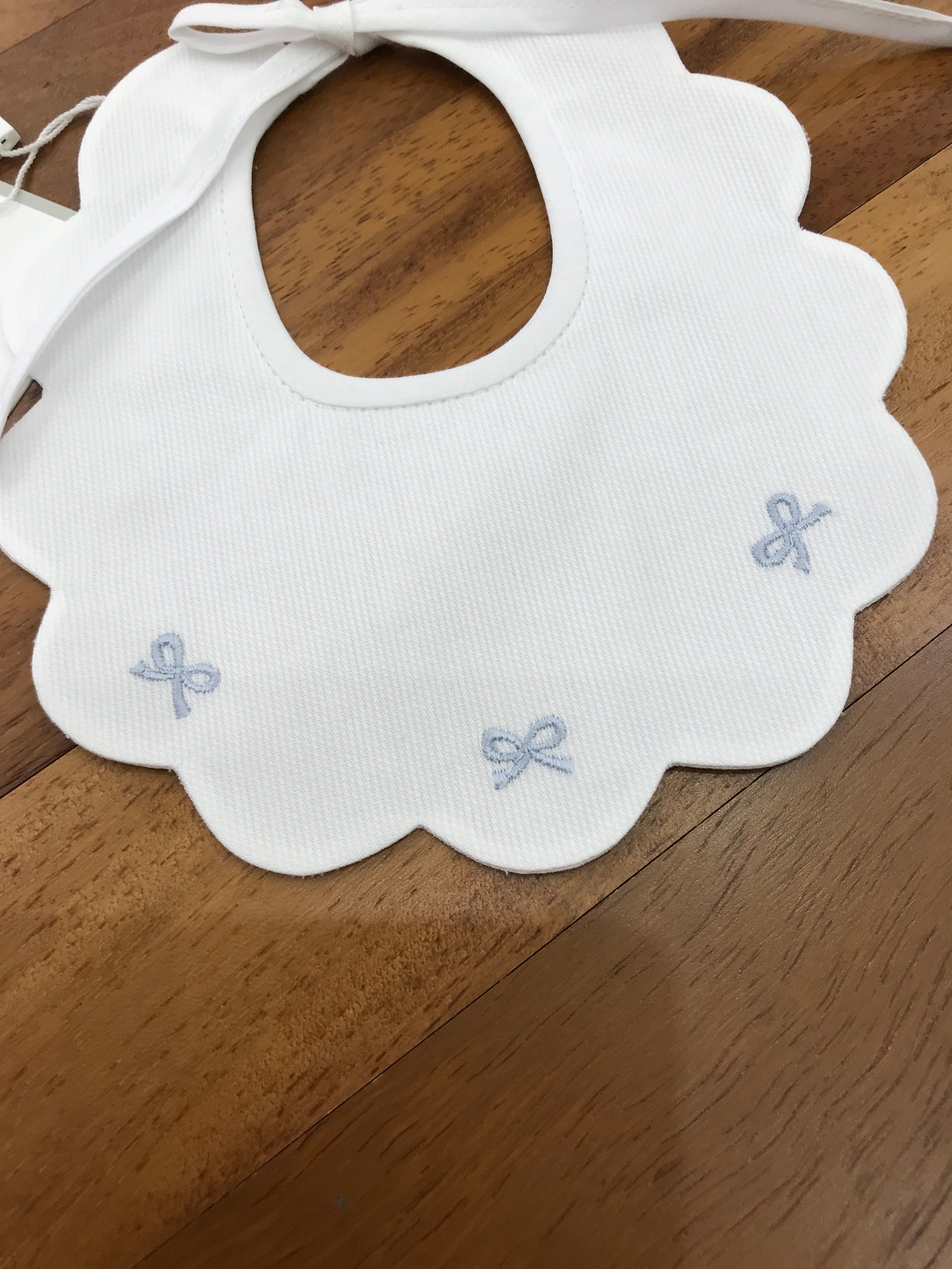 Bavetta con bordo smerlato e chiusura a fiocco, arricchita da piccoli fiocchetti ricamati in celeste come dettaglio decorativo.