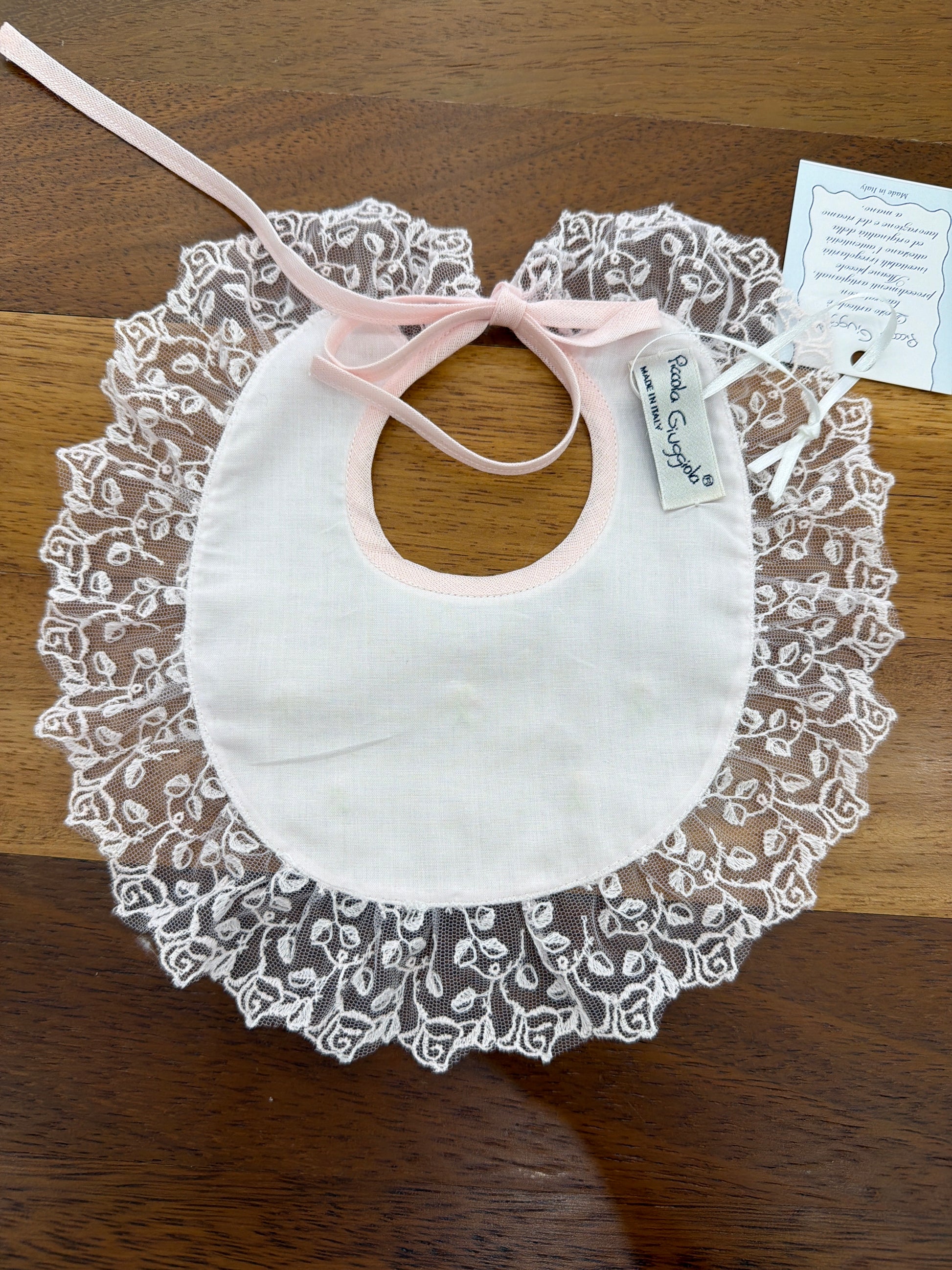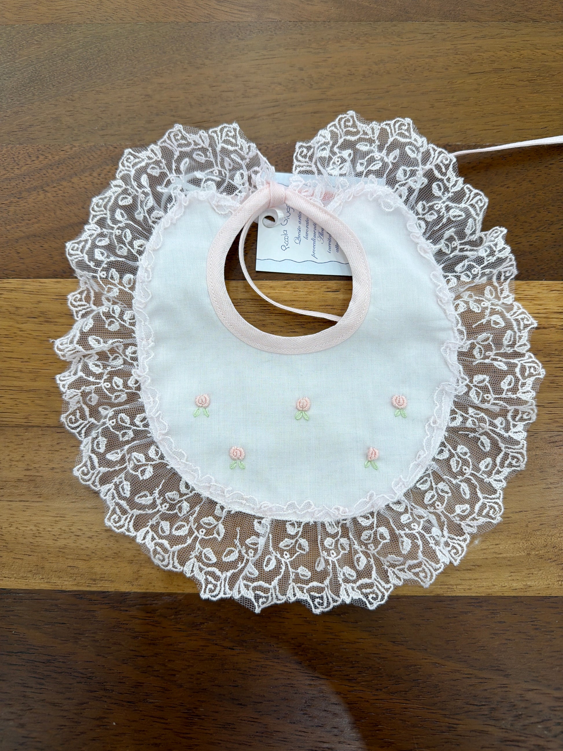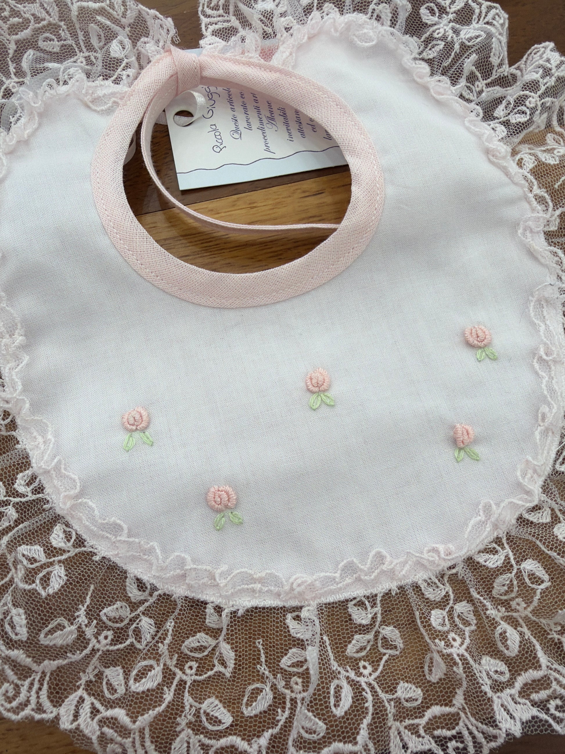 Bavetta dalla sagoma tonda, impreziosita da un delicato pizzo lungo il bordo. Al centro, sul davanti, presenta un ricamo di rose rosa, mentre sul retro è rifinita con una chiusura a fiocchetto.