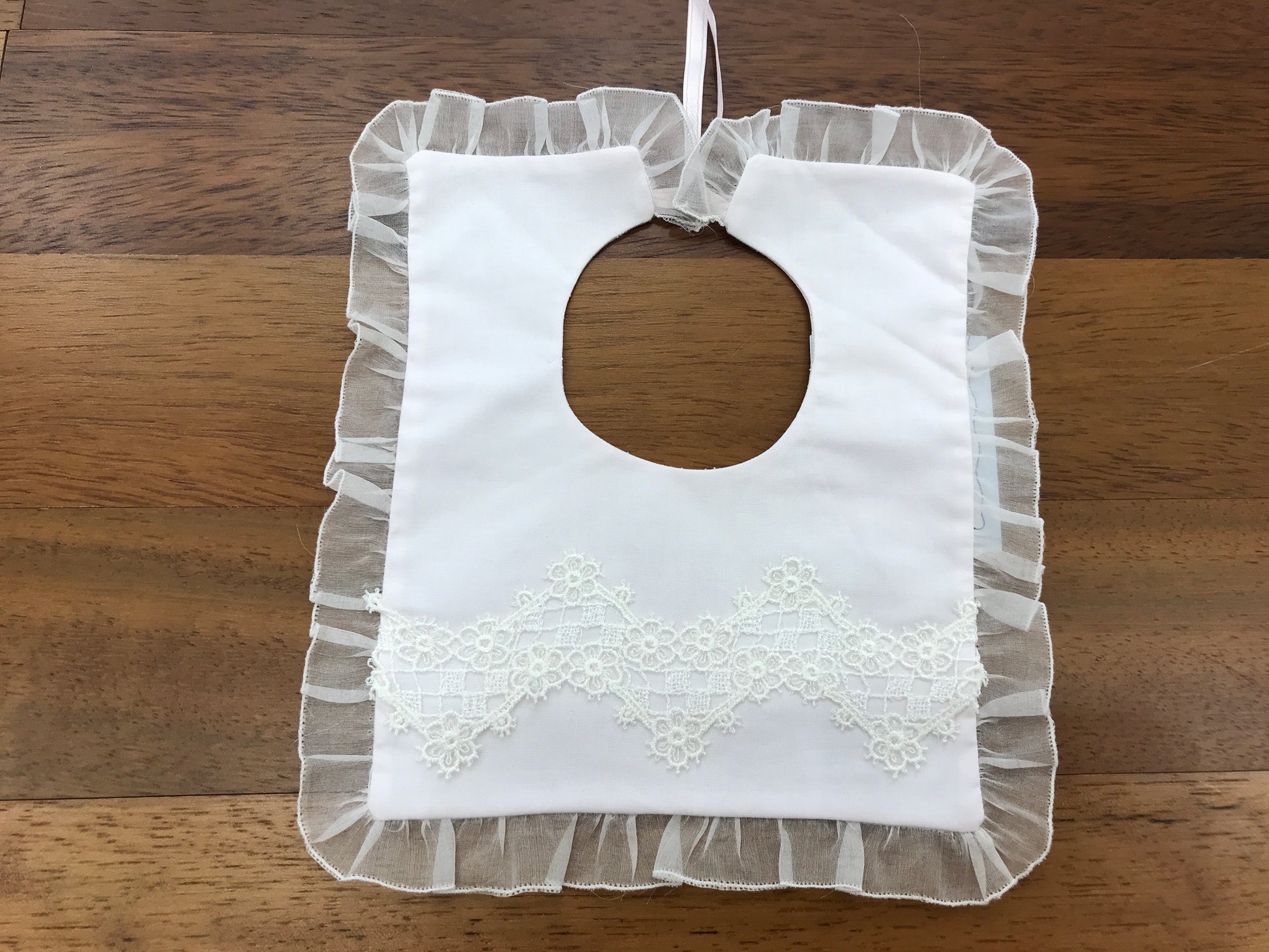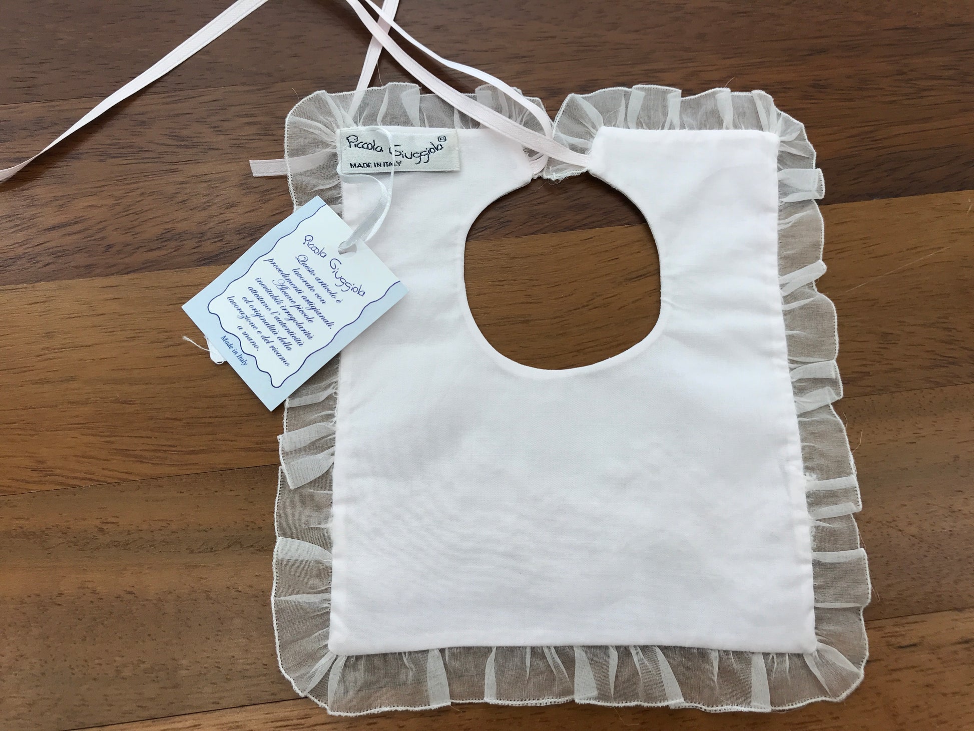 Questo bavaglino rosa di forma quadrata è impreziosito da un elegante bordo in organza che ne valorizza la delicatezza. Al centro frontale spicca un ricamo in merletto raffinato, che conferisce un tocco di classe. La chiusura è realizzata con un nastro più lungo, pensato per essere annodato a fiocco, assicurando così una vestibilità confortevole e un dettaglio estetico raffinato.