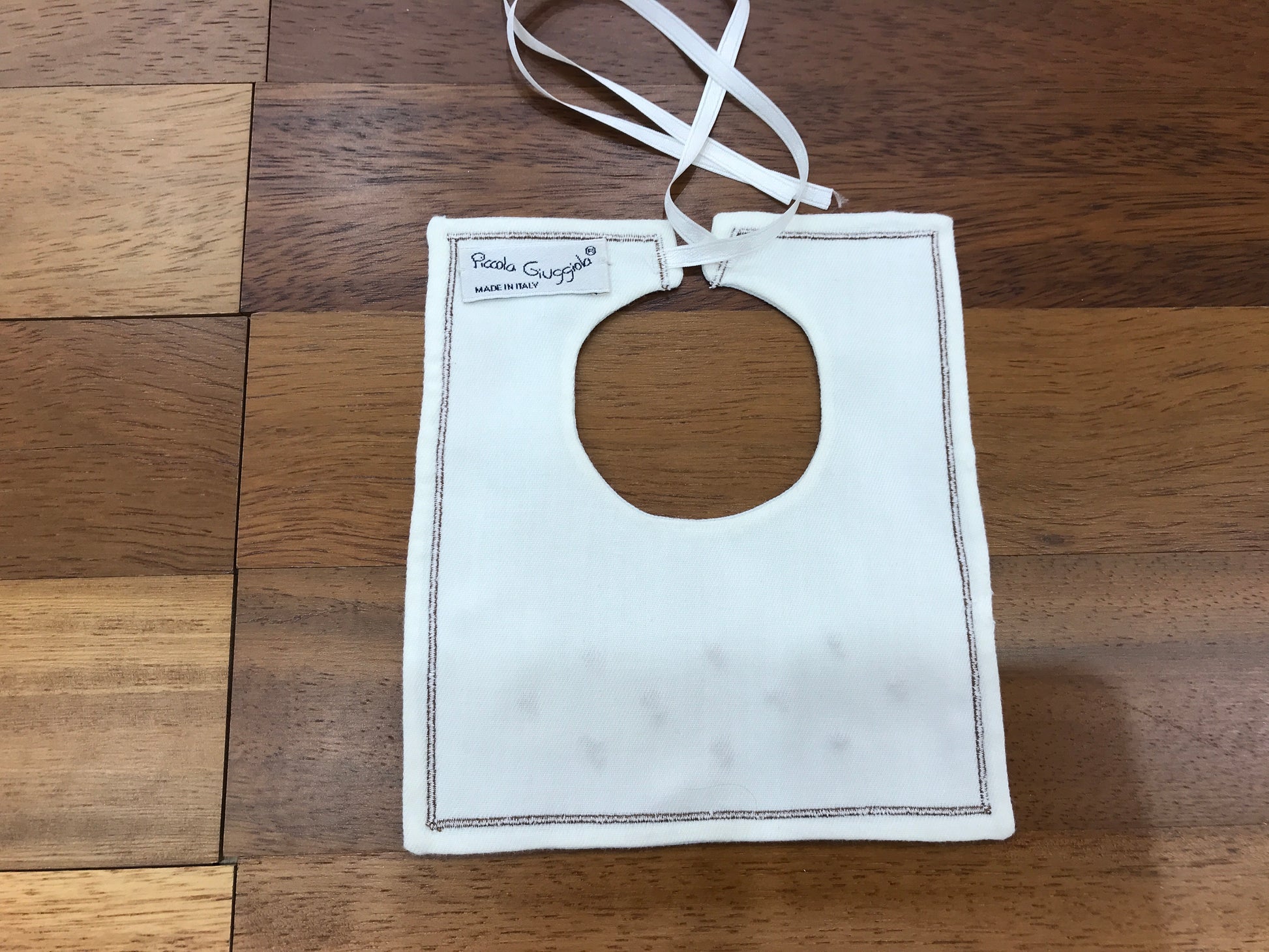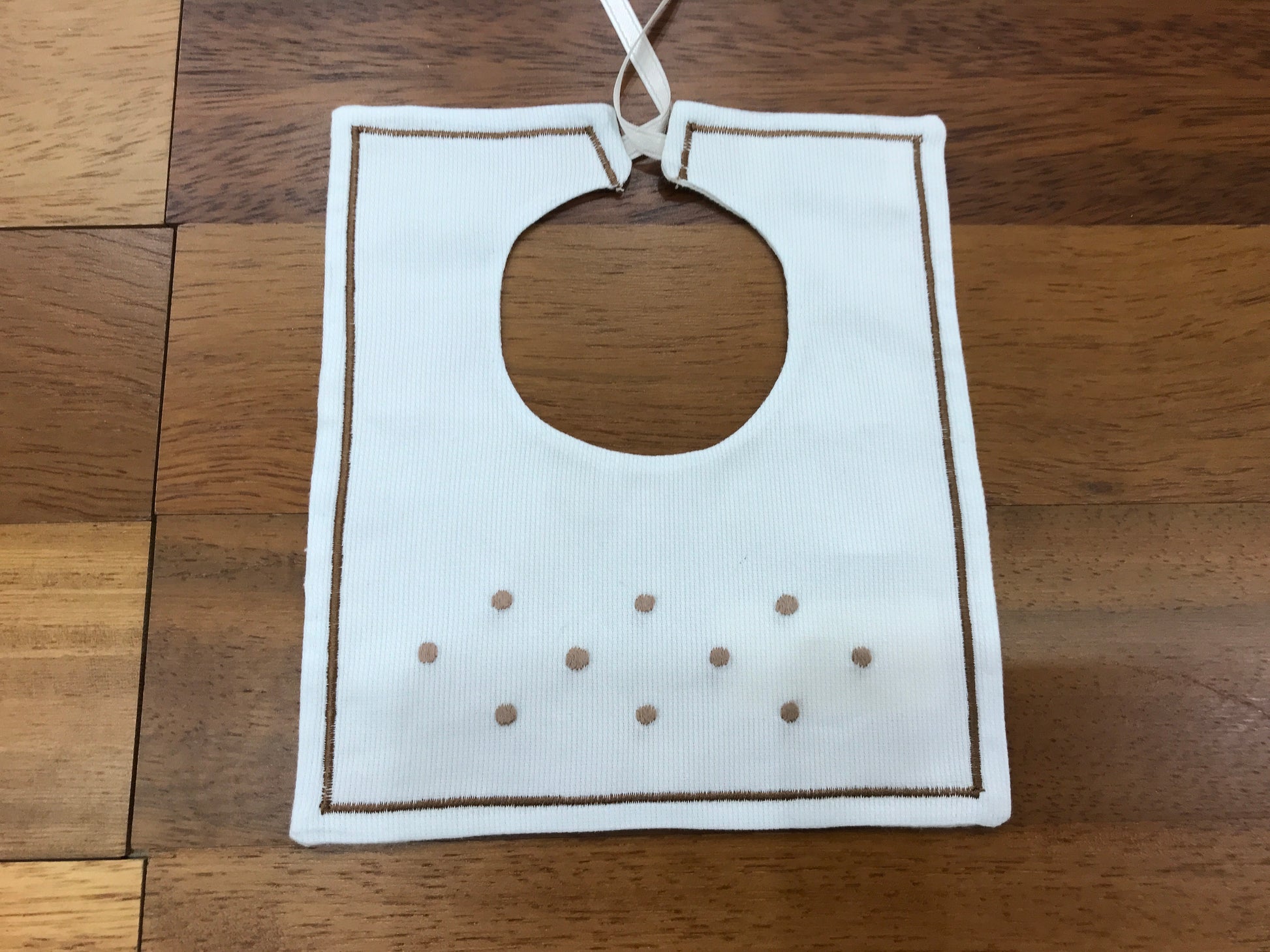 Bavaglino quadrato dal delicato colore celeste, caratterizzato da pois ricamati in marrone che aggiungono un tocco di raffinatezza. Il bordo, anch’esso marrone, è finemente rifinito e leggermente più lungo, garantendo una migliore copertura e protezione durante l’uso.
