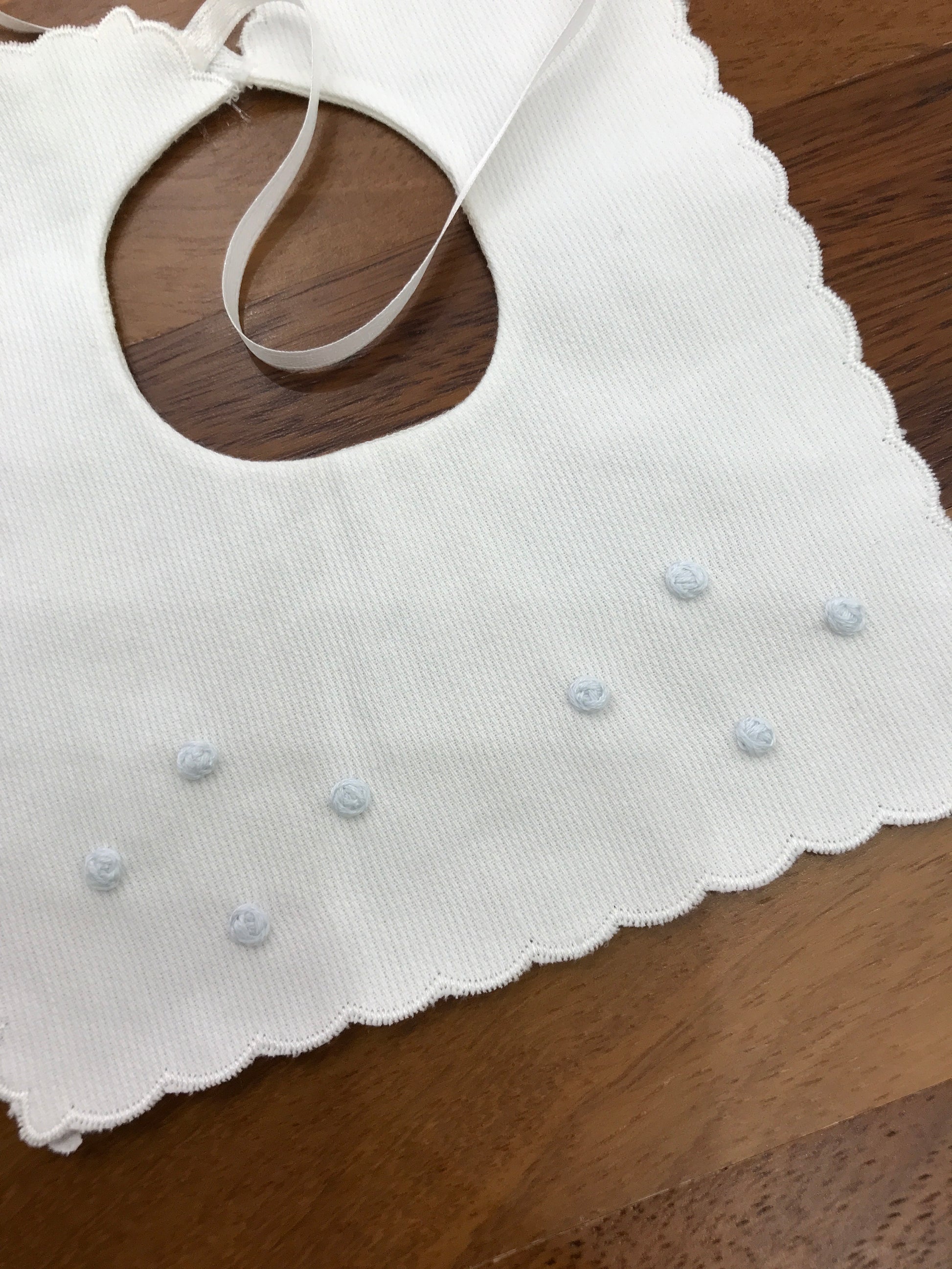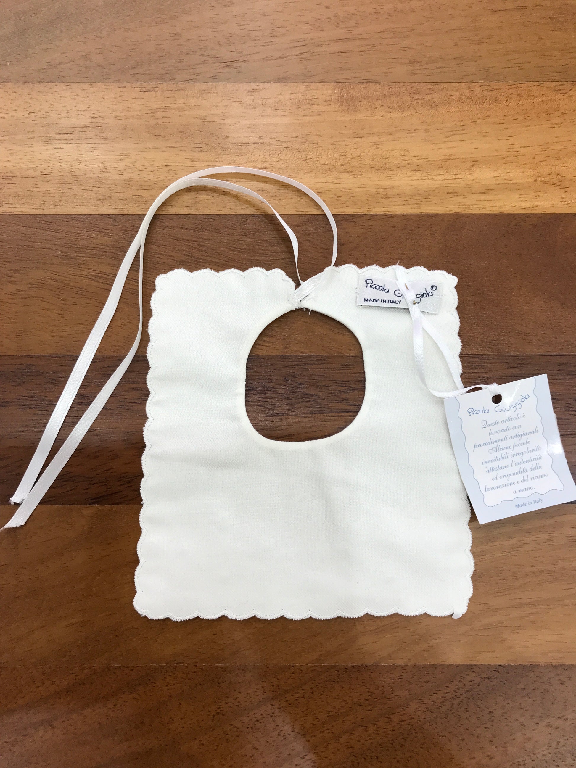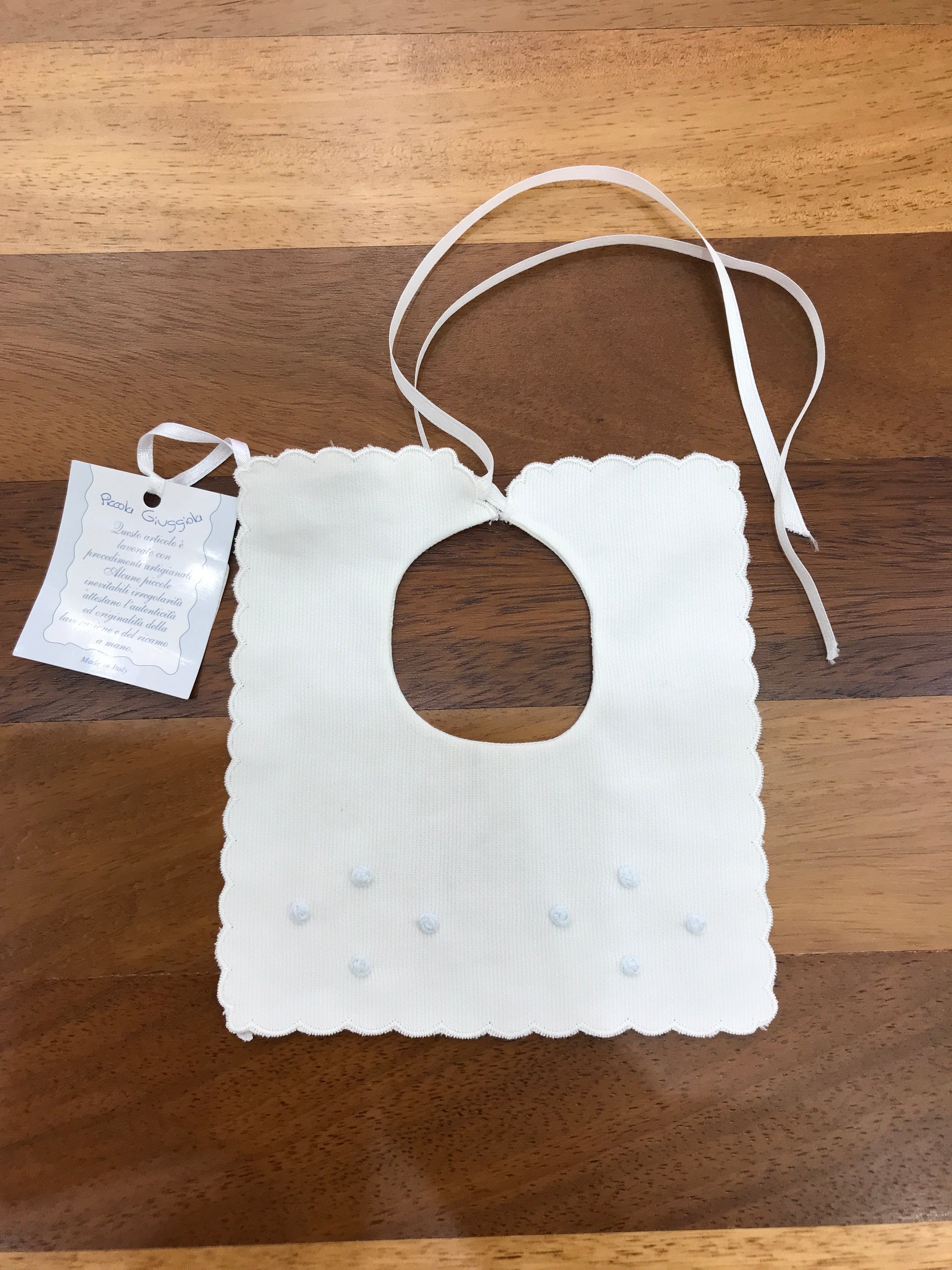 Bavaglino quadrato in cotone piquet con bordi smerlati, impreziosito da nodini ricamati a mano.