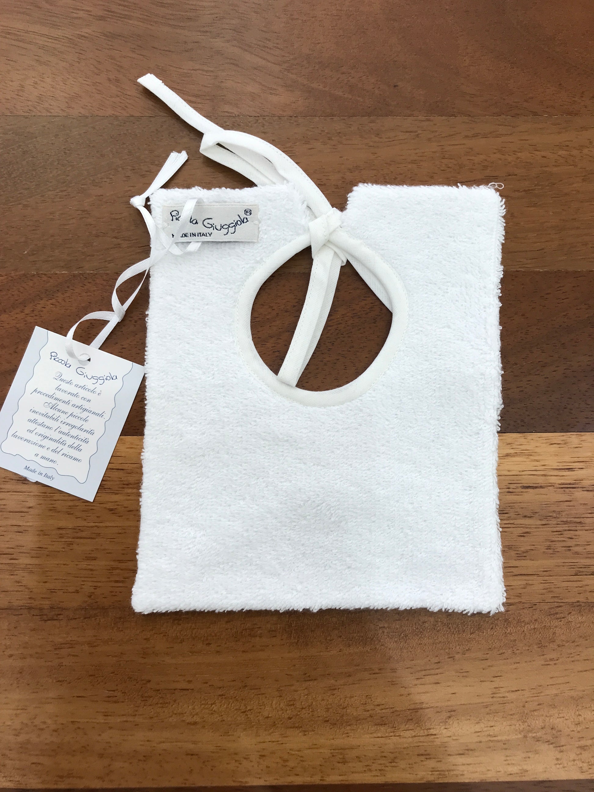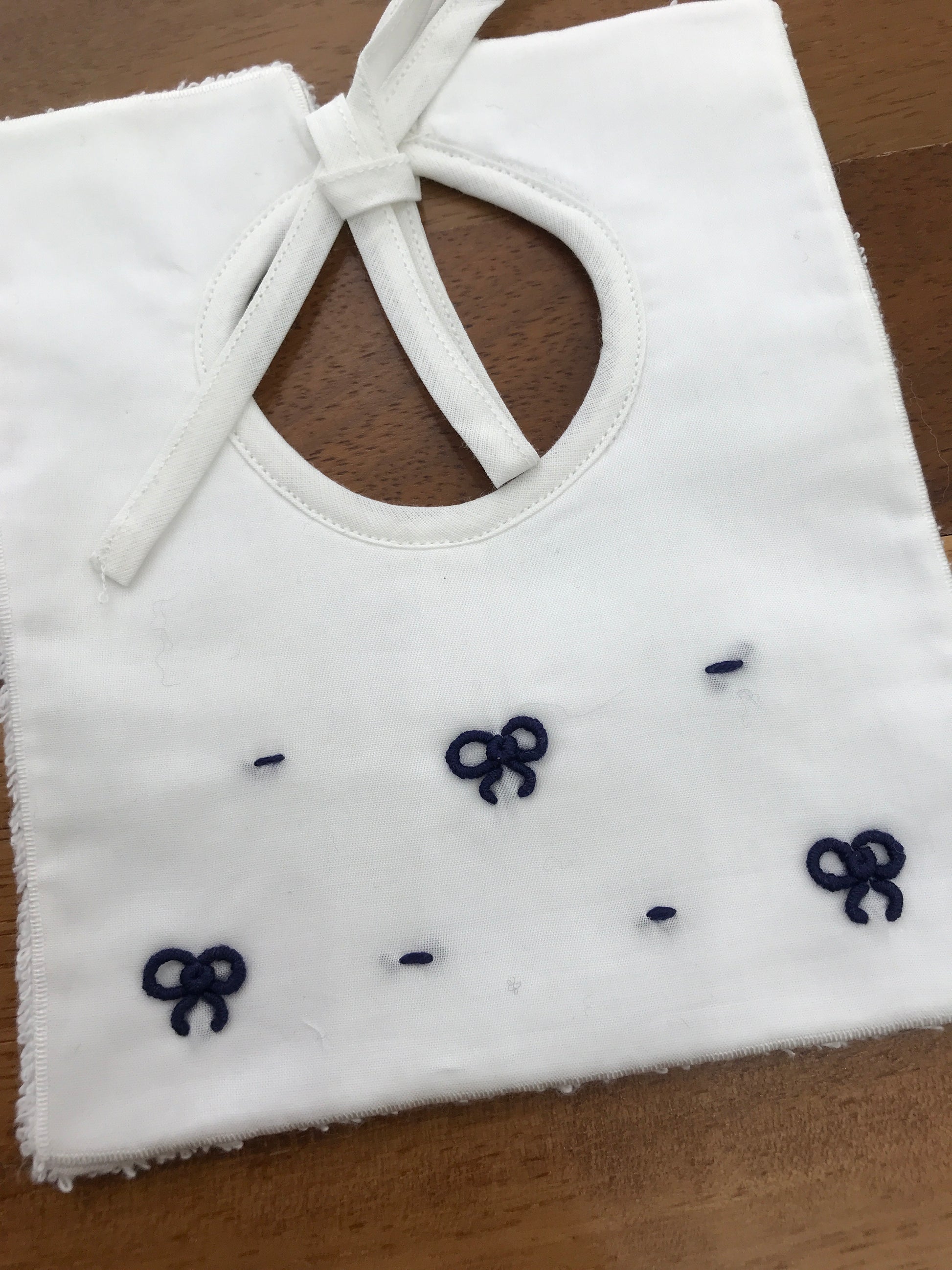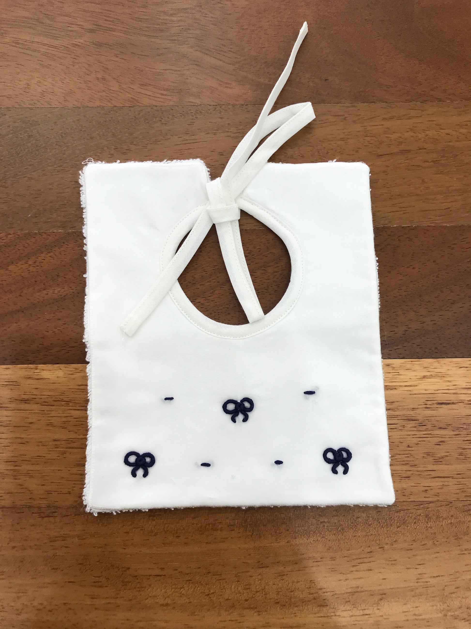 Questo bavaglino quadrato è realizzato in spugna morbida, ideale per garantire comfort e assorbenza durante i pasti. Presenta al centro eleganti fiocchetti ricamati in blu, arricchiti da un delicato motivo a pois che aggiunge un tocco di raffinatezza. La chiusura con fiocchetto non solo assicura una vestibilità sicura, ma contribuisce anche a un design curato e funzionale, perfetto per la cura quotidiana del bambino.