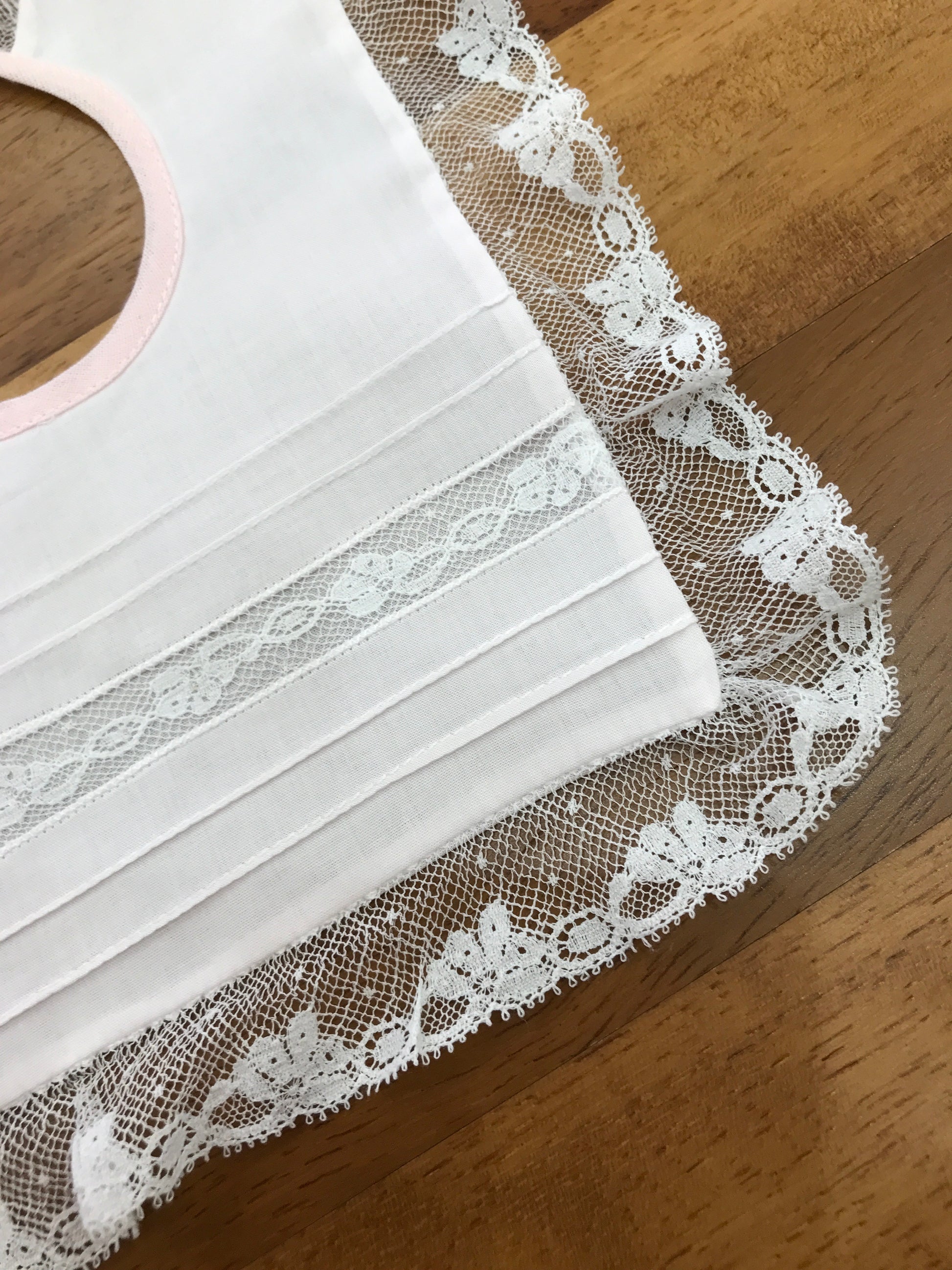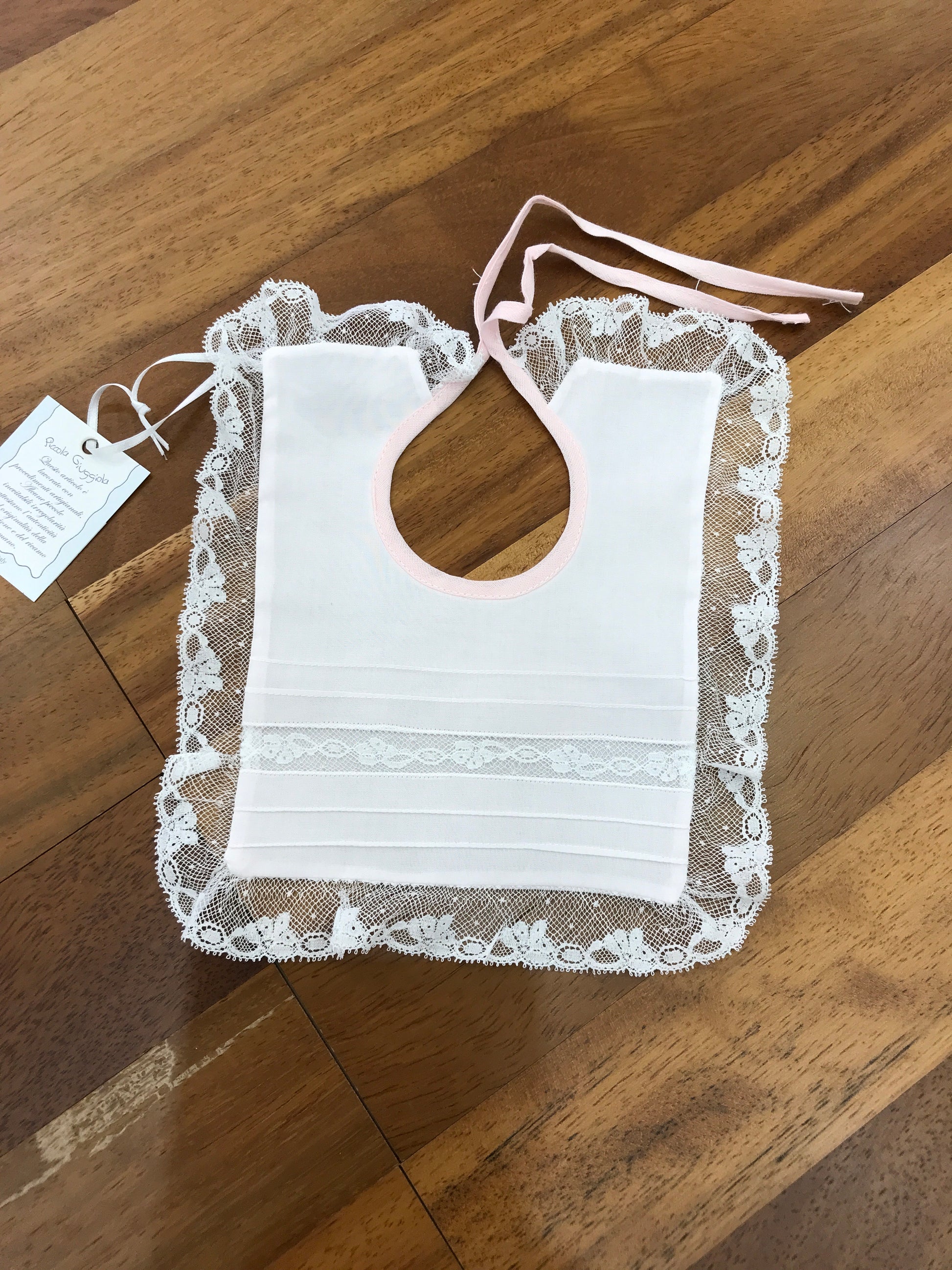 Bavetta dotata di chiusura a fiocco, arricchita da un merletto ricamato lungo tutto il bordo e decorato anche nella parte centrale portamerletto.