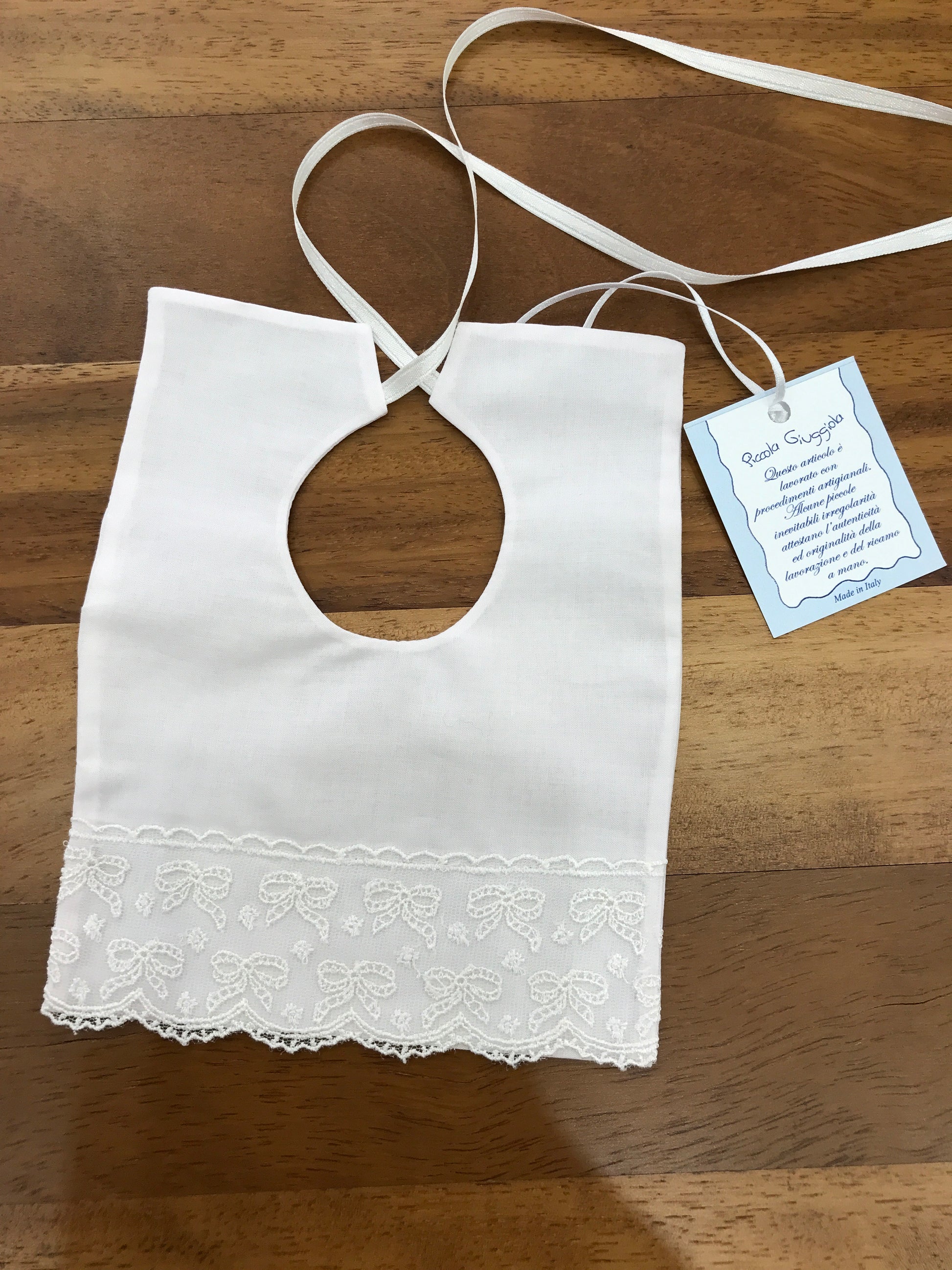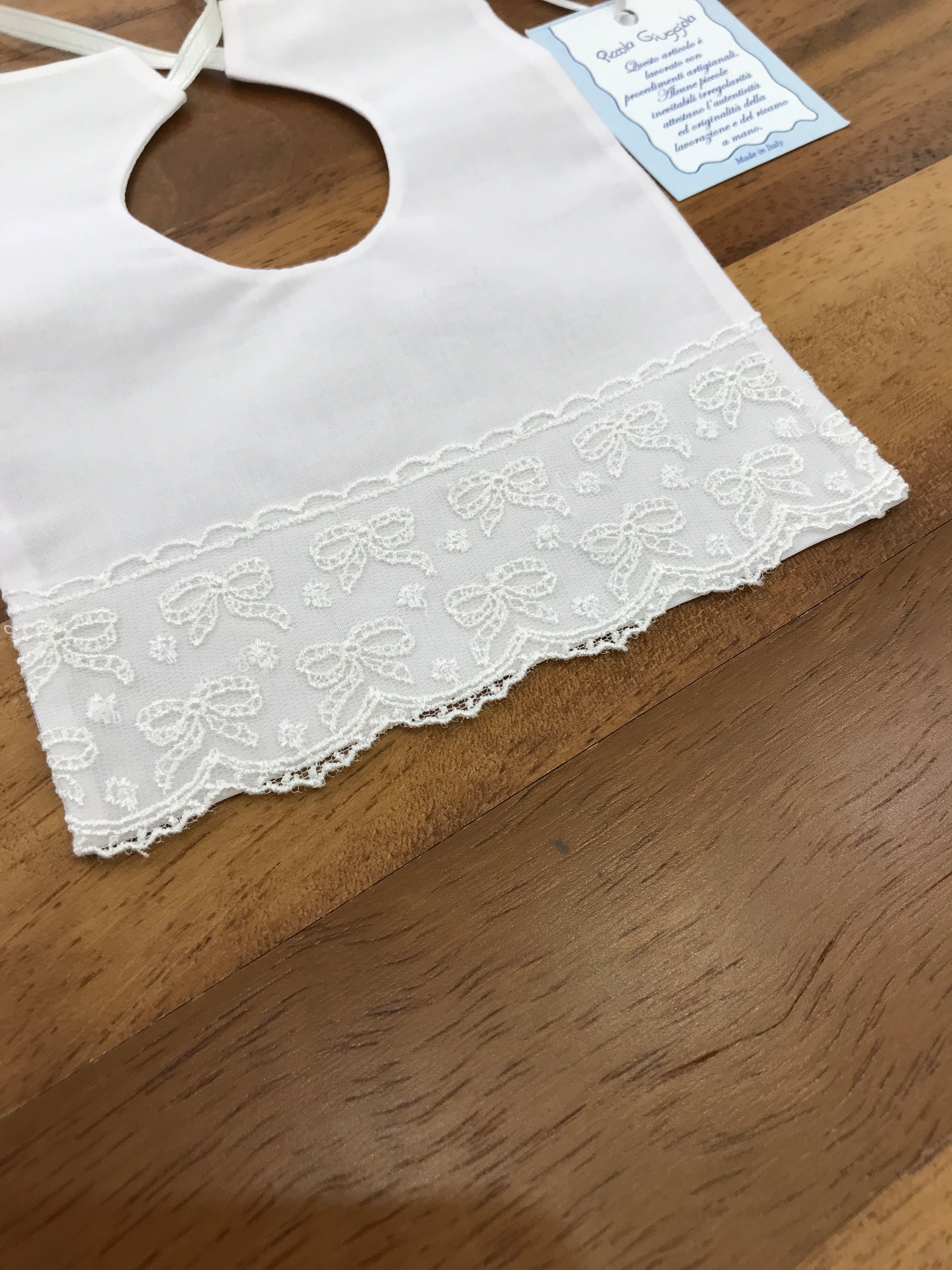 Bavetta con chiusura a fiocco, decorata con un delicato merletto ricamato sul davanti.