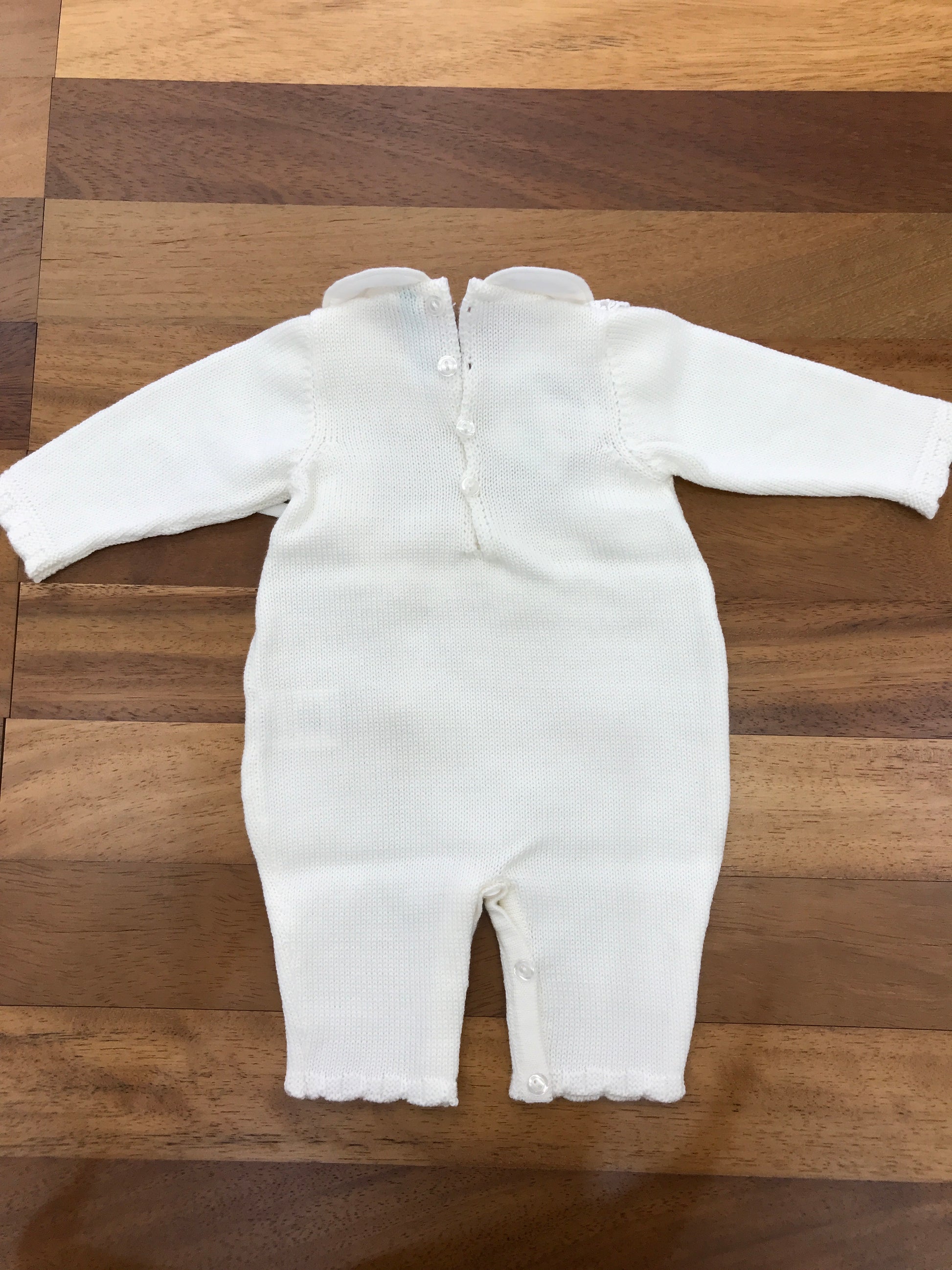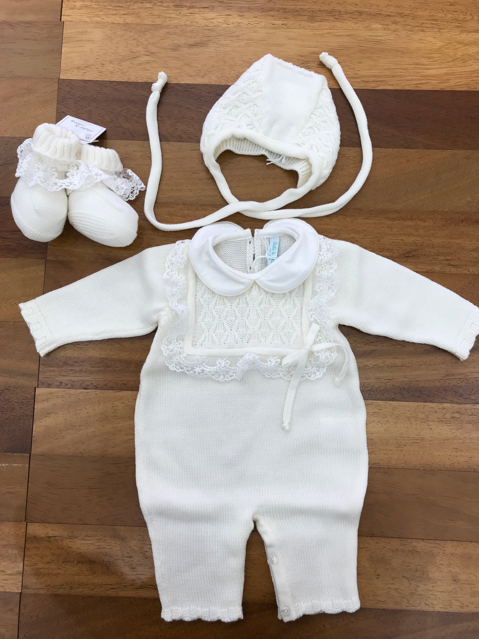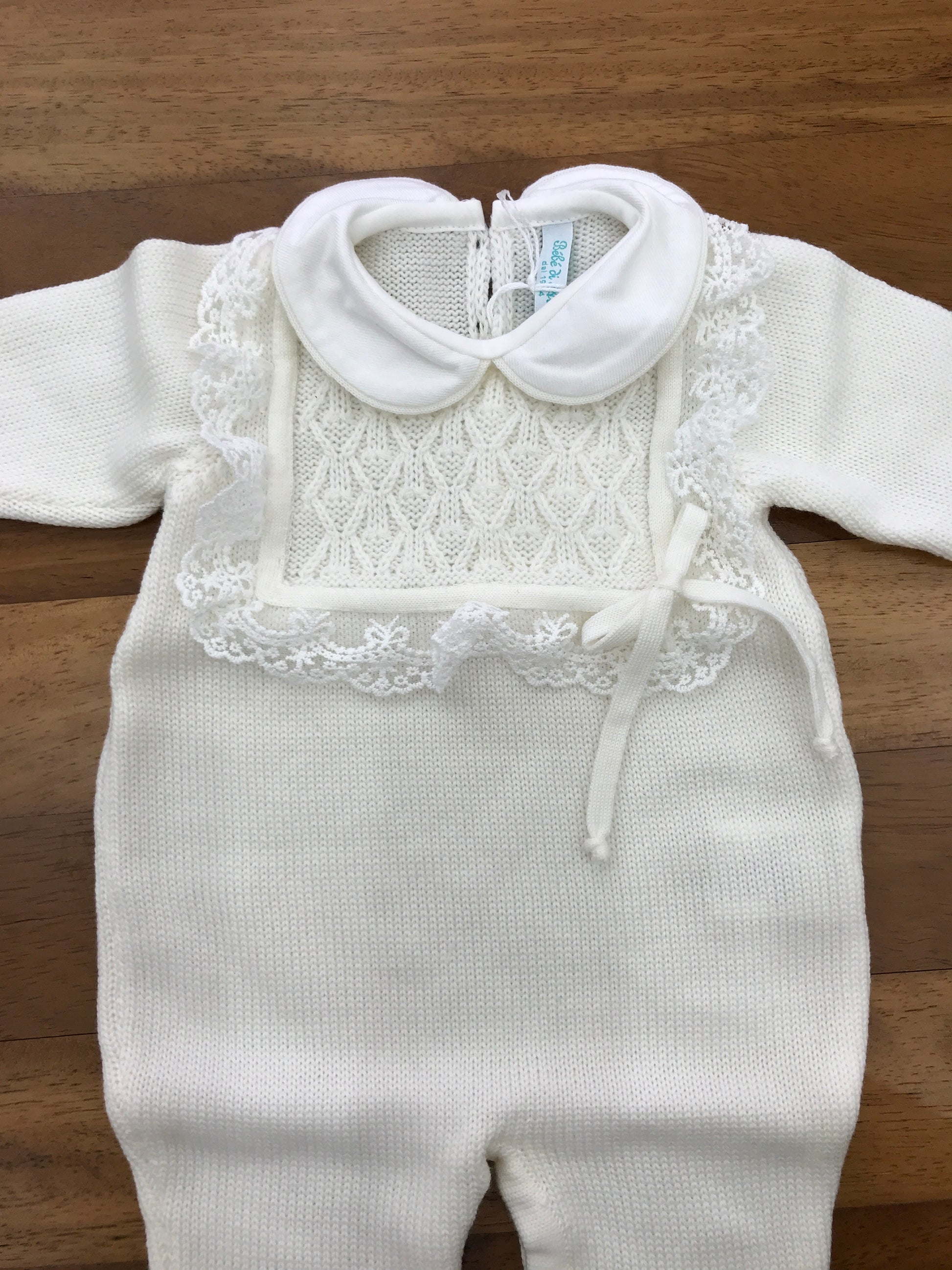 Tutina completa senza piedini, caratterizzata da un raffinato intreccio frontale e da un delicato pizzo a cornice che crea un effetto bavettone, completata da un colletto tondo in morbido cotone.
