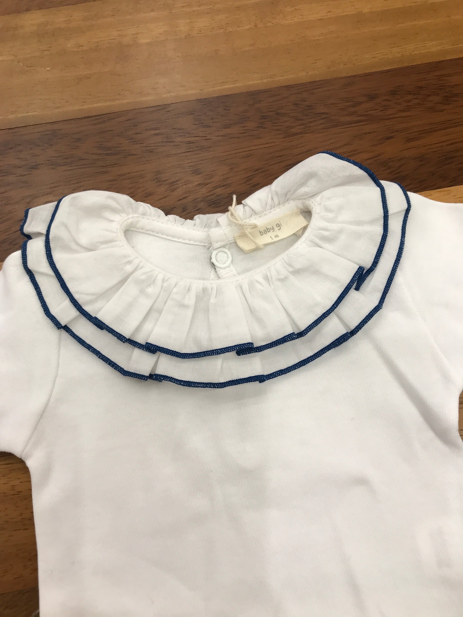 Body realizzato in caldo cotone, caratterizzato da un elegante colletto con volant e da un bordo in tonalità blu che ne valorizza il design. Questa combinazione assicura al bambino comfort e una raffinata vestibilità, ideale per le stagioni più fresche.