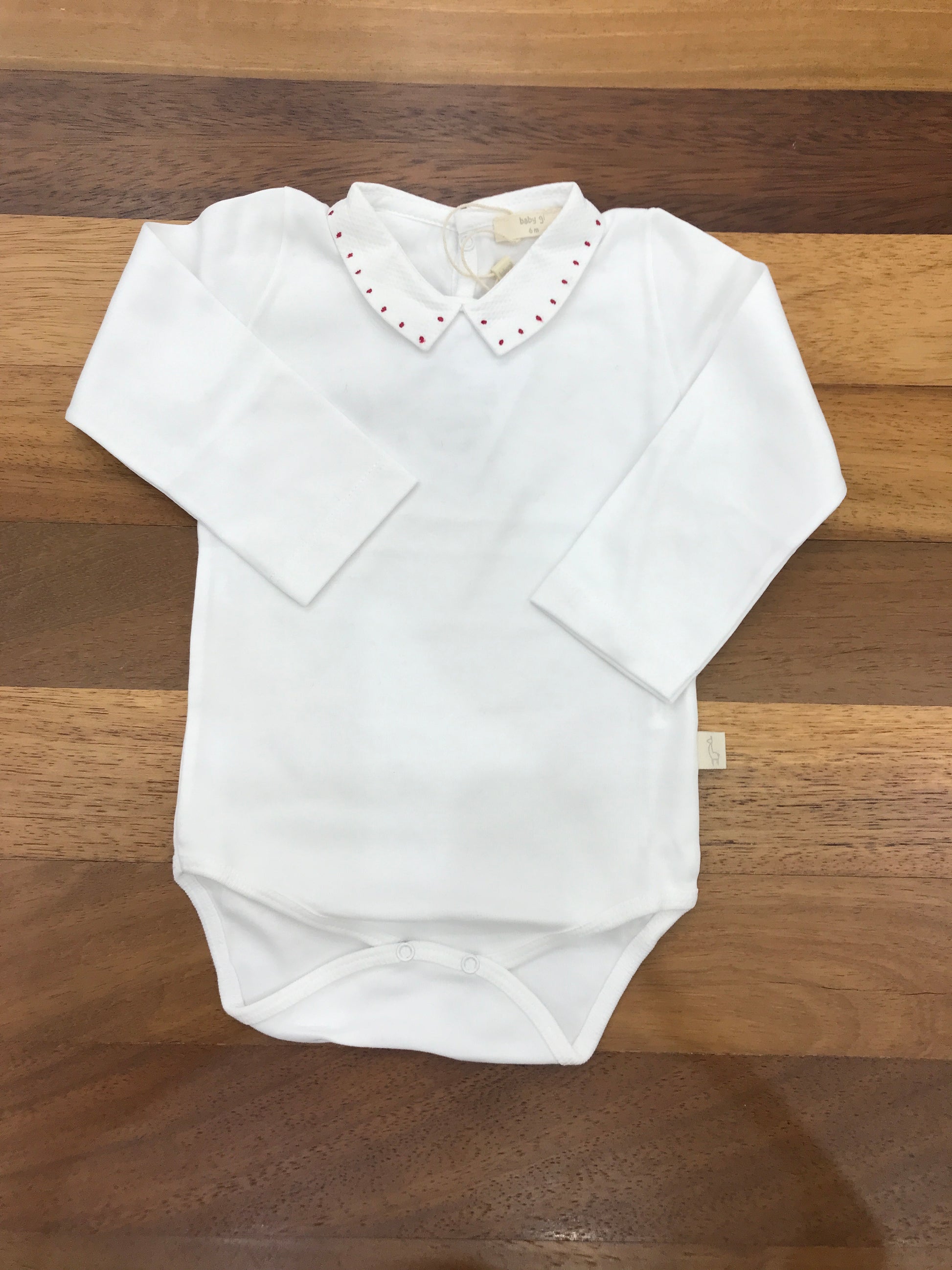 Body in caldo cotone con maniche lunghe, dotato di colletto a punta e decorato da piccoli pois rossi ricamati sul colletto.