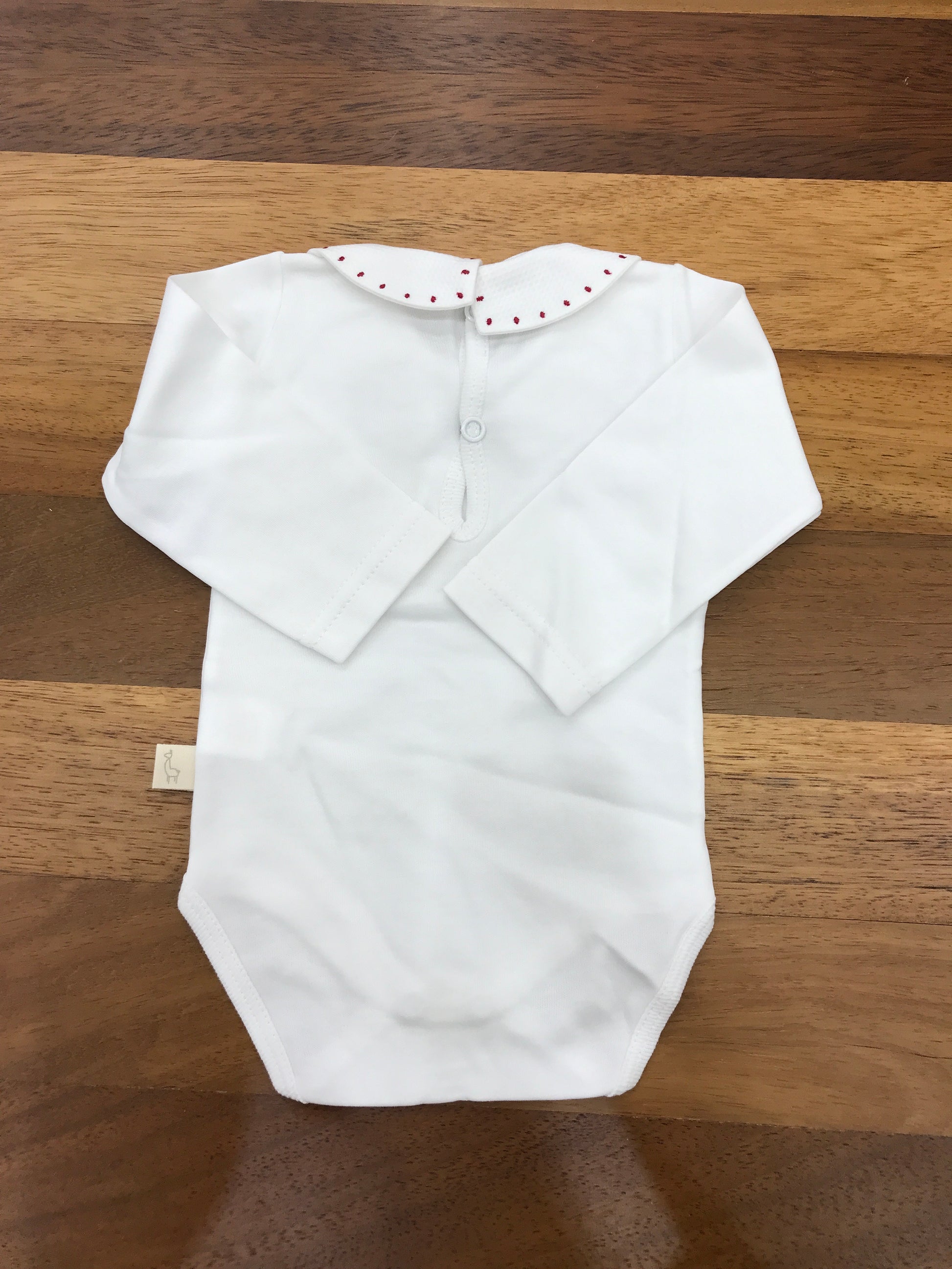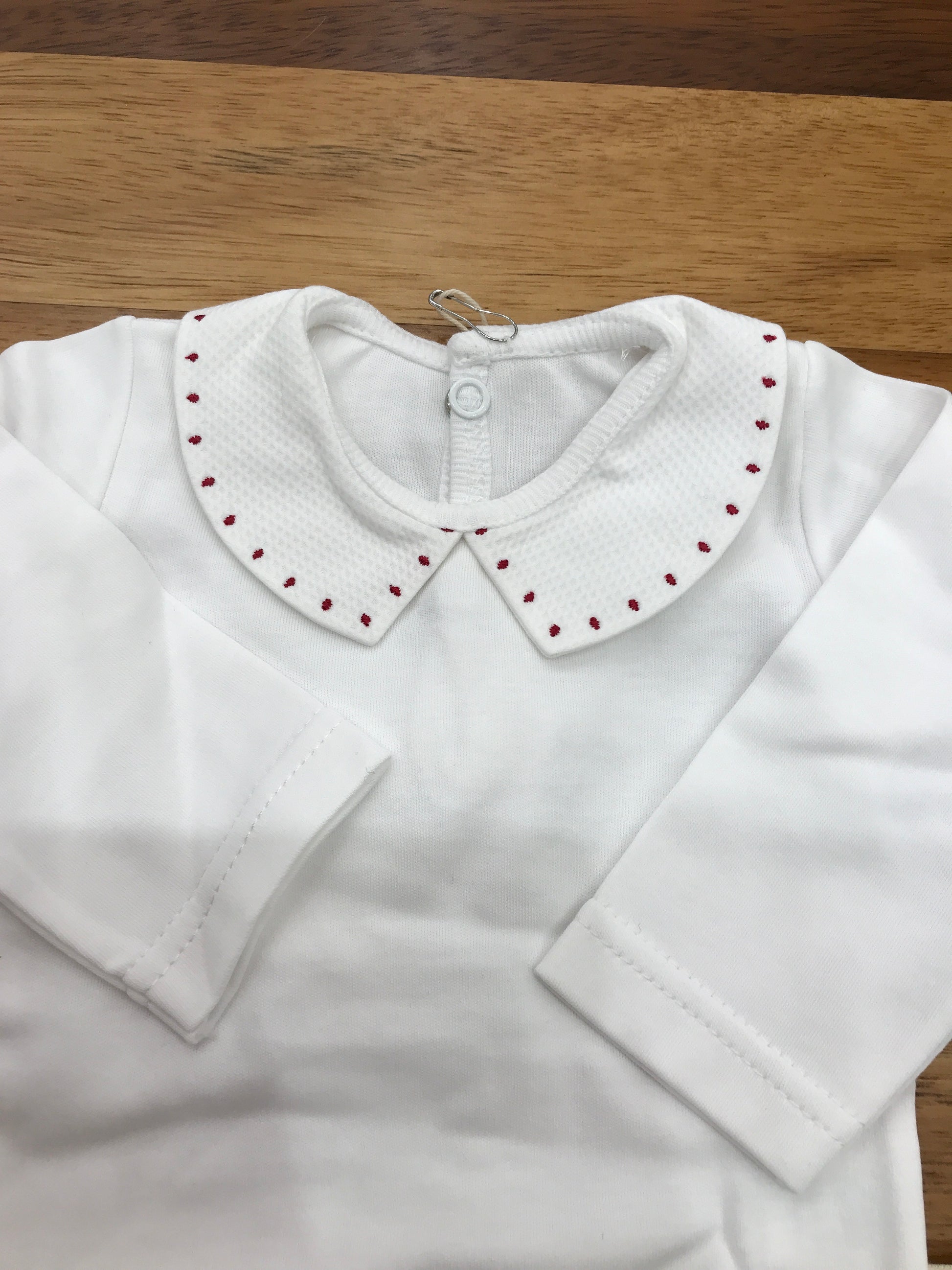 Body in caldo cotone bianco, a maniche lunghe, caratterizzato da un elegante colletto in rosso, per un tocco di raffinatezza e comfort aggiuntivo.