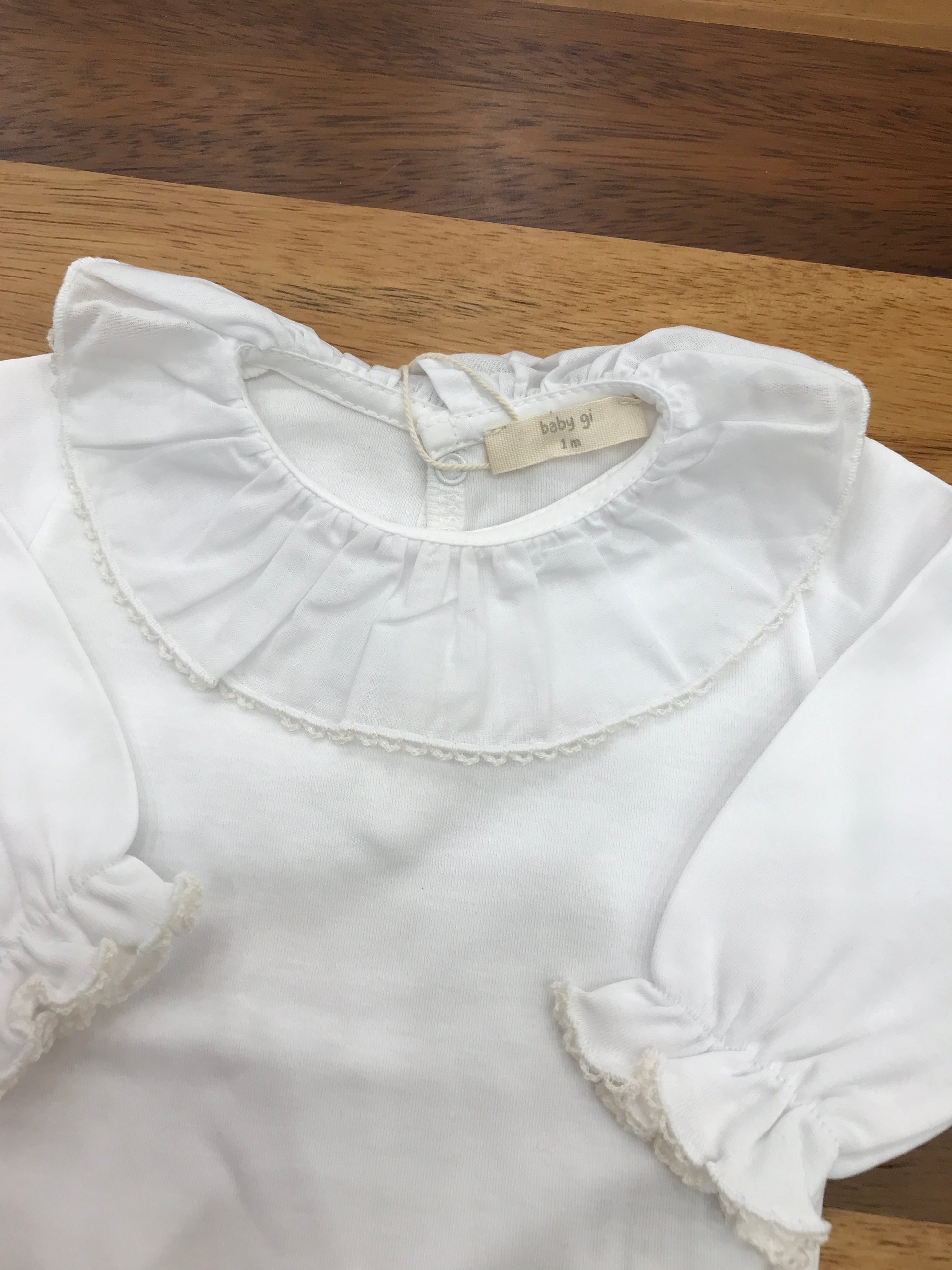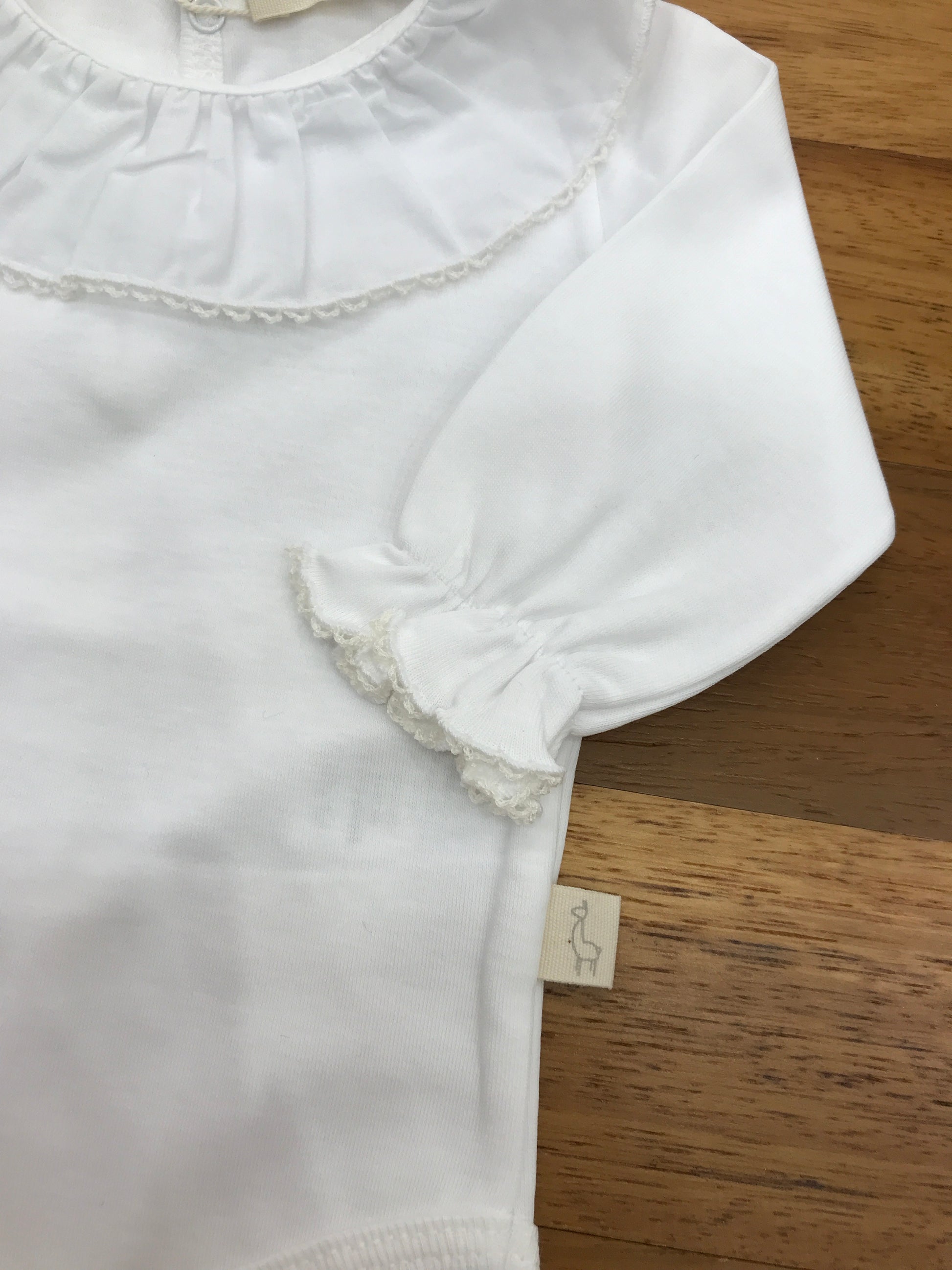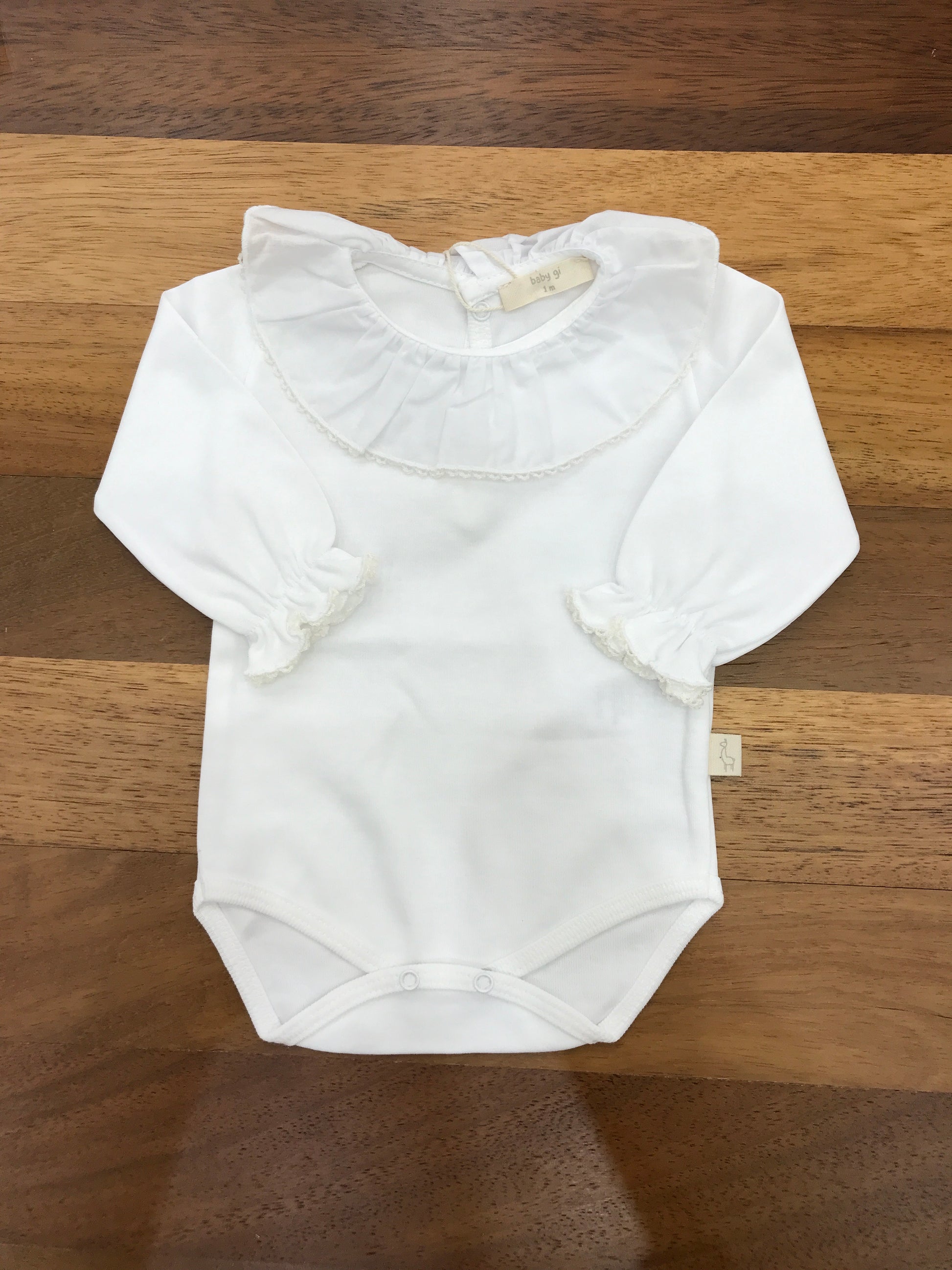 Body in caldo cotone bianco, a maniche lunghe, caratterizzato da un elegante colletto, con volant, per un tocco di raffinatezza e comfort aggiuntivo.