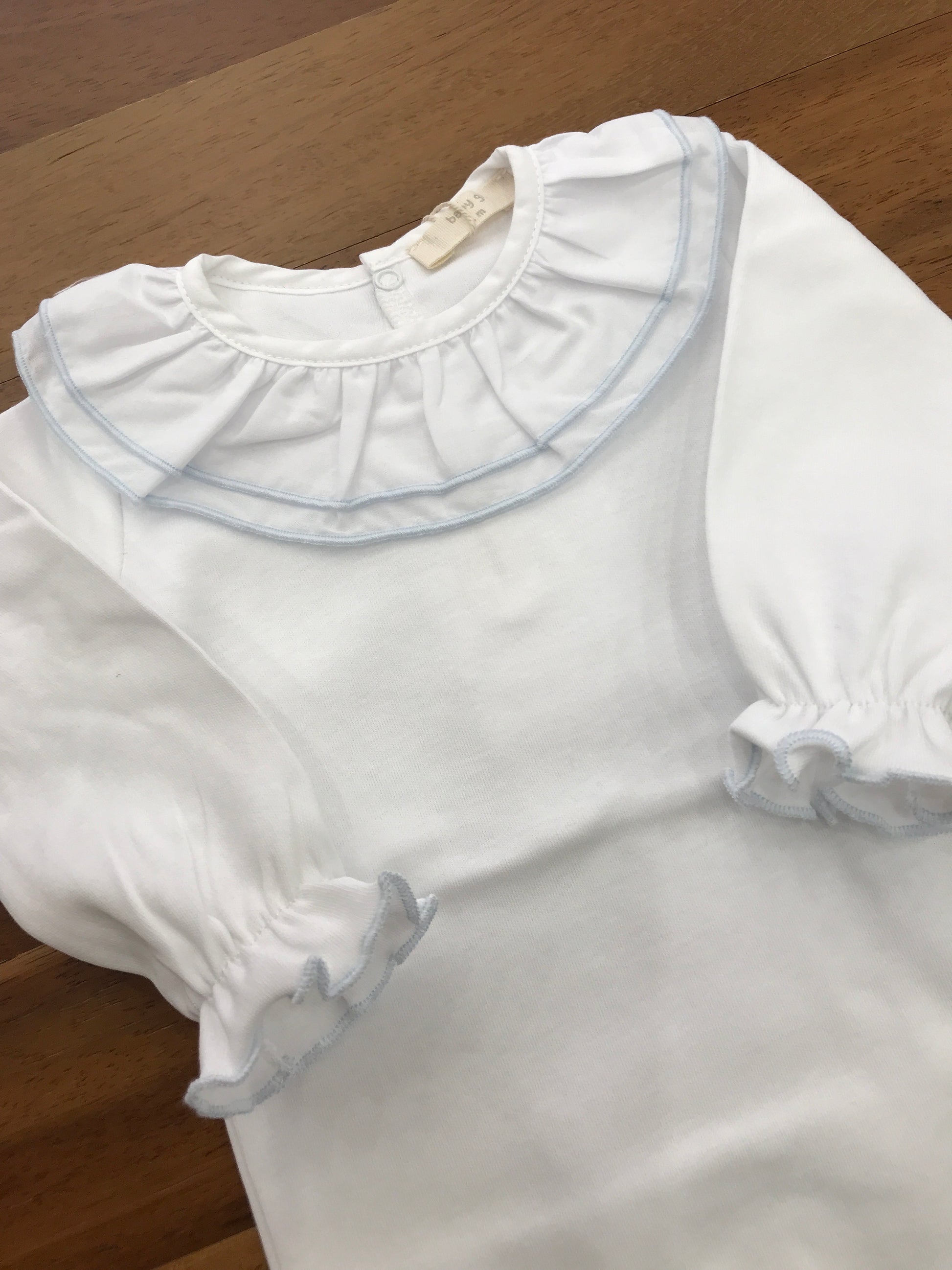 Body a maniche lunghe con volant e elastico sulle maniche, decorato con ricami celesti. Presenta un colletto con volant e dettagli ricamati in celeste.