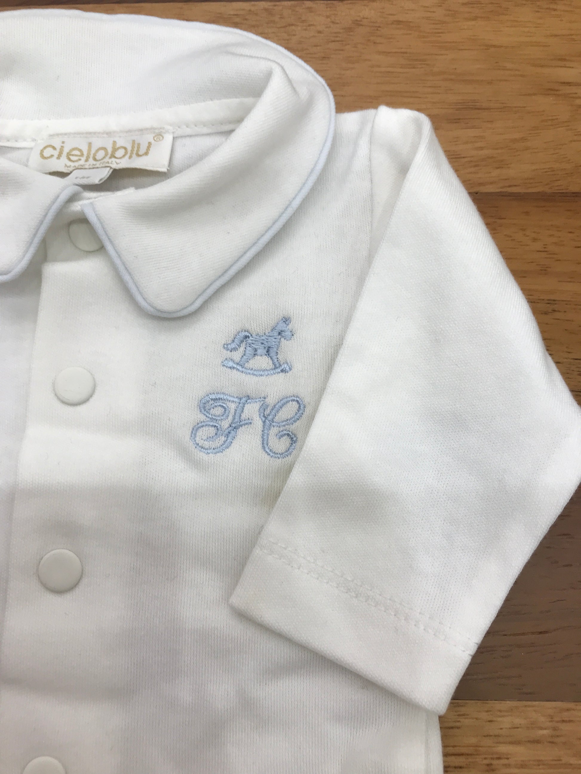 Body in caldo cotone a maniche lunghe, dotato di colletto e piccoli bottoncini frontali. Sul lato è ricamato un cavalluccio a dondolo azzurro, aggiungendo un dettaglio delicato e raffinato.